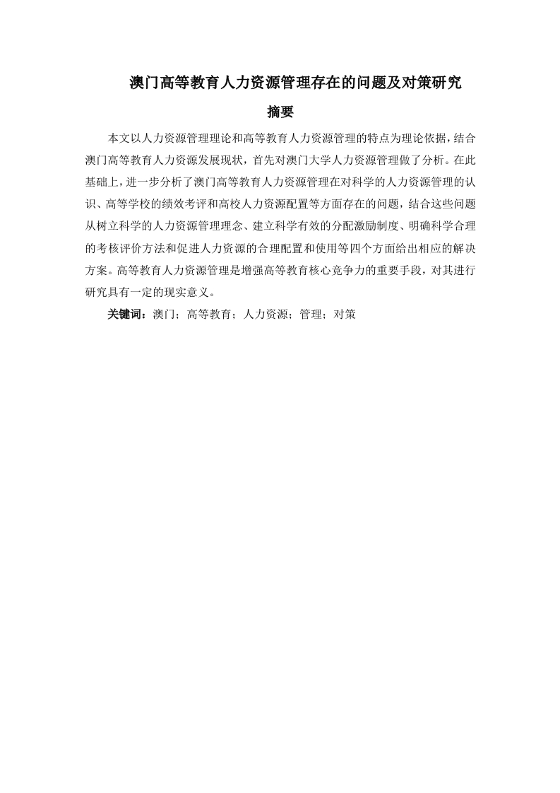 澳门高等教育人力资源管理存在的问题及对策研究摘要本文以人力资源管理理论和高等教育人力资源管理的特点为理论依据,结合澳门高等教育人力资源发展现状,首先对澳门大学人力资源管理做了分析。在此基础上,进一步分析了澳门高等教育人力资源管理在对科学的人力资源管理的认识、高等学校的绩效考评和高校人力资源配置等方面存在的问题,结合这些问题从树立科学的人力资源管理理念、建立科学有效的分配激励制度、明确科学合理的考核评价方法和促进人力资源的合理配置和使用等四个方面给出相应的解决方案。高等教育人力资源管理是增强高等教育核心竞争力的重要手段,对其进行研究具有一定的现实意义。AbstractThis paper to human resources management theory and higher education of themanagement of human resources characteristics as the theory basis,combining thecurrent situation of human resource development of higher education,the universityof macau first in the human resources management are analyzed.Based on this,andfurther analyzed the Macao of human resource management in higher education ofscientific understanding of the human resource management,higher school'sperformance evaluation and university human resources deployment problems withthese problems from setting up scientific management concept of human resources,establishing scientific and effective distribution incentive system,and clearlyscientific and reasonable evaluation method and promote the rational allocation ofhuman resources and use and so on four aspects gives corresponding solutions.Higher education human resources management of higher education is to enhance thecore competitiveness of the important means,the study has certain practicalsignificance.Keywords:Macao;Higher education;Human resources;Management;countermeasures目录摘要目录一、高等教育人力资源管理的内涵…(一)高等教育人力资源管理的涵义(二)高等教育人力资源管理的特点二、澳门高等教育人力资源发展现状(一)澳门高等教育发展现状…2(二)澳门高等教育人力资源发展现状3三、澳门大学人力资源管理分析5(二)澳门大学人力资源管理现状5四、澳门高等教育人力资源管理存在的问题…6(一)对科学的人力资源管理缺乏正确的认识.6(二)高等学校的绩效考评标准不清(三)人力资源配置不合理五、澳门高等教育人力资源管理发展建议7(一)树立科学的人力资源管理理念(二)科学合理地做好高校人力资源管理的规划(三)建立科学有效的分配激励制度.8(四)建立和完善人才引进机制,8(五)明确科学合理的考核评价方法,9(六)促进人力资源的合理配置和使用9六、总结…参考文献…致谢…