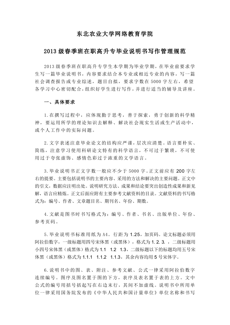 东北农业大学网络教育学院2013级春季班在职高升专毕业说明书写作管理规范2013级春季班在职高升专学生本学期为毕业学期,在毕业前要求学生写一篇毕业说明书,内容要求结合本专业或相近专业的内容,写一篇社会调查报告或专业综述,题目自拟,要求字数在5000字左右,希望各学习中心密切配合,组织好学生进行写作,并进行适当的辅导及讲座。一、具体要求1.在撰写过程中,应体现勤于思考,善于探索,勇于创新的科学精神,要运用所学的理论知识去解释、解决社会现实生活或生产活动中,或个人工作中的实际问题。2.文字表述注意毕业论文的结构应严谨,层次应清楚。语言要朴实、简练,注意学习使用科研论文特有的科学语言,不可过于繁琐,不可使用过于夸张虚饰、感情色彩过于浓重的文学语言。3.毕业说明书正文字数一般应不少于5000字。正文前应有200字左右的提要。主要包括说明书的主要内容、采用的方法和解决的主要问题。正文中的引文,数据应注明出处。说明研究方法、成果和结论要突出创造性成果和新见解,语言应精炼。正文后面应附有主要参考文献资料的目录。文献资料的书写格式为:编号、作者、文章题目名、期刊名、年份、期数。4.文献是图书时书写格式为:编号、作者、书名、出版单位、年份、参考页码。5.毕业说明书标准用纸为A4。行距为1.25,加页码。论文标题必须用阿拉伯数字,一级标题用四号宋体黑(或黑体),格式为1.2.3.,二级标题用小四号宋体黑(或黑体)格式为1.11.21.3,二级标题以下的标题均用五号宋体黑(或黑体)格式为1.1.11.1.21.1.3,其余内容均用5号宋体字。6.说明书中的图、表、附注、参考文献、公式一律采用阿拉伯数字连续编号。图序及图名置于图的下方,表序及表名置于表的上方。文中公式的编号用括号括起写在右边末行,其间不加虚线。说明书中所用单位一律采用国务院发布的《中华人民共和国计量单位》单位名称和书写方式,可采用国际通用符号,也可用中文名称,但全文应统一,不能两种混用。二、成绩1.毕业说明书的成绩分为优秀、中等、合格、不合格四等。2.毕业说明书成绩合格以上者,获得学分准予毕业,发给毕业证书。毕业说明书成绩不合格者,允许在一年内补写或补做,经补写或补做成绩合格者,获得学分准予毕业,发给毕业证书。3.毕业说明书必须学生本人独立完成。如有抄袭、代写、代做等作弊行为,一经发现,所写毕业说明书无效。已评定成绩者,取消成绩,已准予毕业者,追回毕业证书。三、毕业论文评审所有校外学习中心在职高升专毕业说明书需全部返回到网络学院校本部进行评审。请各校外学习中心的管理人员认真把关,要求学生严格按照写作规范及范文进行写作。四、毕业说明书范文(见附件)东北农业大学网络教育学院教务科2014年9月29日