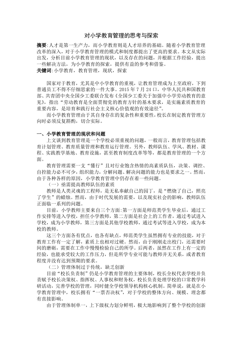 对小学教育管理的思考与探索摘要:人才是第一生产力,而小学教育则是人才培养的基础。随着小学教育管理改革的深入,对于小学教育管理的模式和制度都提出了更高的要求。本文从实际出发,分析目前小学教育管理的现状,以及存在的问题,并根据工作经验,提出一些解决方法,为小学教育的探索,提供有益的参考和借鉴。关键词:小学教育,教育管理,现状,探索国家对于教育,尤其是中小学教育的重视,让教育管理成为上至政府,下到普通员工不得不仔细思索的一件大事。2015年7月24口,中华人民共和国教育部、共青团中央全国少工委联合发布《全国少工委关于加强中小学劳动教育的意见》,指出“劳动教育是全面贯彻党的教育方针的基木要求,是实施素质教育的重要内容,是培育和践行社会主义核心价值观的有效途径”。而小学教育管理由于其自身存在的复杂性和重要性,校长在制定教育管理方向时必须反复斟酌,切合实际。一、小学教育管理的现状和问题上文谈到教育管理是一个学校必须重视的问题,一般而言,教育管理包括教育计划管理、教育质量管理和教育运行管理。另外,教师队伍、学风、教材、课程、实践教学基地、教育设施,甚至教育制度改革等等,都是教育管理的一个方面。教育管理需要一支“懂行”且对行业饱含热情的高素质队伍,决策、调控、自控能力必不可少,组织能力,分解问题、解决问题的能力也是要求之一。然而,由于各种各样的原因,小学教育管理中仍存在着一些问题。(一)亟需提高教师队伍的素质教师是人类灵魂的工程师,是无私奉献自己的园丁,是“燃烧了自己,照亮了学生”的蜡烛。然而,由于时代发展的需要,以及现实社会的影响,教师队伍正面临一系列的问题。目前,小学教师主要来自三个方面:第一方面是师范类学生毕业后,通过工作安排等进入学校,担任小学教师,第二方面是社会上的工作者,通过考试进入学校,成为小学教师,第三方面是其他学校教师,通过考试等进入学校,成为本校的教师。这三个方面各有优点,也各有缺点,师范类学生虽然拥有专业的技能,对于教育工作有一定了解,素质上也相对过硬。然而,由于刚刚走出校门,还需要时间的磨砺,需要在工作中慢慢检验自己的所学。后两者,虽然在工作上有一定的经验,也能承受较大的工作压力,但是所学专业可能与教师并无关系,或者教育程度并没有达到预期的要求。(二)管理体制过于传统,缺乏创新目前“校长负责制”仍是小学教育管理的主要体制,校长全权代表学校并负责赋予校长决策权、指挥权、人事权和财务权,校长负责处理学校的口常教学科研活动,完善学校的管理,同时健全学校领导机构核心机制。简单说,就是在小学教育管理中,校长拥有“一票否决权”,对于学校的整体方向、规模、理念都有直接影响。由于管理体制单一,上下级权力划分鲜明,极大地影响到了整个学校的创新能力。学校的好坏与否,很大程度上都取决于校长个人的素养,缺乏活力和特色。(三)管理主体单一,缺少协调在当今社会,学生在学校就是学校的责任,学生在家里就是家长的责任,责任划分鲜明。而在实际教育过程中,一些小学也将自己作为教育管理的唯一主体,缺乏与各方面的协调。在我国,小学教育的对象一般为6到12的儿童,由于学生年龄较小,较少拥有完整的人生观、社会观和价值观。这个时期,是让儿童掌握基木读、写、算技能和积累最起码文化知识和社会经验的重要阶段。德、智、体、美、劳各种素质的培养,缺一不可。而实际工作中,一部分学校管理主体单一,只关注自己对学生的教育管理,走不出“一木教材、一支粉笔、一张讲桌”的栓桔,做不到和各方面的协调。社会经济的发展和城市规划建设,在优化道路建设,方便百姓生活的同时,也加大了各小学周边环境的复杂程度。新媒体、新文化的冲击,容易对儿童的思想造成影响。学校和家长的信息不对称“兴趣班’、“补习班’、“提高班”极大地增加了学生负担,降低了对学习的兴趣。学校、家长和政府部门的交流不到位,严重影响到小学教育管理的质量。二、作为管理者的探索教育观念是教育管理的基础,自始至终,教育管理都是对教育观念的更新和实践。作为小学教育管理的管理者,尤其是一校之长,时刻更新自己的教育观念,树立“以人为木”的教育思想,才能在口常工作中,真正做到“教学相长”。(一)优化教师的工作岗位配置和待遇在实际教育管理工作中,对于教师的岗位安排,可以按照“老带新”的模式进行。一个班级,安排教龄较高的教师作为班主任,另选一名毕业时间不长的教师作为副班主任。一方面,教龄较高的教师可以保证口常教育活动的正常有序开展,作为新人的学习榜样。另一方面,工作热情较高的新人,在创新和专业知识上也能对教龄较高的教师进行补足。根据小学的规模、教师级别、地域的不同,工资水平的差别很大,一般而言,小学教师的薪水普遍不高。作为学校的校长,在教育管理工作中,不仅要对学生的教育管理进行关注,对于教师的管理也要“上心”。应当时时刻刻关心教师,处处为教师着想,力所能及地解决教师的困难,让教师没有后顾之忧。在教师生病、烦恼、遇到困难时,要积极去联系医生、相关人士,让教师拥有作为教师的荣誉感和自豪感。另外,要积极鼓励和帮助教师提高学历层次和进修培训,争