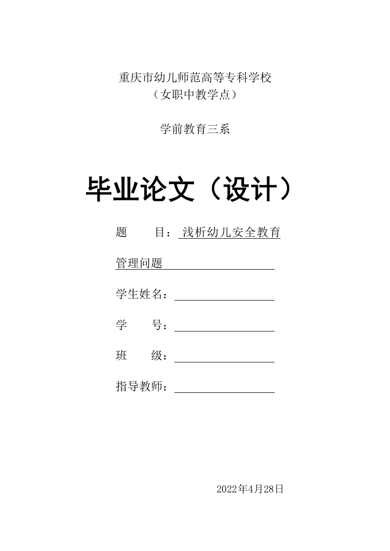 重庆市幼儿师范高等专科学校(女职中教学点)学前教育三系毕业论文(设计)题目:浅析幼儿安全教育管理问题学生姓名:学号:班级:指导教师:2022年4月28日目录案例事件:3分析与反思:《浅析幼儿安全教育管理问题》案例背景:在进行幼儿教学的过程当中,能够培养更加丰富的故事内容,才能够符合幼儿在学习过程当中的认知方式,能够吸引学生更多的兴趣来进行学习,所以,在给学生们讲授一些有关安全方面的知识的过程当中,我们可以通过事的形式来进行慢慢导入,让幼儿更加容易接受,从而能够得到更加深刻的印象。案例事件:我们家对学生进行整体的安全教育,过程当中可以将一些安全知识进行融入,比如说我们可以讲故事的形式来传递给学生,其次也可以从多媒体上播放相关画面来让学生们获得更多的安全知识,在不知不觉当中就能够得到有效的渗透。分析与反思:进行情景教学的过程当中,这就是一种非常成熟的解决方法,其中所涵盖的内容和形式是多种多样的,并且也能够伴随着信息技术的发展来进行不断的应用,使其不断的刺激幼儿在发展过程当中的视觉,听觉以及多重感官,让幼儿在进行学习和完了的过程当中就能够学到更多的安全知识。如消防演习:让幼儿分别扮演被困群众和消防员,利用多媒体展示相关的视频、图片、播放音乐让幼儿有身临其境之感,并让幼儿穿上消防员的衣服,拿着消防车、消防栓、泡沫灭火器等玩具,增强其责任感和使命感,在此基础上,引导“消防员”如何救助被困群众,“被困群众”如何实现自救,如用湿毛巾捂嘴弯腰前进。当身上着火时可以滚动灭火…这样的演习,生动具体,幼儿积极参与,不仅掌握了基本的安全知识,还领会到了消防员工作的辛苦,一举两得。在今年以来频频发现有关幼儿安全方面的问题,在这个大背景之下,我们应该进行及时的高度重视工作,从而保证幼儿园的安全问题能够得到保障,将安全艾滋进行发挥,提高学生们的安全意识,但是在做法方面,仍然存在一定的问题,我们为了能够保证学生们在身体健康方面的保护,应该及时加强自我保护教育并且防止灾害事故的发生能够进行提前预防和发展,加强各方面的教