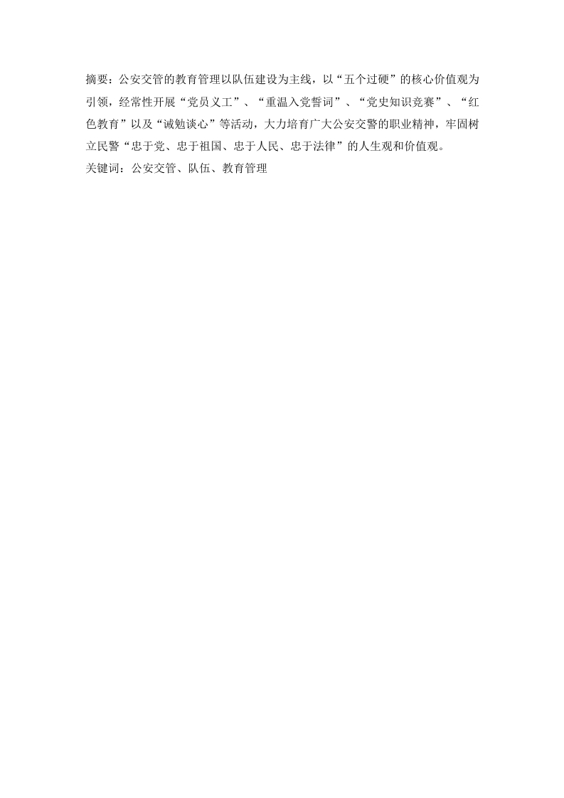 摘要:公安交管的教育管理以队伍建设为主线,以“五个过硬”的核心价值观为引领,经常性开展“党员义工”、“重温入党誓词”、“党史知识竞赛”、“红色教育”以及“诚勉谈心”等活动,大力培育广大公安交警的职业精神,牢固树立民警“忠于党、忠于祖国、忠于人民、忠于法律”的人生观和价值观。关键词:公安交管、队伍、教育管理Abstract:Educational police traffic control management to team building the mainline,"five excellent"the core values for the lead,carry out regular "party volunteers","review the party oath,""History Quiz","Red Education "and"admonishing talk "andother activities,to cultivate the majority of the public security police professionalism,firmly establish the police,"loyal to the party,loyal to the motherland,loyal to thepeople,loyal to the law,"the life and valuesKeywords:police traffic control,team management education目录一、五个过硬概述(一)政治过硬H.....................(二)业务过硬1(三)责任过硬…(五)作风过硬…2二、加强公安交管队伍教育管理的内在要求2(一)学习贯彻党的指示2(二)安全防事故的重要保证2(三)密切执法人员关系的重要途径…2(四)完成各项工作的重要条件3三、公安交管队伍素质教育的方向.…3(一)思想品德素质.…(二)科学文化素质…3(三)、身体素质.…4(四)要有高度的责任心和使命感…三、完善公安交管队伍教育管理的措施.…(一)深化业务训练,提高承受能力…4(二)健全教育组织,积极做好思想政治教育工作.…4(三)建立教育管理档案,记录交通交管队伍的发展趋势…5总结6参考文献