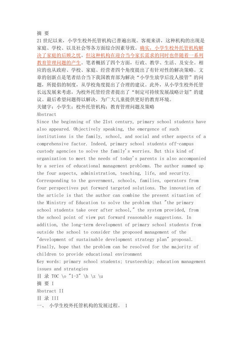摘要21世纪以来,小学生校外托管机构已普遍出现。客观来讲,这种机构的出现是家庭、学校、以及社会等各方面综合因素导致。确实,小学生校外托管机构解决了家庭的后顾之忧。但这种机构在迎合当今家长需求的同时也伴随着一系列教育管理问题的产生。笔者概括了四个方面,行政、教学、生活、及安全。相应的也从政府、学校、家庭、经营者四个角度提出了有针对性的解决策略。文章的创新点是笔者结合当下我国教育部为解决“小学生放学后没人接管”的问题,所提倡的制度,从学校角度提出了合理的建议。此外,从小学生校外托管长远发展来考虑,为校外托管经营者提出了“制定可持续发展战略计划”的建议。最后希望问题得以解决,为广大儿童提供更好的教育环境。关键字:小学生:校外托管机构:教育管理问题及策略AbstractSince the beginning of the 21st century,primary school students havealso appeared.Objectively speaking,the emergence of suchinstitutions is the family,school,and social and other aspects of acomprehensive factor.Indeed,primary school students off-campuscustody agencies to solve the family's worries.But this kind oforganization to meet the needs of today's parents is also accompaniedby a series of educational management problems.The author summed upthe four aspects,administration,teaching,life,and security.Corresponding to the government,schools,families,operators fromfour perspectives put forward targeted solutions.The innovation ofthe article is that the author can combine the present situation ofthe Ministry of Education to solve the problem that "the primaryschool students take over after school,the system provided,fromthe school point of view put forward reasonable suggestions.Inaddition,the long-term development of primary school students fromoutside the school to consider the proposed management of the"development of sustainable development strategy plan"proposal.Finally,hope that the problem can be resolved for the majority ofchildren to provide educational environmentKey words:primary school students;trusteeship;education managementissues and strategies摘要IAbstract II目录III一、小学生校外托管机构的发展过程。1(一)小学生校外托管机构的概念1(二)产生小学生校外托管机构的原因11、家庭原因12、学校原因13、社会原因2二、小学生校外托管机构存在的教育管理问题3(一)行政管理方面31、未建立完善的规章管理制度3(二)教学管理方面4(三)生活管理方面5(四)安全管理方面6三、解决小学生校外托管机构教育管理问题的策略。7(一)政府角度71、建立统一的托管机构管理制度7(二)学校角度9(三)家庭角度10(四)经营者角度10结语12参考文献13致谢142、小学生校外托管机构的发展过程。(一)小学生校外托管机构的概念小学生校外托管机构,又称小学生校外“小饭桌”。顾名思义,就是相对于校内规模性经营模式的餐厅而言的校外餐饮行业。以前主要是为小学生提供午餐,随着发展,这种机构的功能也越来越多样化。当今小学生校外托管机构日渐流行,行业竞争压力也逐渐增大。迫于迎合家长及学生的需求。已由原来低收费的看管服务演变为盈利性的监管加课外辅导,且收费标准不断提高。[1]具体表现为仅提供午餐或晚餐,发展为提供全天食宿以及课后家庭作业的辅导服务的全托机构,半托机构,半托又可分为午托和晚托。即只负责中午和晚上的食宿和家庭作业的辅导。甚至有小学生校外托管机构与教育辅导机构相融合的现状。托管机构的种类主要有学校托管、社区托管和私人托管机构。学校托管机构几乎不存在了,而社区托管由于各种限制又难以维持下去,因此私人托管机构成为主流。托管机构的负责人主要是居民家庭和创业者。如今,这种机构起着联系家庭与学校的作用,一直备受关注。(二)产生小学生校外托管机构的原因1、家庭原因快速发展的经济社会下,人们所面临的压力也在增大。大多家庭中的女性成员也都走向工作岗位,同男性一样承担起家庭经济重担。传统的“保姆式”女性家庭角色屈指可数。于是,“妻以夫为纲”的观念已被打破,家庭责任开始外化。家中的“贤妻良母”已不在使女性角色得到满足,她们开始步入社会各个行业,并且扮演的角色也越来越重要。所以,大部分女性休完产假便全身心的投入工作岗位中,这便使得孩子较小时只能由老人看管,上学时便无人接送的局面。因为我国人口老龄化严重,大部分老人年事已高,对于现今的交通工具及交通规则无法掌握,在接送孩子上下学问题上就显得有心无力。甚至一些父母迁移到城镇之后,老人都不在身边,远水救不了近火。其次,当今时代,小学生家庭作业复杂,家中父母没时间指导,老人又很难解决孩子家庭作业的问题,这就形成了孩子放学后困局的现状,成了一个家庭的后顾之忧,无疑是小学生校外托管机构产生的一个原因。2、学校原因小学生校外托管机构的出现,可以说是小学后勤服务与课后服务不到位的一个产物。我国大部分小学并未设立专门的餐厅,许多孩子的饮食问题就只能靠学校周边餐馆,甚至地摊食品来解决。少部分卫生观念较强的家长中午会选择给孩子送饭和由孩子自带饭盒,这便使孩子在外解决饮食存在着极大的卫生及其安全隐患。一些大城市的小学生校内托管机构便可以可以解决这一问题。但随着发展,我国开始提倡素质教育和为学生减负的口号,并且开始整顿学校乱收费现象。于是规范教育收费和为学生减负就成了当今