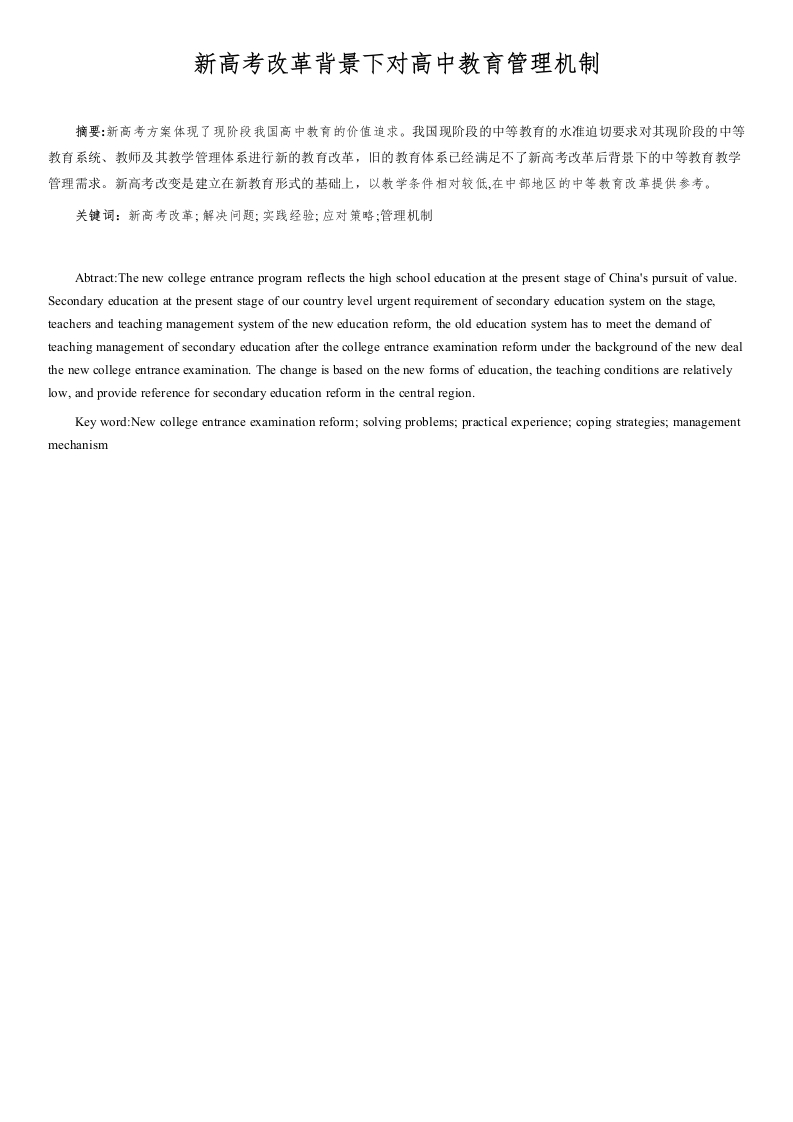 新高考改革背景下对高中教育管理机制摘要:新高考方案体现了现阶段我国高中教有的价值追求。我国现阶段的中等教育的水准迫切要求对其现阶段的中等教育系统、教师及其教学管理体系进行新的教育改革,旧的教育体系已经满足不了新高考改革后背景下的中等教育教学管理需求。新高考改变是建立在新教育形式的基础上,以数学条件相对较低,在中部地区的中等教育改革提供参考。关键词:新高考改革;解决问题:实践经验;应对策略:管理机制Abtract:The new college entrance program reflects the high school education at the present stage of China's pursuit of valueSecondary education at the present stage of our country level urgent requirement of secondary education system on the stage,teachers and teaching management system of the new education reform,the old education system has to meet the demand ofteaching management of secondary education after the college entrance examination reform under the background of the new dealthe new college entrance examination.The change is based on the new forms of education,the teaching conditions are relativelylow,and provide reference for secondary education reform in the central region.Key word:New college entrance examination reform;solving problems;practical experience;coping strategies;managementmechanism目录摘要1关键词Abtract…引言3一、新高考改革背景下对高中教育教学管理机制新要求3(一)建立和完善诚信机制和惩罚机制.…4(二)从我国高校招生时间短的基本国情出发5二、高中教育教学管理机制实例研究.5三、新高考改革背景下对高中教育教学管理机制的建议(一)实行选课走班机制…(二)科学、合理地安排学考、选考时间…6(三)建立执行班主任的“三位一体”管理制度(四)建立与高考改革相适应的教育教学评价机制…参考文献8引言2014年9月4日,国务院须布《关于深化考试招生制度改革的实施意见》。真正实现了从分数唯一到以学生发展为本的转变,推进了必修课程走班制,跋予了学生前所未有的学习选课权、考试选择权,更加关注学生的创新精神和实践能力,强调学生综合素质基础性,分数不再是唯一的招生录取依据。这一创举对现有中学数育课程、教师、教学管理评估系统提出一项新的申请和改革。在新特点的理解基础上继而对地区学校试点与地区中心的经验进行了分析,并提出了改革措施,这是改革的统一理由。受一些条件限制,对中部地区高中教育提供参考。一、新高考改革背景下对高中教育教学管理机制新要求(一)建立和完善诚信机制和惩罚机制我们必须建立和完善机制至关重要的诚信和惩罚机制,在综合素质评价高招起作用的设计、重大发展,远离外貌与恐惧,是不可能发生的本地临时病例相似。完善的教育诚信机制及其惩罚机制要求中等教育在其管理过程中应该建立相关的“监督”机构和部门,运用综合教育素质评价标准对其“监督”机构或者部门提供监督标准、责任认定及其教育跟踪等等。于此同时,高中院校可以建立健全学院完善的管理档案,或者与其他高中院校统一合作归纳建立完善的档案管理机制,对其院校学生进行全面的评估,可以有效的改善高中院校造假舞弊现象,营造良好的教学教育管理氛围。(二)从我国高校招生时间短的基本国情出发我们对我国高校招生改革的国家情况,以时间短的综合素质评价的内容为样本,以便数师入学率在很短的时间跟踪学生的特点和兴趣爱好。因此,素质评价适当比例的尺寸综合等等是有道理的。这样做有两个好处:一是减少招生机构压力材料:这两个机构可以捕获更多有用的信息。害怕被划分等等比例,让学生在排队,相当于学生负担加重。笔者不同意这种看法。在西方国家的大学审请材料,包括学生每个学期的表现,常常要求学校提供“名次总人数”这一信息,因为这不是也有学习负担加重。何况我们不仅仅是学生的成绩层面结合等等。整体评价质量评估的层面上,多年来已经被学校的学生比例从全球一级评估之间的差异,学校是自由处置。如果学校管理人员比例也表达了关于评估中学一级从更严肃地对待,不容易评估走过场。因为,均等第利用率就会提高父母和学生、给予高度优先地位和过程的监督评估各项评估进程更有力、更大的规范。(三)综合素质评价作为其教育评价标准高中教育的评价标准应该科学合理的遵循综合素质评价标准,高中学生考试的分数应该遵循综合指标和分类指标的原则,高考分数简单的考分相加是极其不科学的计分模式,就的教育体系往往会导致扼杀学生全面发展的良好氛围,造成畸形的教育现象,高考评分模式应该注重高考、学考极其综合素质相互结合的新型考评模式,这样不仅仅可以有效的给考试全面发展的空间,也可以给综合素质的质性评价与等级评价留出足够空间,另外,为了提高综合素质评价的信息量,《意见》明确要求学生应提供一份个人自述及简明教师评语,能够使用综合素质评价的学习,你真的不只是分数考的合成与高考分数相加,直接与综合指标,同时,要做什么课程,在分类评价指标的综合素质和学习上,倾领向于综合素质评价与评估形成足够的空间。另外,为了提高评价质量综合意见中明确要求学生个人、教师和筒明的自述。这很有意义,它类似于欧美高校要求的个人自荐信与教师推荐信,能够从考生本人和外人视角勾勒出学生的个性特征。《意见》让民众看到了我国数育体制改