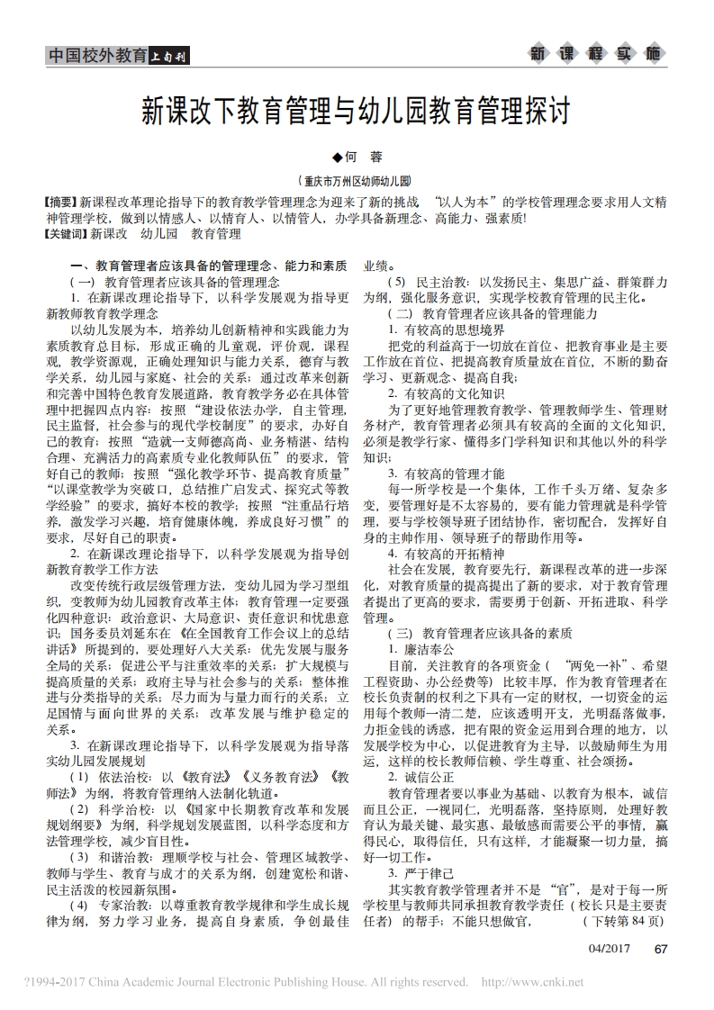中国校外教育上句利新课程实施新课改下教育管理与幼儿园教育管理探讨◆何蓉(重庆市万州区幼师幼儿圆【摘要】新课程改革理论指导下的教育教学管理理念为迎来了新的挑战“以人为本”的学校管理理念要求用人文精神管理学校,做到以情感人、以情育人、以情管人,办学具备新理念、高能力、强素质!【关键词】新课改幼儿园教育管理一、教育管理者应该具备的管理理念、能力和素质业绩。(一)教育管理者应该具备的管理理念(5)民主治教:以发扬民主、集思广益、群策群力1.在新课改理论指导下,以科学发展观为指导更为纲,强化服务意识,实现学校教育管理的民主化。新教师教育教学理念(二)教育管理者应该具备的管理能力以幼儿发展为本,培养幼儿创新精神和实践能力为1.有较高的思想境界素质教育总目标,形成正确的儿童观,评价观,课程把党的利益高于一切放在首位、把教育事业是主要观,教学资源观,正确处理知识与能力关系,德育与教工作放在首位、把提高教育质量放在首位,不断的勤奋学关系,幼儿园与家庭、社会的关系:通过改革来创新学习、更新观念、提高自我:和完善中国特色教育发展道路,教育教学务必在具体管2.有较高的文化知识理中把握四点内容:按照“建设依法办学,自主管理,为了更好地管理教育教学、管理教师学生、管理财民主监督,社会参与的现代学校制度”的要求,办好自务材产,教育管理者必须具有较高的全面的文化知识,己的教育:按照“造就一支师德高尚、业务精湛、结构必须是教学行家、懂得多门学科知识和其他以外的科学合理、充满活力的高素质专业化教师队伍”的要求,管好自己的教师;按照“强化教学环节、提高教育质量”3.有较高的管理才能“以课堂教学为突破口,总结推广启发式、探究式等教每一所学校是一个集体,工作千头万绪、复杂多学经验”的要求,搞好本校的教学;按照“注重品行培变,要管理好是不太容易的,要有能力管理就是科学管养,激发学习兴趣,培育健康体魄,养成良好习惯”的理,要与学校领导班子团结协作,密切配合,发挥好自要求,尽好自己的职责。身的主帅作用、领导班子的帮助作用等。2.在新课改理论指导下,以科学发展观为指导创4.有较高的开拓精神新教育教学工作方法社会在发展,教育要先行,新课程改革的进一步深改变传统行政层级管理方法,变幼儿园为学习型组化,对教育质量的提高提出了新的要求,对于教育管理织,变教师为幼儿园教育改革主体;教育管理一定要强者提出了更高的要求,需要勇于创新、开拓进取、科学化四种意识:政治意识、大局意识、责任意识和忧患意管理。识:国务委员刘延东在《在全国教育工作会议上的总结(三)教育管理者应该具备的素质讲话》所提到的,要处理好八大关系:优先发展与服务1.廉洁奉公全局的关系:促进公平与注重效率的关系:扩大规模与目前,关注教育的各项资金(“两免一补”、希望提高质量的关系;政府主导与社会参与的关系;整体推工程资助、办公经费等)比较丰厚,作为教育管理者在进与分类指导的关系;尽力而为与量力而行的关系;立校长负责制的权利之下具有一定的财权,一切资金的运足国情与面向世界的关系;改革发展与维护稳定的用每个教师一清二楚,应该透明开支,光明磊落做事,关系。力拒金钱的诱惑,把有限的资金运用到合理的地方,以3.在新课改理论指导下,以科学发展观为指导落发展学校为中心,以促进教育为主导,以励师生为用实幼儿园发展规划运,这样的校长教师信赖、学生尊重、社会颂扬。(1)依法治校:以《教育法》《义务教育法》《教2.诚信公正师法》为纲,将教育管理纳人法制化轨道。教育管理者要以事业为基础、以教育为根本,诚信(2)科学治校:以《国家中长期教育改革和发展而且公正,一视同仁,光明磊落,坚持原则,处理好教规划纲要》为纲,科学规划发展蓝图,以科学态度和方育认为最关键、最实惠、最敏感而需要公平的事情,赢法管理学校,减少盲目性。得民心,取得信任,只有这样,才能凝聚一切力量,搞(3)和谐治教:理顺学校与社会、管理区域教学、好一切工作。教师与学生、教育与成才的关系为纲,创建宽松和谐、3.严于律己民主活泼的校园新氛围。其实教育教学管理者并不是“官”,是对于每一所(4)专家治教:以尊重教育教学规律和学生成长规学校里与教师共同承担教育教学责任(校长只是主要责律为纲,努力学习业务,提高自身素质,争创最佳任者)的帮手;不能只想做官,(下转第84页)04/201767?1994-2017 China Academic Journal Electronic Publishing House.All rights reserved.http://www.cnki.net中国校外教育上句利课程索四、教学应贴近学生的生活实际,解决与学生紧密在学习“分子热运动”知识时,利用多媒体课件展联系的问题,以此激发学生的学习兴趣示的fash动画,使学生直观地认识到了分子的扩散现日常生活中的物理现象比比皆是,教学中教师应借象,使抽象的知识变得具体、形象。在完成“平面镜成助与鲜活的、贴近学生的生活案例,用最浅显的语言帮像特点”的探究实验后,及时向学生展示的蜡烛成像及助学生对书本知识的学习。如路灯是串联还是并联?汽光路动画,形象、通真,再加上声情并茂的解说,仿佛车轮胎上为什么有许多花纹?霜、雾是怎样形成的?指给学生注射了一针清新剂,学生对所学知识有了更深的南针为何指南北?等