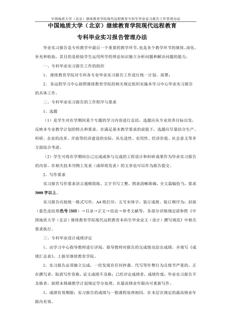 中国地质大学〔北京)继续教育学院现代远程教育专科生毕业实习报告工作管理办法中国地质大学(北京)继续教育学院现代远程教育专科毕业实习报告管理办法毕业实习报告是专科教学中最后一个重要的教学环节,也是各个教学环节的继续、深化、补充和检验,其目的是检验学生运用所学的理论知识独立分析问题和解决问题的能力。一、专科毕业实习报告工作的组织1、继续教育学院对专科各专业毕业实习报告工作进行统一计划、部署:2、各远程学习中心按照继续教育学院的相关规定组织实施本学习中心毕业实习报告的具体工作。二、专科毕业实习报告的工作程序与要求1、选题(1)是学生对在学期间某个专题的学习内容进行总结,选题应从专业培养目标出发,反映本专业教学计划的特点和要求。在满足基本教学要求的前提下,选题应尽量结合生产、科研、企业的改革、开放等经济建设的实际,从先进性、实用性、经济价值、社会意义等多方面综合考虑。(2)学生可将在学期间自己完成或参与完成的工程设计和科研成果作为毕业实习报告的内容。在相关技术刊物上发表(或即将发表)的文章也可以作为报告提交。2、写作要求实习报告写作要求语言通顺简练、文字书写工整,图表清晰准确,全文篇幅恰当,要求3000字以上。实习报告应按统一格式写作,A4纸打印,五号宋体字,装订成册。装订顺序为:封面(蓝色皮纹纸色号1505)→目录→正文→结论→参考文献等,各部分详细规定请参照《中国地质大学(北京)继续教育学院现代远程教育本科生毕业论文(设计)撰写规范》中相关要求执行。三、专科毕业设计成绩评定1、由学习中心指导教师进行评阅,指导教师对报告的完成情况给出成绩,并填写《成绩汇总表》,上报至继续教育学院。2、实习报告必须独立完成,一经发现有任何抄袭、代写等作弊行为且情节严重的,正在撰写者,取消写作资格,论文成绩不及格:己经评定成绩者,成绩作废:毕业实习报告不及格者,按照未修满教学计划规定学分处理,在最高修业年限内可重新写作。3、成绩有效期限:实习报告的成绩与一般课程处理相同,在本层次规定的最高修业年限内有效。