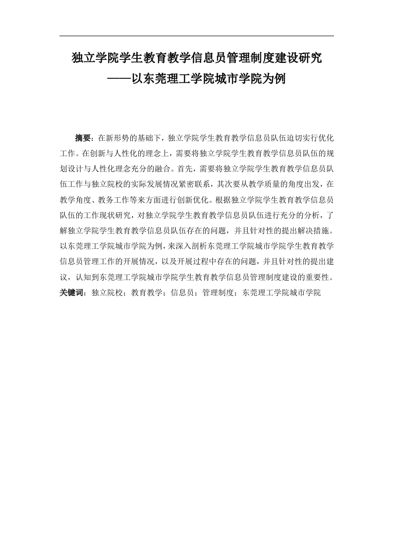独立学院学生教育教学信息员管理制度建设研究以东莞理工学院城市学院为例摘要:在新形势的基础下,独立学院学生教育教学信息员队伍迫切实行优化工作。在创新与人性化的理念上,需要将独立学院学生教育教学信息员队伍的规划设计与人性化理念充分的融合。首先,需要将独立学院学生教育教学信息员队伍工作与独立院校的实际发展情况紧密联系,其次要从教学质量的角度出发,在教学角度、教务工作等来方面进行创新优化。根据独立学院学生教育教学信息员队伍的工作现状研究,对独立学院学生教育教学信息员队伍进行充分的分析,了解独立学院学生教育教学信息员队伍存在的问题,并且针对性的提出解决措施。以东莞理工学院城市学院为例,来深入剖析东莞理工学院城市学院学生教育教学信息员管理工作的开展情况,以及开展过程中存在的问题,并且针对性的提出建议,认知到东莞理工学院城市学院学生教育教学信息员管理制度建设的重要性。关键词:独立院校:教育教学;信息员:管理制度:东莞理工学院城市学院Abstract:on the basis of the new situation,the independent college education theteaching feedback reporters team urgently implement optimization work.On theinnovation and the idea of humanization,need to the planning and design of theindependent college education the teaching feedback reporters team and humanizedidea fully.First of all,you need to independent college education the teachingfeedback reporters team work is closely linked with the actual development of theindependent colleges,secondly,from the perspective of teaching quality,in the aspectof teaching and educational work to innovate optimization.According to the currentwork of the independent college education the teaching feedback reporters teamresearch,accesses to the independent college student education teaching team to fullyanalysis,to understand the problems existing in the independent college studentseducation teaching feedback team,and the corresponding solving measures are putforward.In dongguan institute of technology city college,for example,to analyze thedongguan institute of technology,city college student accesses the education teachingmanagement work,and carry out the problems existing in the process,and specificSuggestions,cognition to the dongguan institute of technology city college studentsthe importance of the education teaching feedback management system construction.Key words:new situation of independent colleges informants Dongguan institute oftechnology city college education teaching目录1.2研究背景.21.3研究综述1.3.1独立学院1.3.2信息员1.3.3管理制度1.4研究思路与方法1.4.1研究思路1.4.2研究方法.51.5创新与不足61.5.1创新之处61.5.2不足之处.…第2章独立院校建立学生信息员制度的任务与作用.2.1独立院校建立学生信息员制度的任务.…2.1.1原则.92.1.2内容.…2.2独立院校建立学生信息员制度的作用2.2.1完善教学质量监控体系,提升教学质量与管理效率.102.2.2有利于培养学生的自主性与积极性1222.3融洽师生关系,构建和谐校园文化氛围.…13