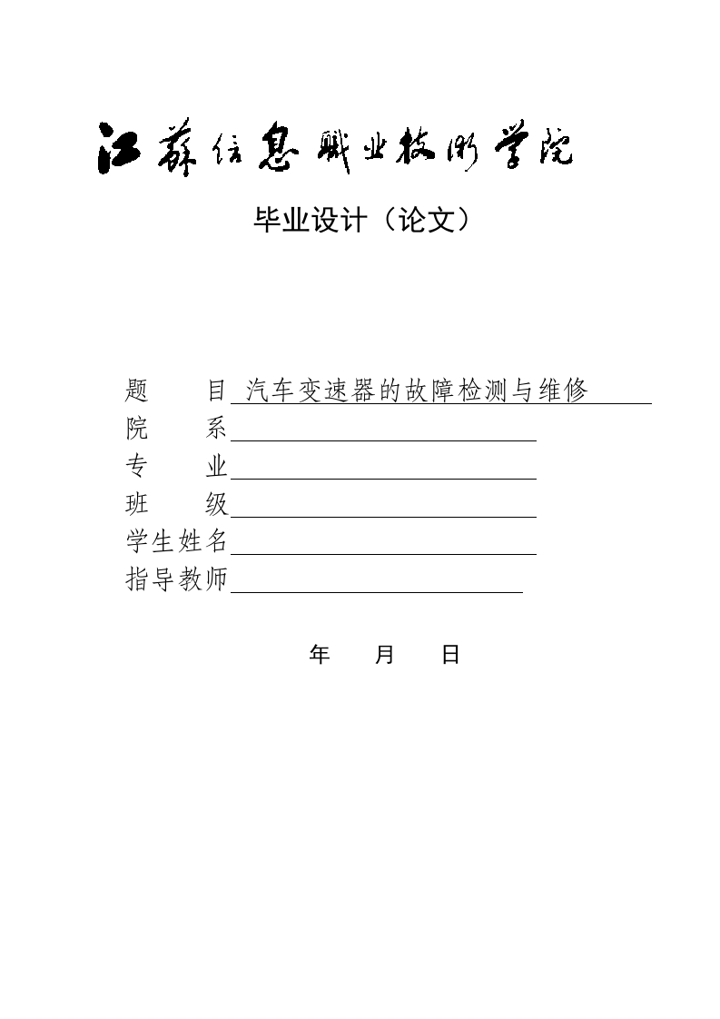 毕业设计(论文)目汽车变速器的故障检测与维修院专班系业级学生姓名指导教师年月摘要随着经济的飞速发展与科技的进步,汽车渐渐走进寻常百姓家,变速器作为汽车传动总成的关键部件其性能的好坏直接影响到汽车的动力性、经济性和可靠性。传动系是汽车实现发动机动力输出到行驶的必需系统,变速器是汽车传动系中一个重要总成。高度可靠的汽车变速器能够避免故障和事故的发生,如果变速器出现乱挡故障,则会使驾驶员无法操纵车辆,甚至造成交通事故,影响行车安全。本文以两个案例的自动、手动变速器为研究内容,主要采用调查、访谈等方法进行研究。通过深入研究故障车型变速器的结构组成及其作用、工作原理和检测与维修以及检修实例等四个大的方面,提取有效的故障特征信息是进行故障诊断的关键,根据变速器故障的原因进行分析,采取准确、有效的预防措施,更好更全面的检修变速器,确保汽车正常行驶。关键词:变速器:故障分析;诊断维修目录第一章前言…1.1研究背景1.2研究意义…第二章汽车变速器相关概述2.1变速器的功能22.2按操纵方式的变速器分类以及工作原理2第三章自动变速器常见故障研究…3.1换挡冲击过大的故障研究分析3.2变速器产生异响8第四章实例汽车变速器故障分析.…4.1丰田卡罗拉U341E型车型自动变速器故障案例4.2桑塔纳2000系列手动变速器故障案例第五章总结参考文献…致谢