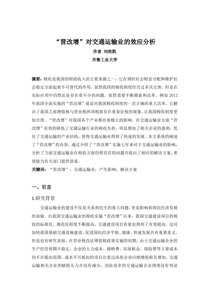 “营改增”对交通运输业的效应分析作者刘奕凯齐鲁工业大学摘要:税收是我国的财政收入的主要来源之一,它在调控社会财富分配和维护社会稳定方面起着不可替代的作用,虽然我国的税收制度经历过多次完善,但是在实际应用中仍然还是存在着不少的问题,依然需要不断摸索和改革。例如2012年我国全面实施的“营改增”就是对我国税收制度的一次正确的重大改革,它解决了我国之前增值税与营业税两项税款存在重复征税的现象,让我国税收制度更加合理。“营改增”对我国各个产业都有着极大的影响,在交通运输业方面“营改增”有效的降低了交通运输行业的税收负担,明显增加了相关企业的盈利,优化了交通运输的产业结构,使得交通运输业得到了快速的发展。本文系统的阐述了“营改增”的内容,通过介绍了“营改增”实施七年来对于交通运输业的影响,分析了当前交通运输业在税收方面仍然存在的问题并提出了相应的解决方案,希望能为有关部门提供借鉴。关键词:“营改增”;交通运输业:产生影响:解决方案一、引言1.研究背景交通运输业的建设不仅是关系到民生的重大问题,更是影响着国民经济发展的命脉。自我国交通运输业的税收实施“营改增”以来,我国交通建设项目的税收的标准化、规范化程度不断提高,交通建设项目质量也得到了有效提高。这对加快我国基础交通设施建设,促进国民经济平稳、健康、快速发展具有重要意义。但是也有研究表面,在营业税改征增值税政策实施的初期,由于交通运输企业的生产经营周期不稳定,企业的人力成本、路桥费、房屋租金、保险费等主要成本均不在抵扣范围,成本不可抵扣的项目比重过高使企业应纳增值税负增加,交通运输相关企业的赋税压力并没有减少,因此很多的交通运输企业绩效没有明显改。同时,与其他的第三产业相比,交通运输业又具有服务范围广、影响国民经济大等特点,因此税收制度改革对于交通运输业的影响以及如何应对收税变化的负面影响是一个值得讨论的话题。2.研究目的和意义1.2.1研究目的交通运输业在实施“营改增”的税收政策以来,交通运输企业的财务状况受到了比较大的影响。由于“增值税”的一个非常大的特征是税负抵扣机制,简单来说就是实施“营改增”之后,企业的可抵扣的税务项目比重将在很大一方面影响“营改增”企业的税负。如果企业在可抵扣进项税额方面的支出比例较大的,其增值税负担应当减轻:如果企业在不可抵扣进项税额方面的支出数额较大的话,则在以增值税代替营业税后,税收负担很可能增加。笔者通过比较“营改增”实施前后对交通运输企业税负影响,讨论了对于相关企业在政策下的发展方向以及如何顺应政策使企业得到更好的发展。1.2.2研究意义税收是我国的财政收入的主要来源之一,它在调控社会财富分配和维护社会稳定方面起着不可替代的作用:交通运输业的建设不仅是关系到民生的重大问题,更是影响着国民经济发展的命脉。二者对于我国经济建设和社会安定都有着不可替代的作用,因此有必要系统化讨论两者的相关联系,分析两者之间的潜在问题,并提前提出解决方案,进而帮助相关从业人员更好的理解“营改增”对交通运输业的影响,预测交通运输行业往后发展走势,不断优化我国财政税收制度和交通运输产业结构。3.采用的研究方法比较研究法,又称类比分析法,即将两个包括两个以上的事物或事物自身前后变化进行比较,进而找出它们之间的相似性与差异性,是一种比较常用的分析方法。本文通过对营改增实施前后一系列数据进行处理、分析,进而得到一些重要数据。本文研究内容为“营改增”对交通运输业的效应分析,通过运用比较分析法对营改增实行前后对交通运输业的影响进行分析,分析出营改增的优势,以及对交通运输业以后发展的影响,以及可能出现的情况进行分析。三、交通运输业“营改增”的原因及意义3.1“营改增”的背景原因2011年10月26日,中国国务院常委在会议上做出决定,改营业税为征增值税,可以说这是我国税收体制改革的重大措施。在我国缴纳营业税的实际经营与生产中,往往需要购进货物、劳务修理等,由于之前的的增值税进项税不能抵扣,导致在这些方面会存在重复征税现象,不仅增加了纳税人的纳税负担,也影响着我国第三产业的发展。增值税最早诞生于二十世纪五十年代,到目前为止,世界上有150多个国家都有实施。增值税征税范围非常广,税源充足并且纳税人数量巨大,是世界上最主要的税种之一,其税种覆盖范围几乎遍布所有经济行业。增值税的征税模式多采用多环节征收、环环抵扣方式,原因是这种征税方式对税收的计算相比简单,方便的同时减少错误,可以实现财政收入的稳定征收。增值税的产生是国家经济改革与发展的结果,从1978年中国进行经济体制改革开始,到1979年我国首次引入增值税,我国的工业在经济体制改革的背景下向着专业化方向不断发展。二十世纪九十年代,社会主义市场经济体制的确立将企业推向了国际化竞争,使增值税的征收范围扩大:2003年,党的十六届三中全会对社会主义市场经济的目标进行了完善:2009年1月开始,增值税过渡为消费型增值税,这一转向减轻了企业的竞争与纳税压力,很好地促进了企业的发展:2012年1月,营业税改征增值税试点在上海交通运输业与服