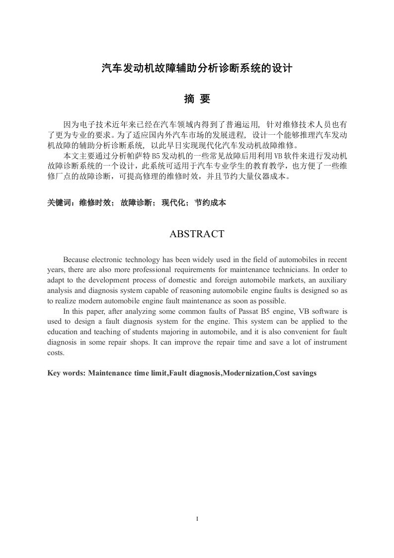 汽车发动机故障辅助分析诊断系统的设计摘要因为电子技术近年来已经在汽车领域内得到了普遍运用,针对维修技术人员也有了更为专业的要求。为了适应国内外汽车市场的发展进程,设计一个能够推理汽车发动机故障的辅助分析诊断系统,以此早日实现现代化汽车发动机故障维修。本文主要通过分析帕萨特B5发动机的一些常见故障后用利用VB软件来进行发动机故障诊断系统的一个设计,此系统可适用于汽车专业学生的教育教学,也方便了一些维修厂点的故障诊断,可提高修理的维修时效,并且节约大量仪器成本。关键词:维修时效;故障诊断;现代化;节约成本ABSTRACTBecause electronic technology has been widely used in the field of automobiles in recentyears,there are also more professional requirements for maintenance technicians.In order toadapt to the development process of domestic and foreign automobile markets,an auxiliaryanalysis and diagnosis system capable of reasoning automobile engine faults is designed so asto realize modern automobile engine fault maintenance as soon as possible.In this paper,after analyzing some common faults of Passat B5 engine,VB software isused to design a fault diagnosis system for the engine.This system can be applied to theeducation and teaching of students majoring in automobile,and it is also convenient for faultdiagnosis in some repair shops.It can improve the repair time and save a lot of instrumentcosts.Key words:Maintenance time limit,Fault diagnosis,Modernization,Cost savings目录....................ABSTRACT................第一章绪论…1.1课题设计的背景和意义…1.3国内外汽车诊断技术的发展情况1.4系统的设计思想…4第二章汽车发动机故障辅助分析诊断系统需求分析2.1社会背景分析…2.2学校教育及中小型修理厂需求分析第三章基于VB发动机故障诊断系统设计63.1总界面的设计3.2诊断系统主界面设计73.3汽车发动机原理.…83.4汽车发动机常见故障93.5诊断系统的调试…3.5.1程序调试…3.5.2运行准备.3.5.3功能说明.19第四章实例分析…20.20参考文献22