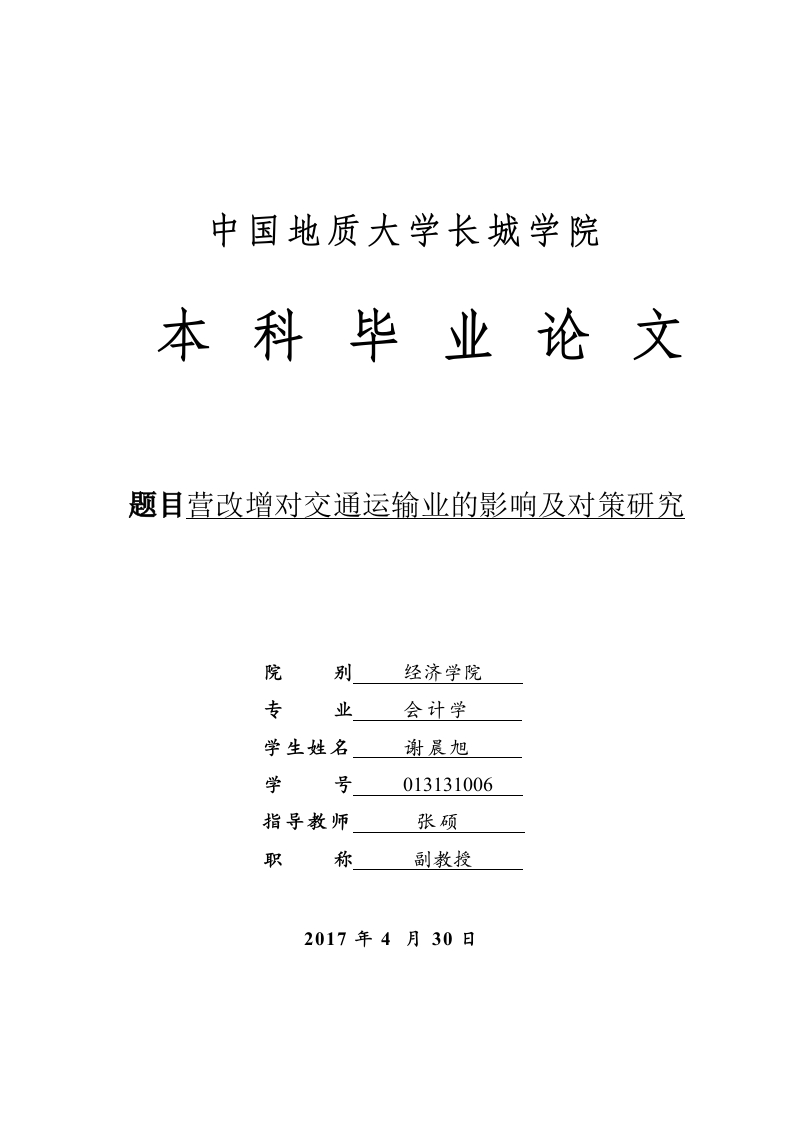 中国地质大学长城学院本科毕业论文题目营改增对交通运输业的影响及对策研究院别经济学院专业会计学学生姓名谢晨旭学号013131006指导教师张硕职称副教授2017年4月30日本科毕业生毕业论文(设计)诚信承诺书毕业论文营改增对交通运输业的影响及对策研究(设计)题目学生姓名谢晨旭专业会计学学号013131006指导老师张硕职称副教授所在系别经济学院诚信承诺本人慎重承诺和声明:我承诺在毕业论文(设计)活动中遵守学校有关规定,恪守学术规范,在本人的毕业论文中不剽窃、抄袭他人的学术观点、思想和成果,不篡改研究数据,如有违规行为发生,我愿承担一切责任,接受学校的处理。学生(签名):谢晨旭2017年4月30日中国地质大学长城学院毕业论文任务书学生姓名谢晨旭学号013131006专业班级会计学十班指导教师张硕职称副教授单位中国地质大学长城学院毕业论文题目营改增对交通运输业的影响及对策研究毕业设论文主要内容和要求:主要内容:本文比较详细的分析了营业税改征增值税对交通运输业运营成本、税负、竞争力、上下游相关企业等各方面所带来的影响,并且根据实际情况进行调研分析,结合国家“营改增”的相关措施和政策,提出进行合理纳税筹划,加强企业预算管理:调整企业内部结构,优化业务流程:完善相关会计核算方法等一系列建议,促进营业税改征增值税后交通运输业的健康有序发展。要求:论文撰写要求思路清晰、内容充实、论点明确,论据充分,论证严密,语言通顺。撰写论文前应首先阅读相关的研究资料,掌握学术前沿动态,对相关理论著作要很好的把握,提高理论水平及思想深度。根据开题报告和老师提出的意见对论文提纲进行修改,确定大纲后认真撰写毕业论文。撰写论文结束后要根据老师的修改意见,认真反复的修改论文,并按照要求参加毕业论文的答辩,严格按照论文进度安排进行论文的写作。论文的格式、字数等撰写方面的要求参照《中国地质大学长城学院毕业论文(设计)撰写规范》。毕业论文主要参考资料:[1]常晋.“营改增”对交通运输业的税务影响及对策分析[J刀.中国外资.2013(2).11-13[2]王冉.营改增对交通运输业税负的影响及研究对策[J刀.经贸实践.2015(15).37-38[3]邹桂如,朱秀萍.“营改增”对交通运输业的影响[N].南京广播电视大学学报.2013(1).49-51[4]潘文轩.企业“营改增”税负不减反增现象分析[J刀.商业研究.2013(1).145-150[5]李萌萌.营改增对公路运输企业的影响研究[J刀.河北企业.2015(3).11-12[6]樊其国.“营改增”税负反增如何应对?[J刀.首席财务官.2013(1).22-24[7]刘颖婷.交通运输业“营改增”税负研究[J刀.商业研究.2013(1).46-48[8]林楠.营改增对交通运输行业的影响分析[J刀.当代经济.2013(4).106-107[9]台霞.营改增对交通运输业的影响及对策解析[J刀.行政事业资产与财务.2016(15).28-29[10]吴惠婷.“营改增”试点对交通运输企业的影响[J刀.财会月刊.2012(23).34-36[11]尹珍丽、唐林玲、熊雯晖.“营改增”对交通运输业的影响分析.会计师.2014(15).36-37[12]陆亚如.“营改增”试点企业如何进行增值税纳税筹划[J刀.财会研究.2013(⑤).45-47[13]胡虹.“营改增”对交通运输业的影响和对策探讨[J刀.现代经济信息.2014(12).320-320[14]曾露.营改增对交通运输业的影响[J刀.人才资源开发.2014(18).42-42[15]Alan Schenk,Oliver Oldman,Value Added Tax:Comparative Approach [M],Carabirdge:Cambridge University Press,2006.45-49