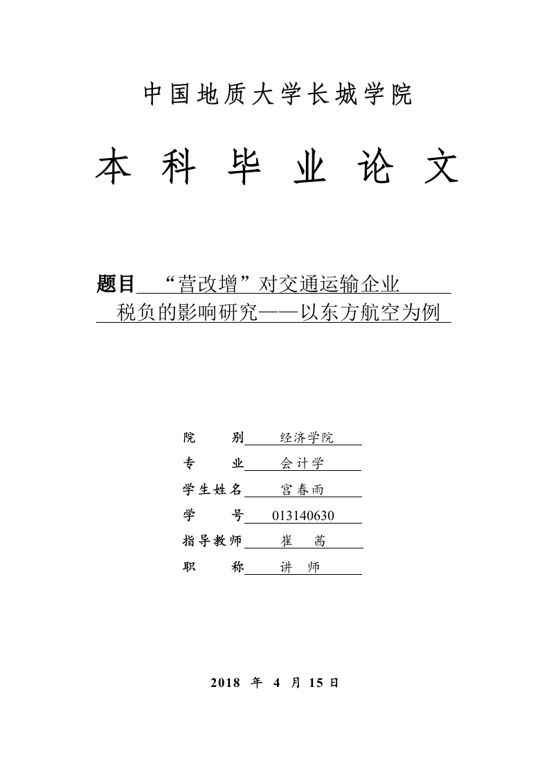 中国地质大学长城学院本科毕业论文题目“营改增”对交通运输企业税负的影响研究一一以东方航空为例院别经济学院专业会计学学生姓名宫春雨学号013140630指导教师崔茜职称讲师2018年4月15日本科毕业生毕业论文(设计)诚信承诺书毕业论文“营改增”对交通运输企业税负的影响研究(设计)题目以东方航空为例学生姓名专业经济学学号013140630指导老师崔茜职称讲师所在院别经济学院诚信承诺本人慎重承诺和声明:我承诺在毕业论文(设计)活动中遵守学校有关规定,恪守学术规范,在本人的毕业论文中不剽窃、抄袭他人的学术观点、思想和成果,不篡改研究数据,如有违规行为发生,我愿承担一切责任,接受学校的处理。学生(签名):年月中国地质大学长城学院毕业论文任务书学生姓名宫春雨学号013140630专业班级会计学六班指导教师崔茜职称讲师位河北农业大学毕业论文题目“营改增”对交通运输企业税负的影响研究一一以东方航空为例毕业论文主要内容和要求:主要内容:本文主要分析“营改增”对交通运输企业税负的影响及对策问题,首先对交通运输业“营改增”的概念进行概述,分析东方航空“营改增”前后税负变动,对税负进行测算和比较,然后剖析“营改增”后对东方航空的税负产生的影响,最后对企业应对“营改增”政策提出一系列措施。要求:论文撰写要求思路清晰、内容充实、论点明确,论据充分,论证严密,语言通顺。撰写论文前应首先阅读相关的研究资料,掌握学术前沿动态,对相关理论著作要很好的把握,提高理论水平及思想深度。根据开题报告和老师提出的意见对论文提纲进行修改,确定大纲后认真撰写毕业论文。撰写论文结束后要根据老师的修改意见,认真反复的修改论文,并按照要求参加毕业论文的答辩,严格按照论文进度安排进行论文的写作。论文的格式、字数等撰写方面的要求参照《中国地质大学长城学院毕业论文(设计)撰写规范》。毕业论文主要参考资料:[1]张慧.“营改增”对交通运输行业税收筹划的影响探讨[J刀.时代金融,2017,(05):221-222.[2]杨文.“营改增”对交通运输业的影响研究[J刀.商业会计,2017,(07):101-103.[3]张睿.“营改增”对交通运输业税负的影响及对策研究[J刀.时代农机,2017,(02):135-136.[4]郭伟.论“营改增”对交通运输业的影响[J刀.行政事业资产与财务,2017,(16):30-32.[5]刘玮玮.对“营改增”后航空运输企业税负变化的分析[J刀.中国国际财经,2017,(15):89.[6]党永怡.论“营改增”对交通运输业的税负影响[J刀.企业经营,2017,(13):157-158.[7]程清雅.“营改增”对行业税负的影响[J刀.财税金融,2017,(17):47.[8]王立群.“营改增”对交通运输业的影响分析[J刀.中国总会计师,2017,(06):150-151.[9]祁金祥.“营改增”对交通运输企业税负影响研究[J刀.当代会计,2017,(10):1920.[10]蒋雯婕.“营改增”后航空运输企业税负变化分析[J刀.当代经济,2017,(23):36-37[11]金莲花、董焱.“营改增”对企业税负的不同影响[J刀.会计之友,2017,(23):98-103.[12]刘海涛、孙冬石.“营改增”政策对交通运输业的税负影响对策分析[J刀.物流工程与管理,2017,(05):140-141.[13]Michael Keen,Ben Lockwood.The value added tax:Its causes and consequences [J].Joumalof Development Economics,2010,(09),pp.138-151.