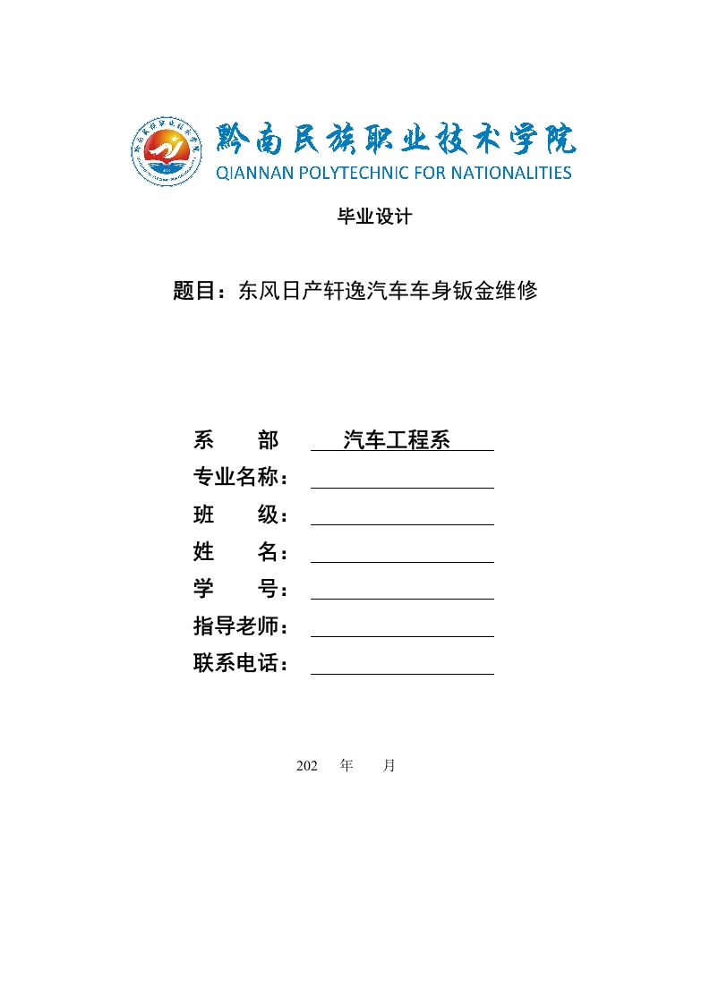 之QIANNAN POLYTECHNIC FOR NATIONALITIES毕业设计题目:东风日产轩逸汽车车身钣金维修系部汽车工程系专业名称:班姓学号指导老师:联系电话:202年月黔南民族职业技术学院高职毕业论文(设计)诚信责任书本人郑重声明:本人所呈交的毕业论文(设计),是独立进行研究所完成。毕业论文(设计)中凡引用他人已经发表或未发表的成果、数据、观点等,均已明确注明出处。特此声明。论文(设计)作者签名:日期:目录2.案例分析.…2.1.车身拉伸修复分析...3案例启示33.1.对车身损伤认定的基本方法及该车的损伤程度…33.2.根据对事故车的测量和查看确定修复方案......43.3.对车身进行拉伸修复及修复方法的分析.·6