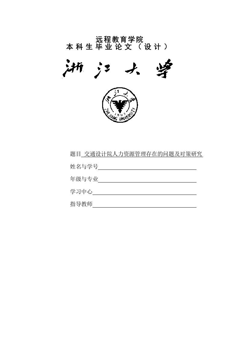 远程教育学院本科生毕亚论文(设计)题目交通设计院人力资源管理存在的问题及对策研究姓名与学号年级与专业学习中心指导教师浙江大学远程教育学院本科毕业论文(设计)摘要目前,经济发展正处于知识经济时代,该时代的进步不仅需要信息技术和科学技术的支撑,还需要充分发挥人力资源的推动作用,尤其是民营企事业单位。人力资源是知识经济时代的主要竞争力,民营企事业单位可持续发展的核心是人力资源的管理。人力资源管理相关问题一直是管理学中研究的热点话题之一,人力资源管理也属于“老生常谈”的话题之一。人力资源管理之所以能够一直成为研究的热点之一,关键在于人力资源管理具有“时代性”,即随着时间的不断演进,经济发展会呈现出不同的时代特征,而处于不同经济发展阶段的企事业单位人力资源管理的方式和要求也不相同。相较传统的人力资源管理,知识经济时代的人力资源管理需要顺应时代发展的大趋势。本文首先说明人力资源管理的相关理论与发展现状。然后,以交通设计院为分析案例,在对交通设计院人力资源管理现状分析的基础上,深刻剖析交通设计院人力资源管理问题研究,找到交通设计院人力资源管理中存在问题,针对这些问题提出相应的对策建议。关键词交通设计院人力资源管理存在问题对策浙江大学远程教有学院本科毕业论文(设计)AbstractAt present,economic development is in the era of knowledge economy.Theprogress of this era not only needs the support of information technology and scienceand technology,but also needs to give full play to the promotion of human resources,especially private enterprises and institutions.Human resources are the maincompetitiveness in the era of knowledge economy.The core of sustainabledevelopment of private enterprises and institutions is the management of humanresources.Human resource management related issues have always been one of thehot topics in management research,and human resource management is also one ofthe topics of"old talk".The key to human resource management has always been oneof the research hotspots.The key point is that human resource management has the"age",that is,with the continuous evolution of time,economic development willshow different characteristics of the times,and at different stages of economicdevelopment.The methods and requirements for human resources management inenterprises and institutions are also different.Compared with traditional humanresource management,human resource management in the era of knowledgeeconomy needs to conform to the general trend of the times.This paper first explains the relevant theories and development status ofhuman resource management.Then,taking the Transportation Design Institute as ananalysis case,based on the analysis of the current situation of human resourcesmanagement in the Transportation Design Institute,the paper deeply analyzes theresearch on the human resources management of the Transportation Design Institute,finds the problems in the human resources management of the Transportation DesignInstitute,and proposes these problems.Corresponding countermeasures.Key words traffic design institute,human resource management,problem,countermeasure