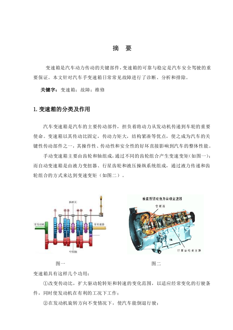 摘要变速箱是汽车动力传动的关键部件,变速箱的可靠与稳定是汽车安全驾驶的重要保证。本文针对汽车手变速箱日常常见故障进行了诊断、分析和排除。1.变速箱的分类及作用汽车变速箱是汽车的主要传动部件,担负着将动力从发动机传递到车轮的重要使命。变速箱以其传动比固定,传动力矩大,结构紧凑等优点,使之成为汽车的关键性传动部件之一,其操作性、传动性和安全性的好坏直接影响到汽车的整体性能。手动变速箱主要由齿轮和轴组成,通过不同的齿轮组合产生变速变矩(如图一):而自动变速箱是由液力变扭器、行星齿轮和液压操纵系统组成,通过液力传递和齿轮组合的方式来达到变速变矩(如图二)。前置后驱动液力自动变速器图一图二变速箱具有这样几个功用:①改变传动比,扩大驱动轮转矩和转速的变化范围,以适应经常变化的行驶条件,同时使发动机在有利的工况下工作:②在发动机旋转方向不变情况下,使汽车能倒退行驶:③利用,空挡中断动力传递,以发动机能够起动、变速,并便于变速器换档或进行动力输出。2变速箱常见的故障及维修2.1手动变速箱手动变速箱轿车在日让生活中非常常见,他是通过手动改变汽车档位,从而改变汽车的动力和速度。一般手动变速箱的档位如图3所示:图三2.1.1.挂不上档,自动脱档,乱档及有噪声(1)挂不上挡常见原因①变速箱拨叉松动或变形:②变速轴上的定位槽与定位销磨损,表面产生不规则的台阶,在变速时卡住;变速箱变形:③锁紧连动拉杆松脱或调整不当:④锁定轴限制螺钉等松动等。当然,当离合器分离不彻底、小制动器失灵时也会造成挂不上挡。(2)自动脱挡常见原因①挡位齿轮端面磨损过大,使齿轮啮合面太短,并且齿身磨锥形而产生轴向力,导致脱挡:②定位销折断、定位钢球失效,由振动而引起脱挡:③拨叉与齿轮拨叉槽磨损、拨叉松动,引起滑动齿轮产生轴向窜动导致脱挡。(3)乱挡常见原因①定位销、定位钢球弹簧失效或折断:②变速杆头和与它配合变速轴过度磨损:③定位导板过度磨损等。(4)在使用中有噪声①变速箱内更换或修复的齿轮齿侧间隙过小,或者齿轮在长期工作中产生磨损使齿侧间隙过大,都会因啮合不良而发出噪声。②滚动轴承或隔离圈磨损,变速箱内缺少润滑油,均可使变速箱在工作中产生异常噪声。2.1.2齿轮的修理①换向法齿轮单面磨损后,结构答应时可调换位置或翻转180度使用。②镶齿圈法塔形齿轮是由数个齿轮合在一起的,各个齿轮的磨损程度不尽相同。假如仅个别齿轮的轮齿磨损超限,保用更换齿圈的方法修复。方法是先将待修复的齿轮进行退火处理,撤去全部轮齿,另外制造一个圈压装在撤去轮齿处。G镶齿法对负荷不大、转速不高的齿轮,个别被打掉后,可用镶齿法进行局部修复。方法是将齿根部位在机床上蚀出或铣出燕尾槽,以一定的过盈量把与槽型相同的新齿胚压入,焊牢后整形。④堆焊法当齿轮的个别轮齿崩落,或齿面、齿端磨损超限时,可根据其损坏程度,进行堆焊修复。焊前用汽油或热碱水将齿轮表面的油垢和锈蚀清洗干净,露出金属光泽。施焊用的电焊条应尽量与齿轮材料相同或相近。堆焊修复并经机订加工恢复齿形后,为消除内应力,必须将修复的齿轮进行回火处理。2.1.3.壳体的修理①轴承座孔的修理当轴承座孔磨损过度时,可采用镗孔镶套的方法修复。镶套材料可选用20-40灰铸铁。镶套时,先将套外径尺寸加工好,压入轴承座孔后,再将套内径镗标准尺寸。镗削后的各轴孔,其圆柱度偏差应不大于0.03mm;同轴两孔的共同中轴线与加工后表面的垂直度偏差在100mm,长度不应不大于0.05mm;不同轴各