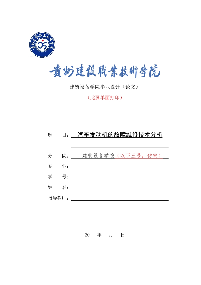 建筑设备学院毕业设计(论文)(此页单面打印)题目:汽车发动机的故障维修技术分析分院:建筑设备学院(以下三号,仿宋)专业:学号:姓名:指导教师:20年月日摘要社会经济的快速发展,人们生活水平的逐步提高,我们现在在家庭中可以看到汽车的使用率越来越高。由此而来,人们对于一辆汽车是否能够带来好的体验感?更加注重汽车发动机的稳定性和出故障率的高低。目前来看,曾经的简单的靠人工诊断汽车发动机的模式来提高发动机的稳定性,难以应对现在的人们需求,为了使发动机。更加稳定,提高我们对故障的排查能力。就需要我们在汽车发动机未发生故障之前,就要学会对他进行诊断与分析。本文围绕着发动机系统从以下的方方面面对发动机故障、基本故障进行介绍,并发生故障后,我们作为行车的人可以采用简单的方法。先行处理,然后再到专业的修理厂进行修理。这样一方面增加了驾驶人员的体验感,也可以提高我们发动机的使用效率,是未来汽车行业发发展的方向。关键词:汽车发动机:汽车发动机机械系统故障;可靠性:故障的维修:AbstractWith the rapid development of social economy and the gradual improvement of people'sliving standards,we can now see the increasing utilization rate of cars in our families.Thus,canpeople have a good experience of a car?Pay more attention to the stability of the automobileengine and the failure rate.At present,once the former simple mode of manual diagnosis ofautomobile engine to improve the stability of the engine,it is difficult to cope with the needs ofpeople now,in order to make the engine.More stable,improve our ability to detect faults.Itrequires us to learn how to diagnose and analyze the car engine before it breaks down.This paperfocuses on the engine system from the following aspects of the engine failure,basic failureintroduction,and after the failure,we can use a simple method.First processing,and then to aprofessional repair shop for repair.On the one hand,this increases the experience of drivers,andalso improves the use efficiency of our engine,which is the future development direction of theautomobile industry.Key words:automobile engine;automobile engine mechanical system failure;reliability;fault maintenance;2