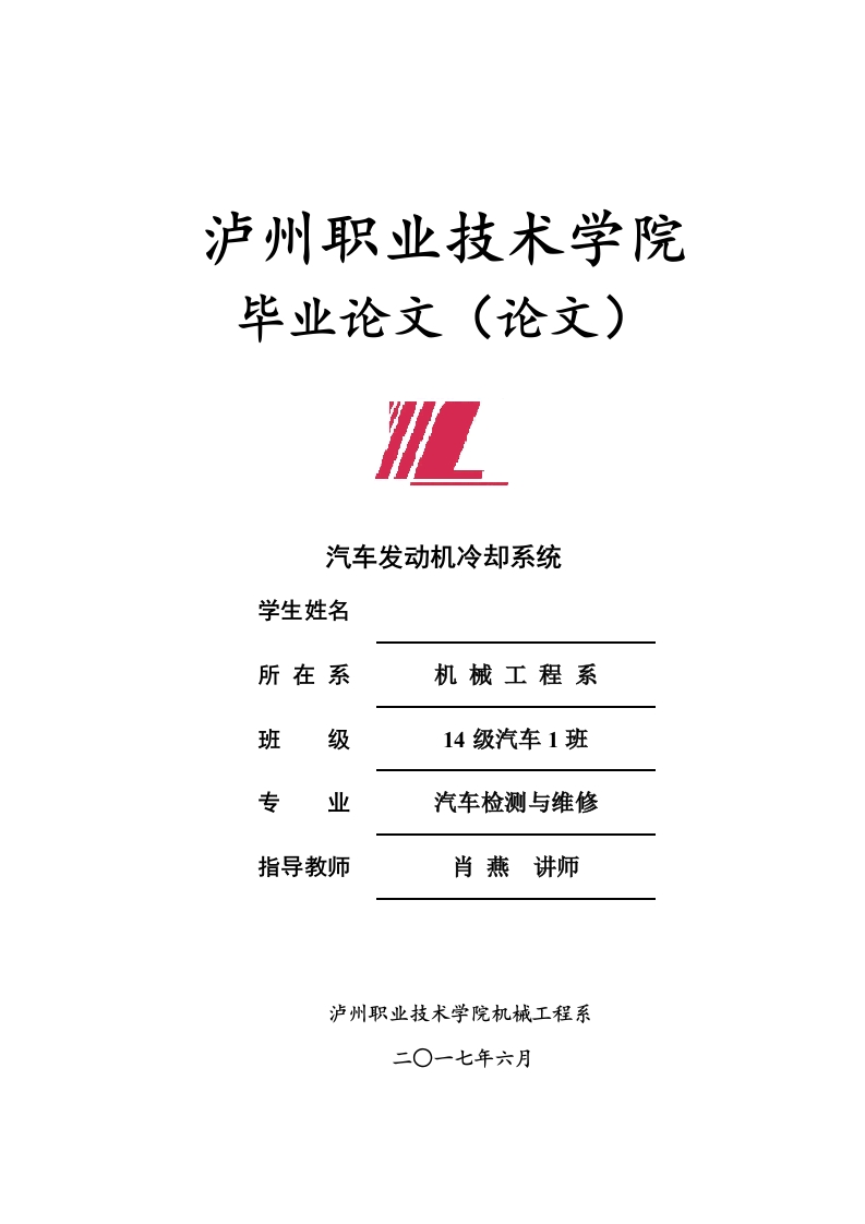 泸州职业技术学院毕业论文(论文)L汽车发动机冷却系统学生姓名所在系机械工程系班级14级汽车1班专业汽车检测与维修指导教师肖燕讲师泸州职业技术学院机械工程系二O一七年六月指导教师评阅书指导教师评价:一、撰写(设计)过程1、学生在论文(设计)过程中的治学态度、工作精神口良口及格口不及格2、学生掌握专业知识、技能的扎实程度口及格口不及格3、学生综合运用所学知识和专业技能分析和解决问题的能力口中口及格口不及格4、研究方法的科学性、技术路线的可行性、设计方案的合理性口及格口不及格5、完成毕业论文(设计)期间的出勤情况口良口中口及格口不及格二、论文(设计)质量1、论文(设计)的整体结构符合撰写规范的程度口良口中口及格口不及格2、完成指定论文(设计)任务(包括装订及附件)情况口良口中口及格口不及格三、论文(设计)水平1、论文(设计)的理论意义或对解决实际问题的指导意义口良口中口及格口不及格2、论文观念的新意性、设计的创意性口良口中口及格口不及格3、论文(设计说明书)所体现的整体水平口良口中口及格口不及格建议成绩:口优口良口中口及格口不及格(在所选等级前的口内画“√”)指导教师:(签名)单位:(盖章)年月日评阅教师评阅书评阅教师评价:一、论文(设计)质量1、论文(设计)的整体结构符合撰写规范程度口良口及格口不及格2、完成指定论文(设计)任务(包括装订及附件)情况口中口及格口不及格二、论文(设计)水平1、论文(设计)的理论意义或对解决实际问题的指导意义口中口及格口不及格2、论文观念的新意性、设计的创意性口中口及格口不及格3、论文(设计说明书)所体现的整体水平口不及格建议成绩:口优口良口中口及格口不及格(在所选等级前的口内画“√”)评阅教师:(签名)单位:(盖章)年月日