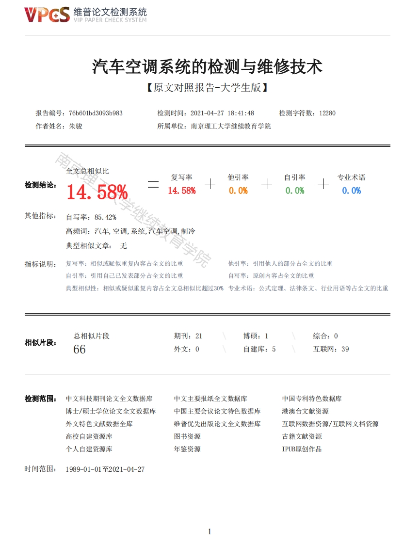 维普论文检测系统/IP PAPER CHECK SYSTEM汽车空调系统的检测与维修技术【原文对照报告-大学生版】报告编号:76b601bd3093b983检测时间:2021-04-2718:41:48检测字符数:12280作者姓名:朱骏所属单位:南京理工大学继续教育学院全文总相似比复写率他引率自引率专业术语检测结论:14.58%14.58%0.0%0.0%0.0%其他指标:自写率:85.42%高频词:汽车,空调,系统,汽车空调,制冷典型相似文章:无指标说明:复写率:相似或疑似重复内容占全文的比重他引率:引用他人的部分占全文的比重自引率:引用自己已发表部分占全文的比重自写率:原创内容占全文的比重典型相似性:相似或疑似重复内容占全文总相似比超过30%专业术语:公式定理、法律条文、行业用语等占全文的比重总相似片段期刊:21博硕:1综合:0相似片段:66外文:0自建库:5互联网:39检测范围:中文科技期刊论文全文数据库中文主要报纸全文数据库中国专利特色数据库博士/硕士学位论文全文数据库中国主要会议论文特色数据库港澳台文献资源外文特色文献数据全库维普优先出版论文全文数据库互联网数据资源/互联网文档资源高校自建资源库图书资源古籍文献资源个人自建资源库年鉴资源IPUB原创作品时间范围:1989-01-01至2021-04-27维普论文检测系统VIP PAPER CHECK SYSTEM原文对照颜色标注说明:■自写片段■复写片段(相似或疑似重复)口引用片段(引用)■专业术语(公式定理、法律条文、行业用语等)南京理工大学毕业设计说明书(论文)大学作者:朱骏学号:17321510375教学点:扬州高等职业技术学校专业:车辆工程题目:汽车空调系统的检测与维修技术助教姜欣悦指导者:(姓名)(专业技术职务)林海翔助教评阅者:(姓名)(专业技术职务)2021年2月南京理工大学毕业设计(论文)评语学生姓名:朱骏准考证号:17321510375题目:汽车空调系统的检测与维修技术综合成绩:指导者评语:这位同学的论文选题存在肯定的实际价值,在论文创作过程中态度相比较还是端正的,能够自主的翻阅图书与搜集材料,并且能够提出与课题紧密结合的实施计划:在写论文过程中能够将所学的理论知识与实践能力相结合,提出问题并解决问题。文章构造安排紧凑自然,逻辑见微知著,意思阐述透彻,表达言语通畅,论证措施合理,借鉴的图书资料贴切主题的要求,从选题到正文都很合乎本专业的要求,但是不足的是有的内容连接的比较紧密,部分参考的引文没有标明出来,缺乏本人革新的内容,部分概念表达含糊不清,这点需要加强。论文阐释完整,说明逻辑比较缜密、结构安排合理、论断没有出现错误,但是在内容上有待进一步深化了解。论文格局基本上论文写作要求相符,毫无二致:总的来说到达了本科毕业论文要求。可以提交答辩。成绩评定为:指导者(签字):2维普论文检测系统VIP PAPER CHECK SYSTEM年月日毕业设计(论文)评语评阅者评语:该生的选题具存在某种的生活意义。该同学能够比较全面地完成毕业论文的任务,方案合理、方法正确,能综合运用本专业的基础知识,解析问题和处理问题的本事较强。综合运用知识能力强。论文格局契合标准要求:参考了很多具有价值的文献材料。论文书写格式比较标准。界面设计合理,文档齐全。综合看来,批准该同学的论文答辩。同意提交答辩。建议成绩为:评阅者(签字):年月日答辩委员会(小组)评语:朱骏同学全面地介绍了毕业设计完成的各项工作。在答辩时,阐述条理清晰,回答问题正确。反映出该生较全面地掌握了本专业相关的基础理论和专业知识,具有较好的逻辑思维能力和口头表达能力。答辩小组全体成员经过认真讨论,一致通过该同学的毕业设计答辩,成绩评定为良好。成绩评定为:良分答辩委员会(小组)负责人(签字):年月日毕业设计说明书(论文)中文摘要现如今我们的物质生活水平已经越来越高,中国社会迅速发展,汽车数量正在日益增加,并且呈现出了指数式的增长,汽车的各项功能不断得到改善空调系统是电动车不可或缺的重要部件。汽车空调系统通常是由制冷系统,暖风系统,通风系统,净化系统,温度控制系统组成,而空调制冷系统一般是由压缩机,冷凝器,储液干燥器,膨胀阀,蒸发器,鼓风机组成。汽车空调系统可以自动调节汽车内的温度,湿度以及清新度等,保证车内舒适的环境。讲述了汽车空调系统的分类与汽车空调系统工作的原理。还对汽车空调系统的故障进行了简单的阐述,当汽车空调不制冷时会出现的故障与汽车空调的诊断方,并且对汽车空调的制冷剂进行了简单的介绍。本文主要介绍了汽车空调系统的发展历程、组成和运行原理,还对汽车空调系统的检测方法进行了阐述。关键字:汽车空调系统组成工作原理检测目录1绪论11.1汽车空调系统检测与维修的背景及意义11.2汽车空调系统检测与维修的研究现状12汽车空调系统的发展历程42.1汽车空调的过去与未来42.2汽车空调系统的特点52.3汽车空调系统的性能评价指标73汽车空调系统的概述93.1汽车空调系统主要功能93.2汽车空调系统的分类93.3汽车空调系统的组成93.4汽车空调系统的工作原理124汽车空调系统的检测与维修技术144.1汽车空调系统常见的故障144.2汽车空调不制冷144.3诊断与检测方法144.4制冷剂的补充16结论183
