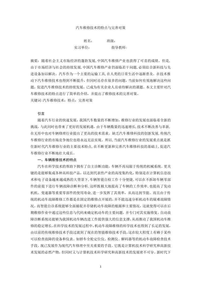 汽车维修技术的特点与完善对策姓名:班级:实习单位:指导教师:摘要:随着社会主义市场经济的蓬勃发展,中国汽车维修产业也获得了可喜的成绩。但是,由于市场经济与社会的持续发展,中国汽车维修产业仍面临若干问题,必须结合新科技与先进设备加以解决。汽车作为一个主要的运输工具,在人类的日常生活中逐渐普及。在技术推动下汽车维修技术也得到不断提升,但同时还存在很多的问题,当前如何有效地解决这些问题,促进汽车维修技术的持续发展,已成为有关企业人员亟待解决的课题。本文主要针对汽车维修技术的特点进行了简单的介绍,并提出了维修技术的完善对策。关键词:汽车维修技术:特点:完善对策引言随着汽车行业的快速发展,我国汽车数量的不断增加,维修行业的发展也面临着全新的挑战,与此同时也带来了更好的发展机遇。由于车辆数量的迅速增长,技术不断改善与革新,在无形中也对车辆修理行业提出了更高的技术需求。缺乏汽车维修科技的创新发展,传统汽车维修行业的市场竞争地位也将永远无法实现。所以,当前汽车维修行业的发展重点就是抓住新时代汽车维修行业的主要技术特点,在不断更新和完善汽车维修科技的基础上,促进汽车维修行业不断地壮大成长。一、车辆维修技术的特点汽车在科学技术的帮助下拥有了自主诊断功能,车辆不再局限于传统的机械系统。更关键的是能够集成各种高科技产品,以达到代表性产业的高度集约化,特别是在计算机信息技术和电子设备越来越成熟的大背景下,车辆智能自检工作十分便捷,可以在不拆卸车辆零部件的前提下进行车辆故障诊断和分析,这样既极大地提高了车辆的工作效率,也提高了发动机机、变速器等重要零部件的使用寿命,进一步发挥了其效率,从而达到节能。而且由于传统的机动车故障维修工作都是在固定的维修点开展的,并不能迅速分析机动车的疑难故障情况。而智能自诊系统能够全面捕捉并存储机动车故障的根源和主要情况,这就使得可以在后期维修作业中通过这些信息与代码来确定机动车的主要问题,并专门对其实施修复。自动故障诊断系统还能够为我国机动车辆改进工作提供强大的信息支撑,从而推动了我国机动车维修的稳定增长。在科学技术的发展过程中,机动车故障维修的科学技术也得到了长足的发展,由以前的传统维修技术手段过渡到了现在的智能维修技术手段,这在较大程度上有赖于某些可以检查故障的设备和仪表。如轿车全轮定位仪、检测仪、解码器等的机动车故障检查技术手段。现己发展作为现代汽车修理中至关重要的手段。它既是计算机技术科学研究和高新技术发展的必然产物,但同时又与计算机技术科学研究和高新技术的发展密不可分。新时代下的维修方法只需将诊断仪连接到车辆软件系统上,维修人员就可以直接判断故障进行维修。在信总网络技术的支持下,给各个行业的发展都带来了便利,通过不断完善和优化,为自身的发展找到起点。从汽车的整体结构分析,在相关科学技术的支持下,汽车的控制技术和安全保护功能都得到了极大地提高。随着汽车行业的高速发展以及车辆功能的革新,维修检验仪器设备更新换代速度提高了,对维修技术人员也提出了新的要求,维修人员知识或技术经验的缺乏给维修人员的实际管理带来了许多不利因素。但是,由于互联网技术的发达,车辆维修技术人员能够按照车辆的型号或特定零部件在网站查询相应的技术资讯,而且能够直接联络车辆厂家,查询车辆的基本信息数据,这对于车辆维护有着极大的帮助。为了有效提高汽车维修技术相关技术人员的培训至关重要。但是我国在车辆维修网络应用方面起步较晚,但是由于互联网的广泛应用,维修技术人员能够学握到许多国外领先的维修技术,这可以提升我国车辆的整体维修技术水平。二、汽车维修技术完善对策(一)加强对维修技术人员的技术培训随着社会经济的持续发展以及汽车维修行业维修技术的不但更新,更多的新型科学技术涌现于汽车维修行业。由于汽车维修行业人员的汽车维修技术较少,因此行业需要定期地对有关人员开展培训,以增强技术人员对新时期不同汽车市场和最新前沿科技的认识,从而提高了汽车维修技术人员的专业知识,进一步提升汽车维修人员的专业技能。与此同时,促进了汽车维修行业人员的思维变革,使员工逐步脱离了传统意义上的汽车维修行业引导潮流的思维思想,逐步接触新时代网络化技术和先进计算机科学的汽车维修理念,使维修人员更快地适应最新的汽车维修技术和更先进的汽车维修设备。经过培训汽车维修人员的技术水平已经可以满足汽车维修产业发展的需求,与经济社会发展相协调,进一步提升汽车维修行业工作人员的综合水平,从而实现汽车维修行业的高速发展。(二)加强车辆维修的质量和监控车辆维护技术人员在工作中必须关心的一项问题就是怎样提高维修质量,这不但关系到维修企业的发展与信誉,而且关系到车辆乘员的安全。所以,在此基础上,就有必要加大对设备维修质量的监测。以便对人员进行约束和精心维修,确保汽车的维修质量。首先,要严格管理车辆维修质量控制。维修后,必须重新测试车辆,以查看故障是否己全部排除,如果仍然存在质量问题,则继续维修,直到故障完全消除。并将这些维修数据及时存