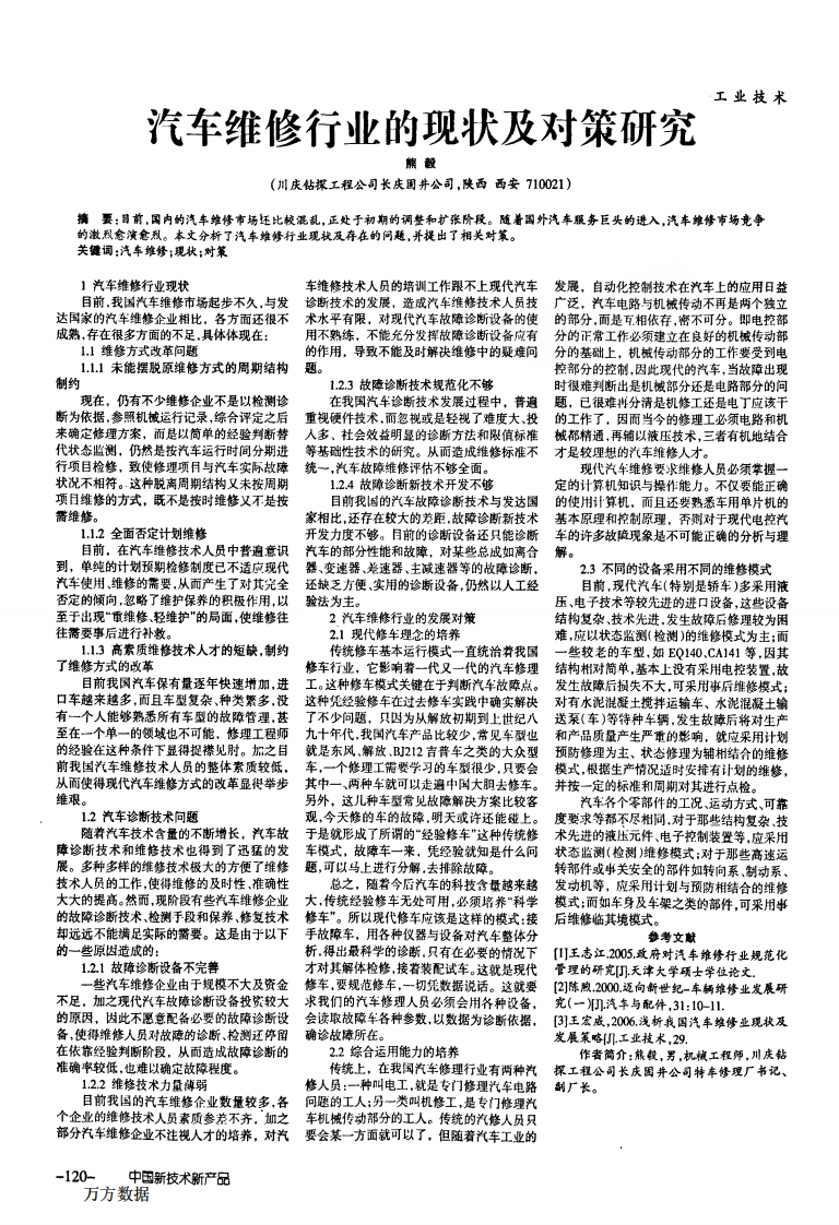 工业技术汽车维修行业的现状及对策研究(川庆钻探工程公司长庆国井公司,陕西西安710021)精要:昌前,国内的汽车维修市场还比校混乱,正处于初期的调整和扩张阶段。随着国外汽车服务巨头的进入,汽车维修布场竞争的激烈愈演愈烈。本文分析了汽车维修行业现找及存在的问题,并提出了相关对策。1汽车维修行业现状车雏修技术人员的培训工作跟不上现代汽车发展,自动化控制技术在汽车上的应用日益目前,我因汽车维修市场起步不久,与发诊断技术的发展,造成汽车维修技术人员技广泛,汽车电路与机械传动不再是两个独立达倒家的汽车维修企业相比,各方面还很不术水平有限,对现代光车故障诊断设备的使的部分.而是可相依存,密不可分。即电控部成熟,存在很多方面的不足,具体体现在:用不熟练,不能充分发挥故障诊断设备应有分的正常工作必须建立在良好的机械传动部11维修方式改革问题的作用,导致不能及时解决维修中的疑堆问分的基础上,机械传动部分的工作要受到电111未能摆脱原维修方式的周期结构题。控部分的控制,因此现代的汽车,当故障出现制约12,3故障诊断技术规范化不够时很难判断出是机械部分还是电路部分的问现在,仍有不少维修企业不是以枪测诊在我国汽车诊断技术发展过程中,普意题,已很难科分清是机修工还是电丁应该干断为依据,参照机械运行记录,综合评定之后重视硬件技术,而忽视或是轻视了难度大、投的工作了,因而当今的修理工必须电路和机来确定修理方案,而是以简单的经险判断替人多、社会效益明显的诊断方法和限值标准城都精通,再辅以液压技术,三者有机地结合代状态监测,仍然是按汽车运行时间分期进等基础性技术的研究。从而造成维修标准不才是较理想的汽车维修人才。行项目检修,致使修理项月与汽车实际故障统一,汽车故障雏修评估不够全面。现代汽车维修要求维修人员必须掌握一状况不相符。.这种脱离周期结构义未按周期12.4故障诊断新技术开发不够定的计算机知识与操作能力。不仅要能正确项日维修的方式,既不是按时维修又不是按目前我国的汽车故障诊断技术与发达国的使用算机,而且还要熟悉车用单片机的需维修。家相比,还存在较大的差距,故障诊断新技术基本原理和控制原理,否则对于现代电控汽开发力度不够。目前的诊断设备还只能诊断车的许多故硫现象是不可能正确的分析与理目前,在汽车维修技术人员中普遍意识汽车的部分性能和故障,对某些总成如离合解。到,单纯的计划预期检修制度已不适应现代23不同的设备采用不同的维修模式汽车使用、维修的需要,从而产生了对其完全还缺乏方便、实用的诊断设备,仍然以人工经目前,现代汽车(特别是轿车)多采用液否定的倾向,忽略了维护保养的积极作用,以验法为主。压、电子技术等较先进的进口设备,这些设备至于出现“重维修、轻维护"的局面,使维修往2汽车锥修行业的发展对策2.1现代修车理念的培养难,应以状态监测(检测)的维修模式为主:而113高素质维修技术人才的短缺,制约传统修车基本运行模式一直统治普我国些较老的车型,如EQ140,CA141等,因其了维修方式的改革悠车行业,它影响着一代又一代的汽车锋理结构相对简单,基本上没有采用电控装置,故目前我国汽车保有量逐年快速增加,进工。这种修车模式关键在于判断汽车故障点。发生故障后损失不大,可采用事后维修模式:口车越来越多,而且车型复杂、种类繁多,没这种凭经验修车在过去修车实践中确实解决对有水泥混凝土搅拌运输车、水泥混凝土输有一个人能够熟悉所有车型的故障管理,甚了不少问题,只因为从解放初期到上世纪八送泵(车)等特种车辆,发生故障后将对生产至在一个单一的领域也不可能,修理工程师九十年代,我国汽车产品比较少,常见车型也和产品质量产生严重的彩响,就应采用计划的经验在这种条件下显得捉襟见肘。加之目就是东风,解放,BU212吉普车之类的大众型预防修理为主、状态修理为辅相结合的维修前我国汽车维修技术人员的整体素质较低,车,一个修理工需要学习的车型很少,只要会摸式,根据生产情况适时安排有计划的维修,从而使得现代汽车维修方式的改革显得举步其中一、两种车就可以走遍中时大胆去修车。并按一定的标准和周期对其进行点检。维艰。另外,这儿种车型常见故障解决方案比较客汽车各个零部件的工况、运动方式、可靠1.2汽车诊断技术问题观,今天修的车的故障,明天或许还能碰上。度要求等都不尽相同,对于那些结构复杂技随着汽车技术含量的不断增长,汽车故于是就形成了所谓的“经验修车"这种传统修术先进的液压元件、电子控制装坐等,应采州障诊断技术和维修技术也得到了迅猛的发车模式,故障车一来,凭经验就知是什么问状态监测(检剥)维修模式:对于那些高速运展。多种多样的雏修技术极大的方便了维修题,可以马上进行分解,去排除故障。转部件或事关安全的部件如转向系,制动系、技术人员的工作,使得维修的及时性,准确性总之,随着今后汽车的科技含量越来超发动机等,应采用计划与预防相结合的维修大大的提高。然而,现阶段有些汽车维修企业大,传统经验修车无处可用,必须培养“科学模式:而如车身及车架之类的部件,可采用华的故障诊断技术、检测手段和保养,修复技术修车”。所以现代修车应该是这样的