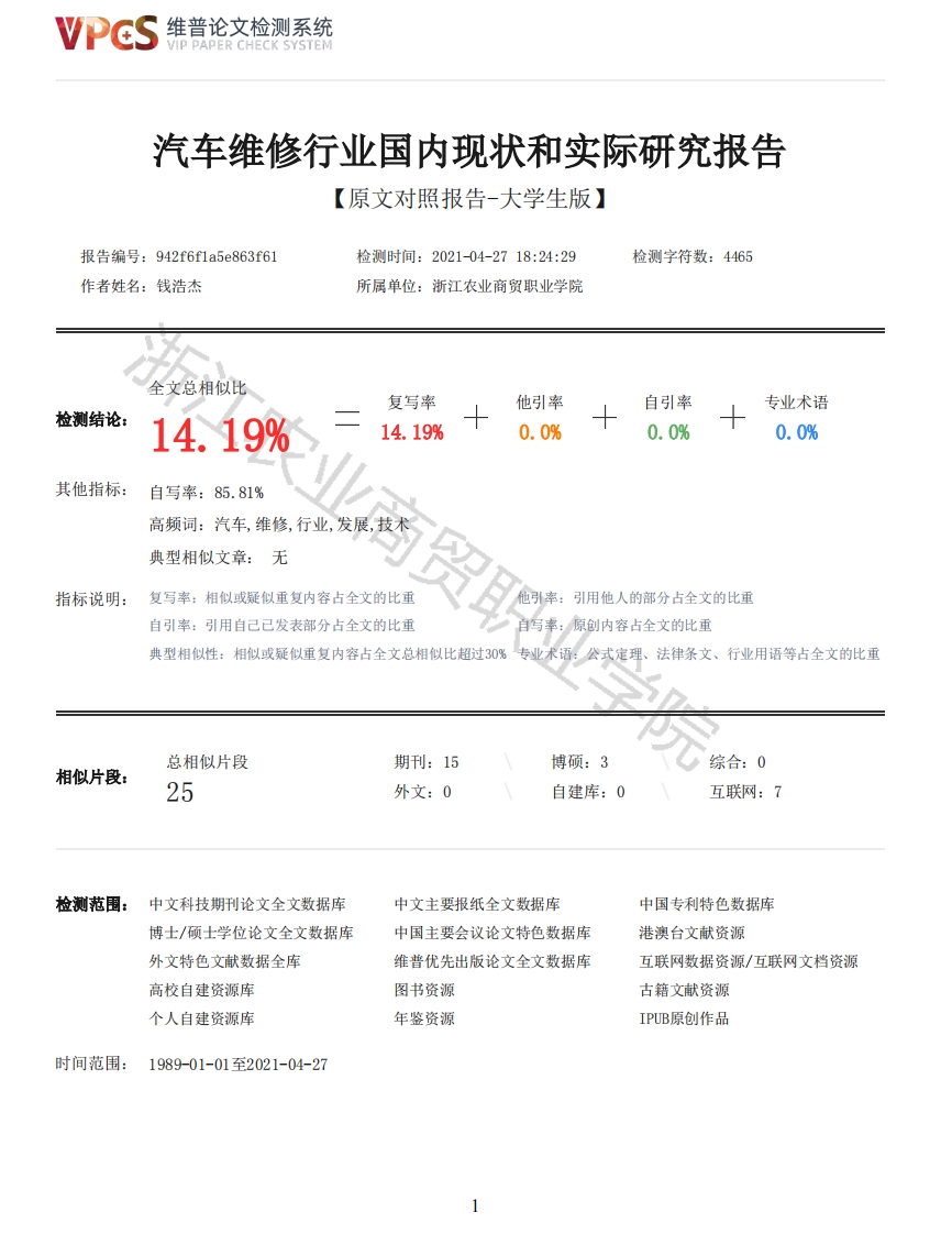 维普论文检测系统VIP PAPER CHECK SYSTEM汽车维修行业国内现状和实际研究报告【原文对照报告-大学生版】报告编号:942f6f1a5e863f61检测时间:2021-04-2718:24:29检测字符数:4465作者姓名:钱浩杰所属单位:浙江农业商贸职业学院全文总相似比复写率他引率自引率专业术语检测结论:14.19%14.19%0.0%0.0%0.0%其他指标:自写率:85.81%高频词:汽车,维修,行业,发展,技术典型相似文章:无指标说明:复写率:相似或疑似重复内容占全文的比重他引率:引用他人的部分占全文的比重自引率:引用自己已发表部分占全文的比重自写率:原创内容占全文的比重典型相似性:相似或疑似重复内容占全文总相似比超过30%专业术语:公式定理、法律条文、行业用语等占全文的比重总相似片段期刊:15博硕:3综合:0相似片段:25外文:0自建库:0互联网:7检测范围:中文科技期刊论文全文数据库中文主要报纸全文数据库中国专利特色数据库博士/硕士学位论文全文数据库中国主要会议论文特色数据库港澳台文献资源外文特色文献数据全库维普优先出版论文全文数据库互联网数据资源/互联网文档资源高校自建资源库图书资源古籍文献资源个人自建资源库年鉴资源IPUB原创作品时间范围:1989-01-01至2021-04-27维普论文检测系统VIP PAPER CHECK SYSTEM原文对照颜色标注说明:■自写片段■复写片段(相似或疑似重复)引用片段(引用)■专业术语(公式定理、法律条文、行业用语等)1979Zhejiang Agricultural Business College毕业论文(设计)题目汽车维修行业国内现状和实际研究报告专业班级汽车服务与营销201943班学号20191225329姓名钱浩杰指导教师李佳民2021年4月20日商贸职业学院汽车维修行业国内现状和实际研究报告摘要随着人们生活水平的不断提高,汽车已经逐渐成为人们重要的交通工具。而汽车保险、汽车维修、汽车美容等行业也作为市场持续增长的巨大动力迅速发展,其中汽车维修行业尤为重要。但是,目前的汽车维修行业与国外相比,在很多方面都存在着差异。时代以及社会经济的快速发展不仅在一定程度上促进了国民的日常生活水平与质量的提升,还有效促进了我国汽车销量的逐年上涨以及汽车维修行业的良好发展。但据相关调查显示,汽车维修行业在获得良好发展的同时也存在一些问题,而这些问题的存在在一定程度上阻碍了我国汽车维修行业的深入发展与进步。因此,本文针对当前我国汽车维修行业的发展趋势以及现状进行了简单的阐述,提出了几点有效促进汽车维修行业长远发展的对策,希望可以给大家带来一定的帮助。关键词:汽车维修行业现状发展对策目录引言11我国汽车维修行业的特点12我国汽车维修行业的现状12.1汽车维修观念落后12.2汽车维修技术较低22.3汽车维修行业监管不到位23汽车维修行业发展对策33.1建立汽车维修行业相关规章制度32维普论文检测系统VIP PAPER CHECK SYSTEM3.2提升汽车维修人员素质33.3注重汽车维修技术的提升44汽车维修行业发展趋势4结论5参考文献院6引言基于现代化生活背景下,汽车已经成为人们日常生活中必不可缺的一大交通工具。随着时间的不断推移,绝大多数品牌汽车在日常使用过程中会逐渐出现各种各样的小毛病与大问题,但无论是小毛病还是大问题都会影响到汽车的性能以及安全性。因此,汽车维修行业得以诞生。基于新时代视域下汽车维修行业可谓是一项朝阳产业,具有强大生命力的、能使技术突破创新并以此带动企业发展的产业,市场前景广阔,一定条件下可演变为主导产业甚至是支柱产业。但实际上与自行车、电车维修有所不同,汽车维修具有一定的复杂性与难度性。如果汽车维修行业想要获得稳定且长远的发展,那么就必须要积极改变行业乱象、提升行业整体水平。1我国汽车维修行业的特点在汽车广泛普及的今天,当前我国汽车维修行业已经逐具规模且有了特定的服务对象以及特点。具体来说当前我国汽车维修行业具有以下特点:第一,社会分散性较强。虽然当前我国大多数汽车维修行业已经拥有了一定的规模,但总体上还是呈现出一种分散性状态,普遍都是一种独立经营且独立管理的模式,根本没有形成集约化模式。第二,多样化的维修种类。多数汽车维修行业对于汽车维.修都缺乏一个明确的维修定位。除此之外还存在一种隶属关系复杂的现象。其中最为明显的就是部分汽车维修归属于汽车厂商,而有的汽车维修则是归属于个体经营。第三,汽车维修技术分布混乱且缺乏强大维修技术支撑。据相关调查显示,大多数从事汽车维修的人员都没有经过正规的培训以及学习就获得了上岗资格。从规模上来进行分类的话,当前我国汽车维修行业可分为三大类:第一类,汽车大修以及整修的汽车维修企业:第二类,汽车小修或者进行-级维护的汽车维修企业:第三类,进行汽车专项修理或维护的汽车维修企业。2我国汽车维修行业的现状2.1汽车维修观念落后有一点是我们不得不承认的,那就是近年来我国汽车维修行业确实是获得了一个良好的发展,从近几年我国汽车维修企业逐渐增加的数量上我们就能够明显的看出来。但在发展的同时却还是没有能够突破传统维修观念的束缚,即便是基于新时代背景下,但大多数汽车维修人员还是在维持着上一代汽车维修人员的观念,也可以说他们还是习惯应用老式维修。针对一些非常简单且问题不是很大的汽车维修时看,还是一如既往习惯将