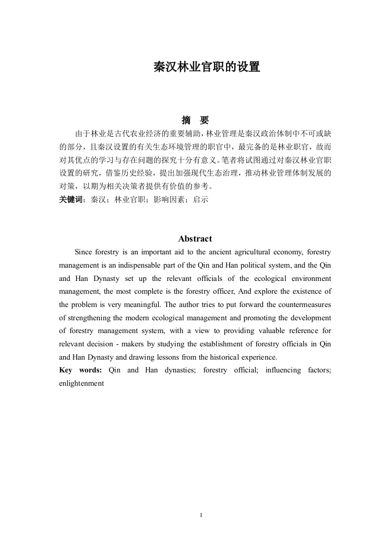 秦汉林业官职的设置摘要由于林业是古代农业经济的重要辅助,林业管理是秦汉政治体制中不可或缺的部分,且秦汉设置的有关生态环境管理的职官中,最完备的是林业职官,故而对其优点的学习与存在问题的探究十分有意义。笔者将试图通过对秦汉林业官职设置的研究,借鉴历史经验,提出加强现代生态治理,推动林业管理体制发展的对策,以期为相关决策者提供有价值的参考。关键词:秦汉;林业官职:影响因素:启示AbstractSince forestry is an important aid to the ancient agricultural economy,forestrymanagement is an indispensable part of the Qin and Han political system,and the Qinand Han Dynasty set up the relevant officials of the ecological environmentmanagement,the most complete is the forestry officer,And explore the existence ofthe problem is very meaningful.The author tries to put forward the countermeasuresof strengthening the modern ecological management and promoting the developmentof forestry management system,with a view to providing valuable reference forrelevant decision-makers by studying the establishment of forestry officials in Qinand Han Dynasty and drawing lessons from the historical experience.Key words:Qin and Han dynasties;forestry official;influencing factors;enlightenment目录摘要Abstract.、绪论…(一)研究背景1(二)研究目的及意义1(四)文献综述1(五)研究方法与思路…21.研究方法22.研究思路…二、秦汉林业官职设置概述3(一)多层次管理的林业官职…3(二)林业官职设置的特点…31.官职设置的实质目并非林业保护32.“重农”是官职设置的出发点33.官职设置具有继承的特点.34.官职设置的变动性强.…5.具备林木保护法律基础…三、秦汉林业官职设置的必要性4(一)林业是人们基本营生手段之41.人们材木需求旺盛…2.伐木运输的技术水平较高.4(二)林业与其他社会生产部门息息相关.4(三)林业生产重采伐、轻种植倾向严重.51.宫室建筑消耗严重.…52.厚葬之风兴盛,需要大量木材53.薪柴消费较高…54.车船营造对森林的破坏…5四、影响秦汉林业官职设置的因素66(二)道家的林业思想.6(三)日渐繁荣的林业经营.7(四)护林造林育林制度五、秦汉林业官职设置存在的问题探究7(一)山林职官职能逐渐弱化71.山林职官体系散乱2.职位级别普遍较低.83.专职林官减少8(二)林业官职设置随意性日渐增大81.官职设置存在临时性现象2.官职设置法律基础减弱.8六、秦汉林业官职设置对现代生态治理的启示9(一)完善林业管理机构设置9(二)明确政府职能9参考文献..10