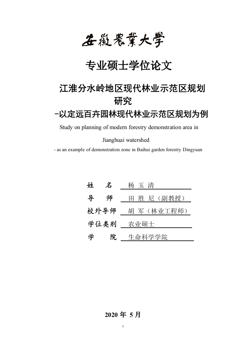 专业硕士学位论文江淮分水岭地区现代林业示范区规划研究-以定远百卉园林现代林业示范区规划为例Study on planning of modern forestry demonstration area inJianghuai watershedas an example of demonstration zone in Baihui garden forestry Dingyuan姓名导师田胜尼(副教授)校外导师胡军(林业工程师)学位类别农业硕士学院生命科学学院2020年5月摘要林业作为我国最典型的一项社会基础性事业,承担着生态环境建设、林产品供给等重要任务,在经济、社会、生态方面发挥着关键作用。但由于工业的迅速发展、城市化的不断推进,导致林业资源及林业产业的发展情况不尽乐观。如何高效推进林业资源保护和绿化造林工作,实现传统林业向现代林业的转型,是当前各地林业部门落实林业可持续发展理念的第一要务。现代林业示范区的作用正是转变林业发展模式,将先进的林业技术生产及运营模式大规模应用于实践的基础性工作。科学编制林业示范区总体规划是确保示范区建设的合理性、规范性的前提。本文以如何编制现代林业示范区总体规划为主题,将凤阳益然、六安金都现代林业示范区以及马安寨林业生态园和湖南衡山现代林业示范园规划作为案例研究,主要从园区建设条件、总体布局、预期效益和编制框架进行总结评价。最后在现状资源调查和案例分析的基础上,按照安徽省现代林业编制相关技术规程,以定远百卉园林现代林业示范区规划为实证案例,总结了现代林业示范区总体规划方案。方案可用来指导定远百卉园林现代林业示范区建设,以及为江淮分水岭地区其他市县林业示范区规划提供一套具有代表性的案例参考。主要研究成果如下:(1)通过案例研究和查阅文献资料,总结了现代林业示范区规划的一般步骤和进差异。林业示范区规划一般步骤主要包括规划背景概述、建设条件分析、指导思想与原则、总体规划布局和功能分区、各类专项规划、效益分析等基础性内容。不同地区林业示范区规划的差异体现在建设条件、本地林业土地资源状况、功能定位三方面。(2)通过对案例研究和典型地区实地调查,确定江淮分水岭地区生态现状和区位情况。岭区为秦岭、大别山向东延伸部分,拥有得天独厚的生态资源,但该地区易旱、缺水及土壤不肥沃,传统农业在分水岭上前景不容乐观,实施森林保育、林下经济、水源涵养、生态旅游等工程,不仅是推进江淮生态廊道建设的基础内容,更是推动整个江淮地区产业发展强有力的生态保障。(3)定远百卉园林现代林业示范区属苗木花卉林,建成运营将具备良好林业经济前景。实地调查,定远县原生森林植被类型以北亚热带落叶阔叶林为主,主要有山槐愧(Albizia kalkora)、黄檀(Dalbergia hupeana)、黄连木(Pi,stacia chinen,is)、枫香(Liquidambar formo.sana)、化香(Platycarya strobilacea)等阔叶树种和少量柏(Platycladus orientalis)、漆树(To.xicodendron vernicifluum)等名贵树种等。另外示范区毗邻大金山国有林场和金山滴水寺景区,拥有良好的林木资源和旅游资源。(4)定远百卉园林现代林业示范区建设拥有良好的林业基础条件和苗木交易市场潜力。按照“一园、二区、四基地”的总体发展格局,将示范区划分为农林生态养殖区、特色花卉示范推广与生态科普区、休闲观光区与景观质量提升区、特色经济林木培育四个功能分区,着重保护、培育和合理利用林业资源,提升林业产品的供给能力。此外,在保证生态不遭受严重破坏的前提下,还完成了基础设施建设、生态旅游、植被与森林景观、环境影响评价、数字林业等专项规划。关键词:林业规划:林业示范区:林业产业:江淮分水岭;百卉园林
