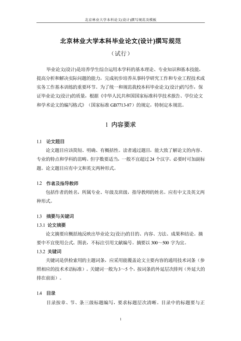 北京林业大学本科论文(设计)撰写规范及模板北京林业大学本科毕业论文(设计)撰写规范(试行)毕业论文(设计)是培养学生综合运用本学科的基本理论、专业知识和基本技能,提高分析和解决实际问题的能力,完成初步培养从事科学研究工作和专业工程技术或实务工作基本训练的重要环节。为了统一和规范我校本科毕业论文(设计)的写作,保证毕业论文(设计)的质量,根据《中华人民共和国国家标准科学技术报告、学位论文和学术论文的编写格式》(国家标准GB7713-87)的规定,特制定本规范。1内容要求1.1论文题目论文题目应该简短、明确、有概括性。读者通过题目,能大致了解论文的内容、专业的特点和学科的范畴。但字数要适当,一般不宜超过24个汉字。必要时可加副标题。论文题目应有中文和英文两种形式。1.2作者及指导教师包括作者的姓名,所属专业、年级及班级,指导教师的姓名。应有中文及英文两种形式。1.3摘要与关键词1.3.1论文摘要论文摘要应概括地反映出毕业论文(设计的目的、内容、方法、成果和结论。摘要中不宜使用公式、图表,不标注引用文献编号。摘要以300一500字为宜。13.2关键词关键词是供检索用的主题词条,应采用能覆盖论文主要内容的通用技术词条(参照相应的技术术语标准)。关键词一般为3一5个,按词条的外延层次排列(外延大的排在前面)。1.4目录目录按章、节、条三级标题编写,要求标题层次清晰。目录中的标题要与正北京林业大学本科论文(设计)撰写规范及模板文中标题一致。目录中应包括绪论、论文主体、结论、致谢、参考文献、附录等。1.5论文正文论文正文是毕业论文(设计的主体和核心部分,一般应包括绪论、论文主体及结论1.5.1绪论绪论一般作为第一章,是毕业论文(设计)主体的开端。绪论应包括:毕业设计的背景及目的:国内外研究状况和相关领域中已有的研究成果;课题的研究方法:论文构成及研究内容等。绪论一般不少于2千字。1.5.2论文主体论文主体是毕业论文(设计)的主要部分,应该结构合理,层次清楚,重点突出,文字简练、通顺。论文主体的内容应包括以下各方面:(1)毕业论文(设计)总体方案设计与选择的论证。(2)毕业论文(设计)各部分(包括硬件与软件)的设计计算。(3)试验方案设计的可行性、有效性以及试验数据的处理及分析。(4)对本研究内容及成果应进行较全面、客观的理论阐述,应着重指出本研究内容中的创新、改进与实际应用之处。理论分析中,应将他人研究成果单独书写,并注明出处,不得将其与本人提出的理论分析混淆在一起。对于将其他领域的理论、结果引用到本研究领域者,应说明该理论的出处,并论述引用的可行性与有效性。(⑤)自然科学的论文应推理正确,结论清晰,无科学性错误。(⑥)管理和人文学科的论文应包括对研究问题的论述及系统分析,比较研究,模型或方案设计,案例论证或实证分析,模型运行的结果分析或建议、改进措施等。1.5.3结论学位论文的结论单独作为一章排写。结论是毕业论文(设计)的总结,是整篇论文的归宿。要求精炼、准确地阐述自己的创造性工作或新的见解及其意义和作用,还可进一步提出需要讨论的问题和建议。1.6致谢致谢中主要感谢导师和对论文工作有直接贡献及帮助的人士和单位。2北京林业大学本科论文(设计)撰写规范及模板1.7参考文献按论文正文中出现的顺序列出直接引用的主要参考文献。毕业论文(设计)的撰写应本着严谨求实的科学态度,凡有引用他人成果之处,均应按论文中所出现的先后次序列于参考文献中。并且只应列出正文中以标注形式引用或参考的有关著作和论文。一篇论著在论文中多处引用时,在参考文献中只应出现一次,序号以第一次出现的位置为准。1.8附录对于一些不宜放入正文中、但作为毕业论文(设计)又是不可缺少的部分,或有重要参考价值的内容,可编入毕业论文(设计)的附录中。例如,过长的公式推导、重复性的数据、图表、程序全文及其说明等。2书写规范与打印要求2.1论文文字和字数除外语专业和留学生外,一般用汉语简化文字书写,字数不少于1万字。2.2论文书写论文一律在计算机上输入、编排并打印在A4幅面白纸上,单面打印。2.3字号和字体论文题目:小三号黑体(中文题目):小三号Times New Roman体(英文题目)作者及指导教师:小四号宋体章标题:四号宋体加粗节标题:小四号宋体加粗条标题:五号宋体加粗款标题:五号宋体正文:五号宋体数字和字母:论文中出现的所有数字和字母如无特殊要求都用Times NewRoman体。3