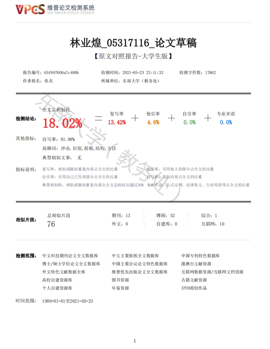 维普论文检测系统VIP PAPER CHECK SYSTEM林业煌05317116论文草稿【原文对照报告-大学生版】报告编号:65f697606a7c488b检测时间:2021-05-2323:11:33检测字符数:17862作者姓名:佚名所属单位:东南大学(教务处)全文总相似比复写率他引率自引率专业术语检测结论:18.02%13.42%4.6%0.0%0.0%其他指标:自写率:81.98%高频词:冲击,识别,荷载,结构,方法典型相似文章:无指标说明:复写率:相似或疑似重复内容占全文的比重引用他人的部分占全文的比重自引率:引用自己已发表部分占全文的比重写率:原创内容占全文的比重典型相似性:相似或疑似重复内容占全文总相似比超过30%专业术语:公式定理、法律条文、行业用语等占全文的比重总相似片段期刊:13博硕:52综合:1相似片段:76外文:0自建库:0互联网:10检测范围:中文科技期刊论文全文数据库中文主要报纸全文数据库中国专利特色数据库博士/硕士学位论文全文数据库中国主要会议论文特色数据库港澳台文献资源外文特色文献数据全库维普优先出版论文全文数据库互联网数据资源/互联网文档资源高校自建资源库图书资源古籍文献资源个人自建资源库年鉴资源IPUB原创作品时间范围:1989-01-01至2021-05-23维普论文检测系统VIP PAPER CHECK SYSTEM原文对照颜色标注说明:■自写片段■复写片段(相似或疑似重复)口引用片段(引用)■专业术语(公式定理、法律条文、行业用语等)毕业设计(论文)报告题目:冲击载荷定位与时程识别方法研究学号:05317116姓名:林业煌学院:土木工程学院专业:工程力学指导教师:吴邵庆起止日期:东南大学毕业(设计)论文独创性声明本人声明所呈交的毕业(设计)论文是我个人在导师指导下进行的研究工作及取得的研究成果。尽我所知,除了文中特别加以标注和致谢的地方外,论文中不包含其他人已经发表或撰写过的研究成果,也不包含为获得东南大学或其它教育机构的学位或证书而使用过的材料。与我一同工作的同志对本研究所做的任何贡献均已在论文中作了明确的说明并表示了谢意。论文作者签名:日期:年月日东南大学毕业(设计)论文使用授权声明东南大学有权保留本人所送交毕业(设计)论文的复印件和电子文档,可以采用影印、缩印或其他复制手段保存论文。本人电子文档的内容和纸质论文的内容相一致。除在保密期内的保密论文外,允许论文被查阅和借阅,可以公布(包括刊登)论文的全部或部分内容。论文的公布(包括刊登)授权东南大学教务处办理。论文作者签名:导师签名:日期:年月日日期:年月日2维普论文检测系统VIP PAPER CHECK SYSTEM摘要复合材料由于其高比强度和高比刚度,在飞行器中的应用逐渐增多。而复合材料结构易受到冲击力的影响,因此需要对结构进行实时损伤预测和评估。冲击荷载的位置和时间历程是用于损伤预测的重要信息,本文对冲击荷载识别问题进行研究,对梁板结构进行冲击荷载的有效识别。本文的主要研究内容有:研究一种冲击荷载识别方法,利用分布在结构表面的测点收集冲击荷载响应数据,通过引入正则化方法的算法反演结构的传递关系,并预设作用位置,确定对应冲击载荷时间历程,建立真实响应与计算响应误差的目标函数,通过最小化目标函数得到识别结果。在识别方法的验证中,通过nat1ab编写相关程序,根据结构有限元实现对结构的模拟,通过Newmark--P法实现对结构动响应的提取。对悬臂梁结构、与悬臂板结构的冲击荷载识别进行研究,通过分析目标函数值示意图、识别荷载与实际荷载对照图以及响应频谱图,对识别结果进行评判。仿真结果证明了该方法的有效性。关键词:冲击荷载,正则化,传递关系,目标函数,有限元,Newmark--P法ABSTRACTBecause of its high specific strength and high specific stiffness,the application of compositematerials in aircraft is increasing gradually.The composite structure is easy to be affected byimpact force,so it is necessary to predict and evaluate the real-time damage of the structure.Thelocation and time course of impact load is an important information for damage prediction.Thispaper studies the identification of impact load and effectively identifies the impact load of beamand slab structure.The main contents of this paper are as follows:This paper studies a method of shock load identification,which uses the measuring pointsdistributed on the structure surface to collect the shock load response data,and inverts thetransfer relationship of the structure by introducing the regularization method,and presupposes theaction position,determines the corresponding impact load time course,establishes the objectivefunction of real response and calculation response error,and obtains the recognition result byminimizing the target function.In the verification of recognition method,the relevant program is written by MATLAB,thestructure is simulated by the finite element method,and the dynamic response of the structure isextracted by Newmark-B method.The impact load identification of cantilever structure andcantilever plate structure is studied.The recognition results are evaluated by analyzing theschematic diagram of target function value,the comparison between the identification load and theactual load and the response spectrum.The simulation results show the effectiveness of the method.KEY WORDS:Impact Force,Regularization,Transitive Relation,Objective Function,finite element method,Newmark-B method目录摘要IABSTRACTII目录III第一章绪论11.1课题背景和意义11.2研究现状11.3本文研究内容4第二章冲击荷载识别方法及原理62.1概述62.2冲击荷载识别方法62.3结构动