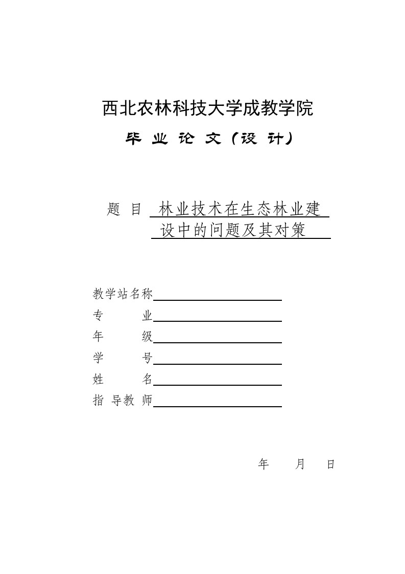 西北农林科技大学成教学院题目林业技术在生态林业建设中的问题及其对策教学站名称专业年级学号姓名指导教师年月林业技术推广在生态林业建设中的问题及其对策摘要林业在生态建设的过程中有举足轻重的作用,在生态文明建设的过程中,其充当着承担者的角色。林业的主要职责就是对森林的生态系统进行建设和保护、对湿地进行治理和发展、维护物种多样性的发展、改变人类沙漠化的现状同时还需要对生态文明进行弘扬和发展。如今生态环境不断恶化,人类生存现状不断受到威胁,基于此,我国政府对生态建设给予了足够的重视,将生态建设作为了我国的发展国策,同时不断提倡可持续发展以及科学发展观。在生态建设过程中,我国政府将林业作为主要的建设目标,特别在执行西部大开发任务的过程中,林业基础的地位被确立:以本国为基础,以全球为目标,维护和谐的生态环境是我国发展生态建设的最终目标,同时也是一个世界大国对世界的承诺。本文在研究的过程中不断查阅了各种国内外林业技术推广与生态林业建设资料的基础上,通过比较分析与解剖具体生态林业建设的方法,研究了近年来我国实施生态林业建设取得的成效及存在的相关问题,提出了存在于我国生态林业建设中的一系列问题,同时根据自己推广经验,给出了相应的建议和对策。关键词:生态林业:生态林业建设:林业技术推广目录一、引言…二、相关理论概述(一)农业技术推广(二)林业技术推广2(三)生态林业3(四)生态建设…3三、我国农业推广在生态林业建设的现状3(一)农业推广在生态林业建设的发展现状3(二)林业技术推广在生态林业建设中的重要意义…1.林业技术推广是生态林业建设的先导42.林业技术推广是沟通科研和生态林业建设的纽带53.林业技术推广是建设高效生态林业的重要保障.54.林业技术推广是帮助林农脱贫致富的有效途径6四、林业技术推广发展存在的问题..6(一)技术推广与林业生产脱节,推广服务能力有待加强.6(二)林农整体文化素质不高,技术推广资金投入不足.7(三)思想认识不到位,缺乏持续发展思维五、加快林业技术推广发展的对策与思考..8(一)建立健全林业技术推广网络,提高科技成果转化能力81.建立健全林业技术推广网络体系82.健全技术成果高效率转化的机制93.打造便捷有效的转化服务平台9(二)积极推进林业技术体制改革,创造有利于成果转化的政策环境1.加大科技经费的投入,鼓励研发林业实用技术…92.以专业合作组织为平台,加强人才培养.103.转换推广机制,积极推行多种形式相结合的推广模式…10(三)加强林业技术推广建设,提高持续发展能力111.拓宽推广服务内容,强化技术推广能力11