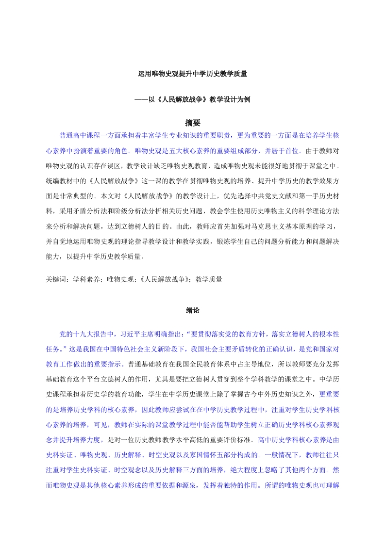 运用唯物史观提升中学历史教学质量一一以《人民解放战争》教学设计为例摘要普通高中课程一方面承担着丰富学生专业知识的重要职责,更为重要的一方面是在培养学生核心素养中扮演着重要的角色。唯物史观是五大核心素养的重要组成部分,并居于首位。由于教师对唯物史观的认识存在误区,教学设计缺乏唯物史观教育,造成唯物史观未能很好地贯彻于课堂之中。统编教材中的《人民解放战争》这一课的教学在贯彻唯物史观的培养、提升中学历史的教学效果方面是非常典型的。本文对《人民解放战争》的教学设计上,优先选择中共党史文献和第一手历史材料,采用矛盾分析法和阶级分析法分析相关历史问题,教会学生使用历史唯物主义的科学理论方法来分析和解决问题,达到立德树人的目的。由此,教师应首先加强对马克思主义基本原理的学习,并自觉地运用唯物史观的理论指导教学设计和教学实践,锻炼学生自己的问题分析能力和问题解决能力,以提升中学历史教学质量。关键词:学科素养:唯物史观:《人民解放战争》:教学质量绪论党的十九大报告中,习近平主席明确指出:“要贯彻落实党的教育方针,落实立德树人的根本性任务。”这是我国在中国特色社会主义新阶段下,我国社会主要矛盾转化的正确认识,是党和国家对教育工作做出的重要指示。普通基础教育在我国全民教育体系中占主导地位,所以教师要充分发挥基础教育这个平台立德树人的作用,尤其是要把立德树人贯穿到整个学科教学的课堂之中。中学历史课程承担着历史学的教育功能,学生在中学历史课堂上除了掌握古今中外历史知识之外,更重要的是培养历史学科的核心素养,因此教师应尝试在在中学历史教学过程中,注重对学生历史学科核心素养的培养,可见,教师在实际的课堂教学过程中能否能帮助学生树立正确历史学科核心素养观念并提升培养力度,是对一位历史教师教学水平高低的重要评价标准。高中历史学科核心素养是由史料实证、唯物史观、历史解释、时空史观以及家国情怀五部分构成的。一般情况下,教师往往只注重对学生史料实证、时空观念以及历史解释三方面的培养,绝大程度上忽略了其他两个方面。然而唯物史观是其他核心素养形成的重要依据和源泉,发挥着独特的作用。所谓的唯物史观也可理解为揭示人类社会发展的客观基础、发展规律的一种价值观和方法论,在解释马克思主义哲学方面具有重要的指导意义和实践意义。培养青年学生的唯物主义历史观念观,不仅是中学历史教学的重要任务,也是思想政治教育的重要内容。目前学术界对“唯物史观”的探讨,主要集中在学术性研究,包括唯物史观的含义解读以及用唯物史观来解释中国历史的发展本质。李振兴等在《中国改革开放的唯物史观实践逻辑探析》一文中指出,从唯物史观的角度来考虑,我国的改革开放其实质是解放和发展生产力,由此促进社会的进步。同时张盾在《马克思唯物史观视域中的法治问题》中表明,借助唯物史观的方法来系统阐明我国法治的内在逻辑。此外,朱怡初发表的名为《唯物史视域下人类命运共同体阐述》的文章中强调唯物史观在探究习总书记关于人类命运共同体中起着关键性作用。中学历史教学领域的唯物史观素养的研究也逐渐兴盛,主要体现在培养学生唯物史观的途径以及考察学生唯物史观水平高低的方法。袁静静同样指明培养唯物史观素养具有重要的现实意义,她指出,培养学生的唯物史观素养一方面可以促进学生形成科学的历史研究方法,更重要的另一方面是对学生世界观和人生观的教育,助力学生全面发展。刘慧青通过分析高考历史Ⅱ卷中有关于“唯物史观”素养的考点来研究高中历史唯物史观的教学情况,以便探求如何更好地提高历史教学的质量。总之,无论是历史学术研究还是历史教学研究,均将“唯物史观”视为相当重要的研究内容和研究角度。目前的研究重点是如何保证在中学历史教学过程中切实地提高学生的唯物史观素养,保障课程教学的良好效果,结合具体的课程内容进行探讨的成果尚不多见。藉是之故,本文拟以人民教育出版社新编出版的高中历史教材《人民解放战争》一课内容为例,分析目前关于《人民解放战争》教学中存在的问题,阐述如何提高唯物史观的教学质量来设计课程内容,以提高课堂教学的效果,总结相关教学设计经验。一、唯物史观在中学历史教育中的培养历史归属于人文社会科学的范畴,在对学生进行基础历史知识补充的同时,更为重要的是加强对学生科学历史观的培养。中学生的价值观和人生观还处于养成阶段,如果学生不能养成科学的历史观,那么中学的历史教育就不能承担起立德树人的作用。目前的中学的学科教学都是为了适应考试的应试教育,许多教师比较注重对学生知识的灌输和解题技巧的讲解。然而像语文、政治、历史等等这些学科中的人文价值没有在课堂上体现出来,学生在课堂上学到的是冷冰冰的知识,没有感受到人文情怀。造成这个现象的有多方面的原因,或者是教师没有正确理解中学历史教学的目的,円刘慧青.2013年2019年全国高考Ⅱ卷文综历史试趣中的“唯物史观”研究D1.内蒙古师范大学,2020,认为学生只要掌握好了历史知识就算完成教学目标了:或者是教师个人素养问题,其对唯物史观不理解或者理解有