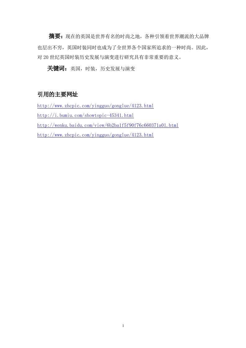 摘要:现在的英国是世界有名的时尚之地,各种引领着世界潮流的大品牌也层出不穷,英国时装同时也成为了全世界各个国家所追求的一种时尚。因此,对20世纪英国时装历史发展与演变进行研究具有非常重要的意义。关键词:英国,时装,历史发展与演变引用的主要网址http://www.zhcpic.com/yingguo/gonglue/4123.htmlhttp://i.bumiu.com/showtopic-45341.htmlhttp://www.zhcpic.com/yingguo/gonglue/4123.html1目录摘要…绪论…(二)研究意义…二、二十世纪英国时装历史发展与演变…3(一)二十世纪初期一二十世纪五十年代…(二)二十世纪六十年代……4致谢…参考文献……7220世纪英国时装历史发展与演变绪论(一)研究内容时装主要是指时髦以及流行的具有鲜明时代感的服装,它是相对于历史服装以及在一定时期内比较稳定的常规服装来说的。一般来说,时装主要有以下特点:极富流行性以及周期性。时装主要有两个层次:一种是前卫性时装,其主要特点是具有比较强烈的艺术感,个性鲜明又独特,集中体现在设计师对流行有着个人独特的见解,而设计师把这种见解融入服装的设计之中,主要集中在上流社会。另外一种是流行性时装,主要是指大量生产以及销售的具有流行特征的服装,具有一定的普及性,由于流行服装变化速度比较快,具有比较鲜明的时代感,因此在社会上的普及度较大。本文主要对英国时尚界从1900年底到20世纪60年代这一时期的时装进行研究。(二)研究意义进入二十世纪之后,随着设计师们设计出了风衣和各种套装开始,英国服装进入了现代时尚的大流”。如今的英国更是世界有名的时尚之地,各种引领着世界潮流的大品牌也层出不穷,英国时装同时也成为了全世界各个国家所追求的一种时尚。因此,对20世纪英国时装历史发展与演变进行研究具有非常重要的意义。二、二十世纪英国时装历史发展与演变(一)二十世纪初期一二十世纪五十年代20世纪初期,由于艺术风格上主要的表现形式为“绝对主义”“构成主义”以及“塔特林派”,这些艺术主张逐渐形成现代主义,将之表现在几何式的抽象主义,对当时英国的时装也造成了一定程度上的影响,逐渐影响到英国时装款式以及有关面料的设计,并且慢慢地形成了一种特殊的服装审美特色。20世纪30年代,对于衣着一直比较注重的英国人,比较追求舒适称心的服①:北京青年旅行社.伦敦服装.英国旅游攻2012.6.28.(http://www.zhcpic.com/yingguo/gonglue/4123.html).3
