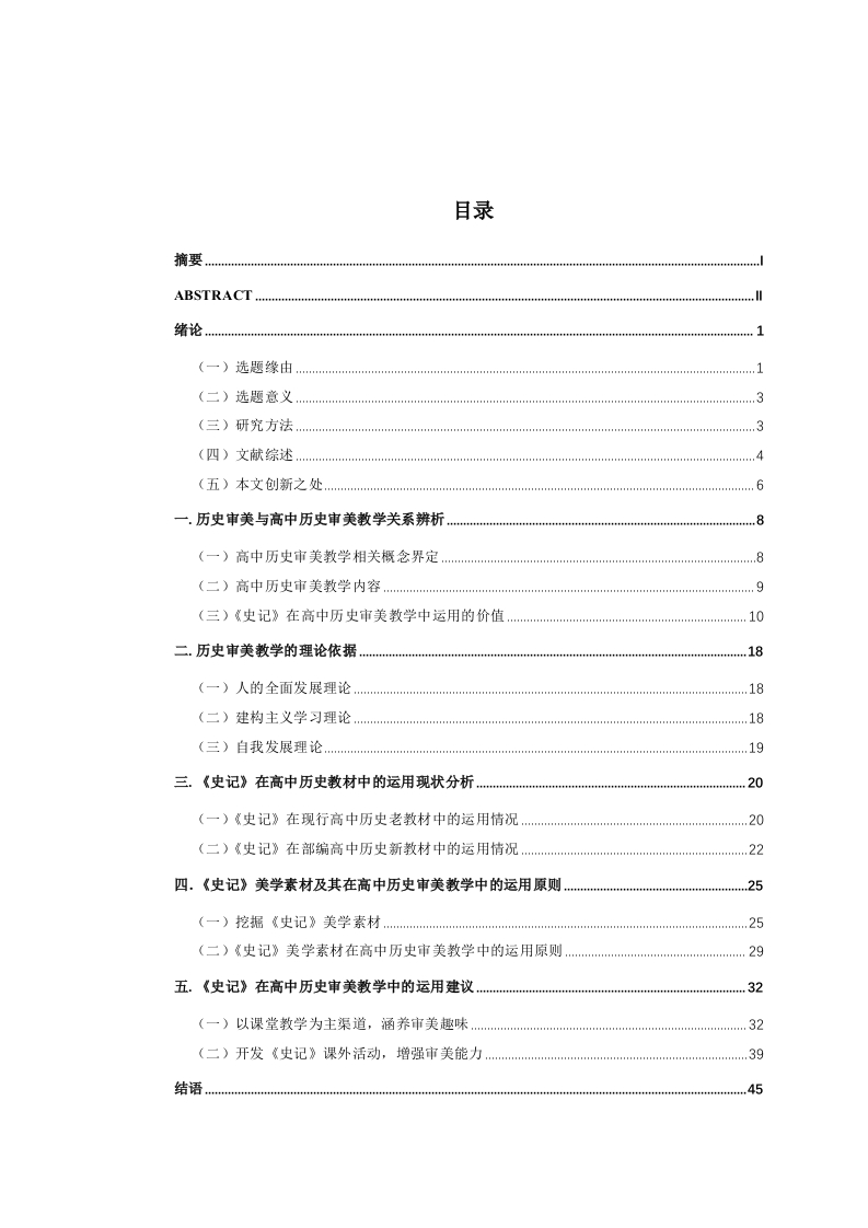 目录摘要ABSTRACT....绪论(一)选题缘由13(四)文献综述(五)本文创新之处…一.历史审美与高中历史审美教学关系辨析8(一)高中历史审美教学相关概念界定…(二)高中历史审美教学内容9(三)《史记》在高中历史审美教学中运用的价值…10二.历史审美教学的理论依据.18(一)人的全面发展理论18(二)建构主义学习理论18(三)自我发展理论19三.《史记》在高中历史教材中的运用现状分析(一)《史记》在现行高中历史老教材中的运用情况.20(二)《史记》在部编高中历史新教材中的运用情况.22四.《史记》美学素材及其在高中历史审美教学中的运用原则…25(一)挖据《史记》美学素材.25(二)《史记》美学素材在高中历史审美教学中的运用原则五.《史记》在高中历史审美教学中的运用建议(一)以课堂教学为主渠道,涵养审美趣味32(二)开发《史记》课外活动,增强审美能力.39结语.45参考文献46致谢49《史记》在高中历史审美教学中的应用摘要1