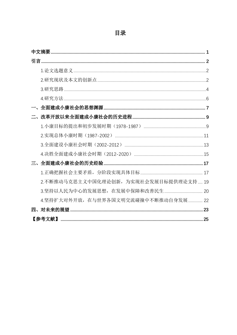 目录引言1论文选题意义22.研究现状及本文的创新点23.研究思路4.研究方法一、全面建成小康社会的思想渊源.7二、改革开放以来全面建成小康社会的历史进程,91.小康目标的提出和初步发展时期(1978-1987)92.实现总体小康时期(1987-2002)3.全面建设小康社会时期(2002-2012).134.决胜全面建成小康社会时期(2012-2020)三、全面建成小康社会的历史经验…171.正确把握社会主要矛盾,分阶段实现具体目标172.不断推动马克思主义中国化理论创新,为实现社会发展目标提供理论支持.193.坚持以人民为中心的发展思想,在发展中保障和改善民生204.坚持扩大对外开放,在与世界各国文明交流碰撞中不断推动自身发展…22四、对未来的展望…23【参考文献】全面建成小康社会的历史进程和经验研究中文摘要全面建成小康社会是实现“两个一百年”奋斗目标的重要任务。全面建成小康社会思想渊源历史悠久,起源于中华优秀传统文化中的“民本”思想,近代以来受共产主义思想影响,在马克思主义中国化历史进程中焕发出新的政治内涵。改革开放以来全面建成小康社会的历史进程分为小康目标的提出和初步发展时期、实现总体小康时期、全面建设小康社会时期、决胜全面建成小康社会时期四个阶段。正确把握社会主要矛盾,分阶段实现具体目标:不断推动马克思主义中国化理论创新,为社会发展目标提供理论支持:坚持以人们为中心的发展思想,在发展中保障和改善民生:坚持扩大对外开放,在与世界各国文明交流碰撞中不断推动自身发展是全面建成小康社会过程中形成的历史经验。正确认识全面建成小康社会历史进程,总结历史经验,推动全面建设社会主义现代化强国,实现中华民族伟大复兴中国梦。关键词:全面建成小康社会思想渊源历史进程历史经验1引言2020年是决胜全面建成小康社会的收官之年,全面建成小康社会是实现第一个百年奋斗目标的重要任务,研究全面建成小康社会的历史进程,总结全面建成小康社会的历史经验,推动马克思主义中国化理论创新与中华民族伟大复兴“中国梦”伟大实践不断发展。1.论文选题意义党的十八大提出了到2020年全面建成小康社会的奋斗目标。全面建成小康社会标志着我们跨过了实现现代化建设第三步战略目标必经的承上启下的重要发展阶段。正确把握全面建成小康社会的历史进程,总结全面建成小康社会的历史经验,具有独特的理论价值和重要的现实意义。(1)理论意义全面建成小康社会是中国特色社会主义“四个全面”战略布局中的战略目标,是马克思主义中国化最新理论成果一一习近平新时代中国特色社会主义思想的重要组成部分。全面建成小康社会是在中国特色社会主义进入新时代后,位于“两个一百年”奋斗目标的历史交汇期,研究全面建成小康社会的历史进程和经验,丰富了习近平新时代中国特色社会主义思想的研究内容,拓展了马克思主义中国化研究思路。(2)实践意义自1979年邓小平第一次提出“小康”概念,到2020年全面建成小康社会,经历了改革开放40多年的发展变化。研究全面建成小康社会的历史进程,梳理从“小康”、“总体小康”到“全面小康”,以及从“全面建设小康社会”到“全面建成小康社会”的历史进程,在当代中国改革开放实践中把握规律、总结经验,推动社会主义现代化强国建设进入新的发展阶段,为实现中华民族伟大复兴中国梦这一奋斗目标提供实践支持,具有重要的现实意义。2.研究现状及本文的创新点目前,学术界围绕着对全面建成小康社会这个问题展开了一系列研究,取得了一些有价值的成果。目前学术界对于全面建成小康社会的研究主要集中在全面建成小康社会的历史进程、主要特点及存在问题、伟大意义三方面。2