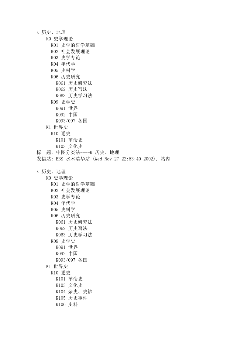 K历史、地理K0史学理论K01史学的哲学基础K02社会发展理论K03史学专论K04年代学K05史料学K06历史研究K061历史研究法K062历史写法K063历史学习法K09史学史K091世界K092中国K093/097各国K1世界史K10通史K101革命史K103文化史标题:中图分类法K历史、地理发信站:BBS水木清华站(Wed Nov2722:53:402002),站内K历史、地理K0史学理论K01史学的哲学基础K02社会发展理论K03史学专论K04年代学K05史料学K06历史研究K061历史研究法K062历史写法K063历史学习法K09史学史K091世界K092中国K093/097各国K1世界史K10通史K101革命史K103文化史K104杂史、史钞K105历史事件K106史料K107研究、考订、评论K107.8东方学K108年表K109普及读物K11上古史(公元前40世纪以前)K12古代史(公元前40世纪公元476年)K124古代东方K124.3巴比伦王国K124.4波斯帝国K125古代希腊K126古代罗马K13中世纪史(4761640年)K131早期封建社会(510世纪)K132中期封建社会(1015世纪)K133后期封建社会(1517世纪上半叶)K134拜占庭帝国(477~1453年)K135阿拉伯帝国(6321094年)K14近代史(16401917年)K141英国资产阶级革命至巴黎公社前夕(16401870年)K104杂史、史钞K105历史事件K106史料K107研究、考订、评论K107.8东方学K108年表K109普及读物K11上古史(公元前40世纪以前)K12古代史(公元前40世纪公元476年)K124古代东方K124.3巴比伦王国K124.4波斯帝国K125古代希腊K126古代罗马K13中世纪史(4761640年)K131早期封建社会(510世纪)K132中期封建社会(1015世纪)K133后期封建社会(1517世纪上半叶)K134拜占庭帝国(477~1453年)K135阿拉伯帝国(6321094年)K14近代史(16401917年)K141英国资产阶级革命至巴黎公社前夕(16401870年)K142巴黎公社至苏联十月社会主义革命前夕(18711917年)K143第一次世界大战(19141918年)K15现代史(1917年)K151苏联十月社会主义革命至第二次世界大战前夕(1917~1939年)K152第二次世界大战(19391945年)K153第二次世界大战以后(1945年)K18民族史志K2中国史K20通史K201革命史K203文化史K204古代史籍K204.1纪传体史书合刻K204.2纪传K204.3编年K204.4纪事本末K204.5杂史、史钞K205历史事件K206史料K206.3公牍、档案[K206.4]典章制度、政书K206.5诏令、奏议K234汉(公元前206公元220年)K234.1西汉(公元前206公元24年)K234.101农民起义K234.2东汉(25220年)K234.201农民起义K235三国、晋、南北朝(220589年)K236三国(220280年)K236.1魏(220265年)K236.2蜀(221263年)K236.3吴(222280年)K237晋(265420年)K237.1西晋(265316年)K237.2东晋(317~420年)K238十六国(304439年)K239南北朝(386589年)K239.1南朝(420589年)K239.11刘宋(420479年)K239.12南齐(479502年)K239.13梁(503557年)K239.14陈(557589年)K239.2北朝(386581年)K239.21北魏(386534年)K234汉(公元前206公元220年)K234.1西汉(公元前206公元24年)K234.101农民起义