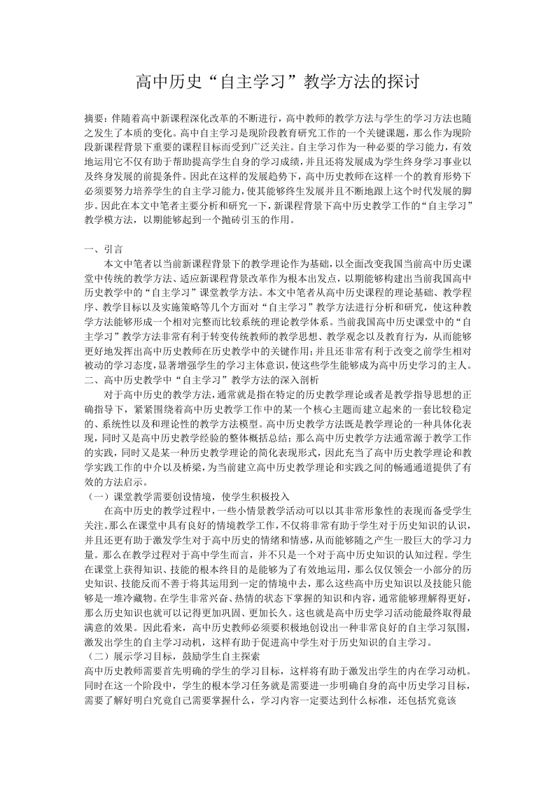 高中历史“自主学习”教学方法的探讨摘要:伴随着高中新课程深化改革的不断进行,高中教师的教学方法与学生的学习方法也随之发生了本质的变化。高中自主学习是现阶段教育研究工作的一个关键课题,那么作为现阶段新课程背景下重要的课程目标而受到广泛关注。自主学习作为一种必要的学习能力,有效地运用它不仅有助于帮助提高学生自身的学习成绩,并且还将发展成为学生终身学习事业以及终身发展的前提条件。因此在这样的发展趋势下,高中历史教师在这样一个的教育形势下必须要努力培养学生的自主学习能力,使其能够终生发展并且不新地跟上这个时代发展的脚步。因此在本文中笔者主要分析和研究一下,新课程背景下高中历史教学工作的“自主学习”教学模方法,以期能够起到一个抛砖引玉的作用。一、引言本文中笔者以当前新课程背景下的教学理论作为基础,以全面改变我国当前高中历史课堂中传统的教学方法、适应新课程背景改革作为根本出发点,以期能够构建出当前我国高中历史教学中的“自主学习”课堂教学方法。本文中笔者从高中历史课程的理论基础、教学程序、教学目标以及实施策略等几个方面对“自主学习”教学方法进行分析和研究,使这种教学方法能够形成一个相对完整而比较系统的理论教学体系。当前我国高中历史课堂中的“自主学习”教学方法非常有利于转变传统教师的教学思想、教学观念以及教育行为,从而能够更好地发挥出高中历史教师在历史教学中的关键作用:并且还非常有利于改变之前学生相对被动的学习态度,显著增强学生的学习主体意识,使这些学生能够成为高中历史学习的主人。二、高中历史教学中“自主学习”教学方法的深入剖析对于高中历史的教学方法,通常就是指在特定的历史教学理论或者是教学指导思想的正确指导下,紧紧围绕着高中历史教学工作中的某一个核心主题而建立起来的一套比较稳定的、系统性以及和理论性的教学方法模型。高中历史教学方法既是教学理论的一种具体化表现,同时又是高中历史教学经验的整体概括总结:那么高中历史教学方法通常源于教学工作的实践,同时又是某一种历史教学理论的简化表现形式,因此充当了高中历史教学理论和教学实践工作的中介以及桥梁,为当前建立高中历史教学理论和实践之间的畅通通道提供了有效的方法启示。(一)课堂教学需要创设情境,使学生积极投入在高中历史的教学过程中,一些小情景教学活动可以以其非常形象性的表现而备受学生关注.那么在课堂中具有良好的情境教学工作,不仅将非常有助于学生对于历史知识的认识,并且还更有助于激发学生对于高中历史的情绪和情感,从而能够随之产生一股巨大的学习力量。那么在教学过程对于高中学生而言,并不只是一个对于高中历史知识的认知过程。学生在课堂上获得知识、技能的根本终目的是能够为了有效地运用,那么仅仅领会一小部分的历史知识、技能反而不善于将其运用到一定的情境中去,那么这些高中历史知识以及技能只能够是一堆冷藏物。在学生非常兴奋、热情的状态下掌握的知识和内容,通常能够理解得更好,那么历史知识也就可以记得更加巩固、更加长久。这也就是高中历史学习活动能最终取得最满意的效果。因此看来,高中历史教师必须要积极地创设出一种非常良好的自主学习氛围,激发出学生的自主学习动机,这样有助于促进高中学生对于历史知识的自主学习。(二)展示学习目标,鼓励学生自主探索高中历史教师需要首先明确的学生的学习目标,这样将有助于激发出学生的内在学习动机。同时在这一个阶段中,学生的根本学习任务就是需要进一步明确自身的高中历史学习目标,需要了解好明白究竞自己需要掌握什么,学习内容一定要达到什么标准,还包括究竞该