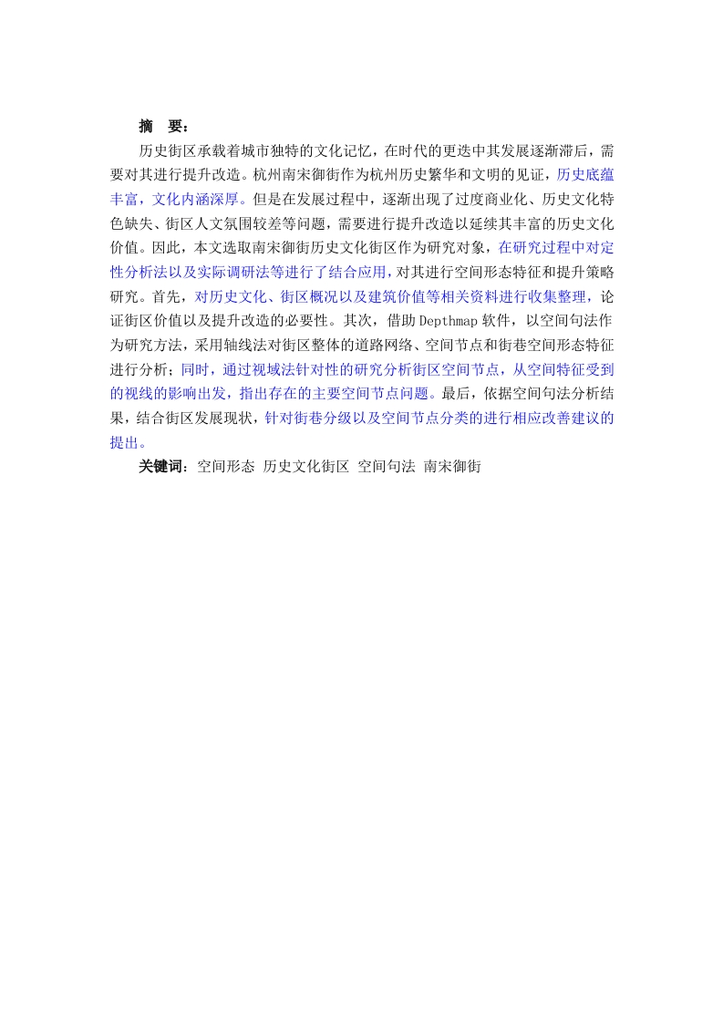 摘要:历史街区承载着城市独特的文化记忆,在时代的更迭中其发展逐渐滞后,需要对其进行提升改造。杭州南宋御街作为杭州历史繁华和文明的见证,历史底蕴丰富,文化内涵深厚。但是在发展过程中,逐渐出现了过度商业化、历史文化特色缺失、街区人文氛围较差等问题,需要进行提升改造以延续其丰富的历史文化价值。因此,本文选取南宋御街历史文化街区作为研究对象,在研究过程中对定性分析法以及实际调研法等进行了结合应用,对其进行空间形态特征和提升策略研究。首先,对历史文化、街区概况以及建筑价值等相关资料进行收集整理,论证街区价值以及提升改造的必要性。其次,借助Depthmap软件,以空间句法作为研究方法,采用轴线法对街区整体的道路网络、空间节点和街巷空间形态特征进行分析:同时,通过视域法针对性的研究分析街区空间节点,从空间特征受到的视线的影响出发,指出存在的主要空间节点问题。最后,依据空间句法分析结果,结合街区发展现状,针对街巷分级以及空间节点分类的进行相应改善建议的提出。关键词:空间形态历史文化街区空间句法南宋御街Abstract:Historical blocks carry the unique cultural memory of the city,and theirdevelopment gradually lags behind in the changing times,and needs to be upgradedand renovated.As a witness of Hangzhou's prosperity and civilization,Southern SongImperial Street has rich historical relics and cultural connotations.However,in theprocess of development,problems such as excessive commercialization,lack ofhistorical and cultural characteristics,and poor cultural atmosphere in theneighborhood have gradually emerged.Upgrade and renovation to continue its richhistorical and cultural value.Therefore,this paper selects Southern Song ImperialStreet as the research object,and uses three research methods of field research,spacesyntax and qualitative analysis to study its spatial morphological characteristics andimprovement strategies.First of all,conduct basic data research on the regionalprofile,historical evolution,cultural and architectural value of the block,anddemonstrate the value of the block and the necessity of upgrading.Secondly,with thehelp of Depthmap software,using space syntax as the main research method,the axismethod is used to analyze the overall traffic organization of the block,the currentsituation of space utilization and the inherent attributes of the space form of the street;Discover the impact of sight lines on spatial features and identify problems withspatial nodes.Finally,according to the results of space syntax analysis,combinedwith the development status of blocks,the specific improvement strategies for theclassification of main streets and lanes and the classification of space nodes areproposed.At the end of the article,it summarizes the research of this paper and thinksabout the inadequacies of the research,in order to provide reference and reference forthe future research on the spatial form of the block.Keywords:space form historical and cultural district space syntax southernsong imperial street一、引言(一)选题背景历史文化街区是一座城市的历史见证,具有很高的文化、科学、教育等价值。可以通过街区的空间形态对街区的历史特色进行展现,街区历史画面感的一大重要影响因素就是街区空间形态(康易通等,2017)。随着城市不断地演变更新,历史街区在更新改造与发展期间不可避免的遭受了一定的破坏。在改造历史街区时,片面重视短期效益的获取,没有充分挖掘历史街区的文化价值和历史资源。导致整个街区的文化脉络被破坏,街区的内在价值被忽略,历史文化价值下降(刘文静,2021:司海涛,2020)。因此,国家与社会越来越重视对历史文化街区的保护和发展。(二)研究意义1.现实意义在城市街区演变发展的过程中,历史文化的保护不是对特定历史形态的保留,在保护历史街区特色的同时,要对现代元素进行融入,推动历史街区的现代化发展,使得历史街区能够具有新的价值特色(董世豪,2020:姚瑞,2018)。杭州南宋御街在经过更新改造之后,其整体街区环境得到了改善,当地居民的生活水平也得到了一定程度的提高(陈亚孟等,2020)。但是由于原住居民搬迁,造成了街区人文风情的缺失,这并不利于街区文化的延续。针对街区发展现状,在分析历史街区空间形态时可以对空间句法进行应用,由此可以更好的传承和发展历史街区文化,使得人们的居住环境得到全面改善,发挥重要的发展推动作用。(杨成栋,2020:李撼飞,2017:陆明等,2017)。通过对街区文化价值的梳理,提出相应的更新提升策略,使城市历史文化街区的价值得以真正凸显。2.理论意义在城市进步与发展的过程中,要对历史街区进行保护与更新,历史街区的发展会对社会生活的各方面产生影响,主要涉及城市建设以及城市管理等相关内容,城市的发展规划会受到历史街区保护的直接影响(李撼飞,2017:柴纪阳,2018)。在特定历史条件下以及特定发展环境下,会形成具有独特特色的历史文化街区,可以通过街巷网络布局对街巷的抽象性秩序进行概括性呈现(陈攀,2017:陈菁菁等,2019)。空间句法相对于传统分析法而言,可以在对历史文化街区空间结构进行剖析的基础上,对街区空间结构中蕴含的逻辑性以及功能等进行充分挖掘(邱静文,2016)。这将为今后的相关研究提供参考与借鉴,有利于今后历史街区空间形态的研究工作更加准确和全面。(三)研究方法1.实地调查法