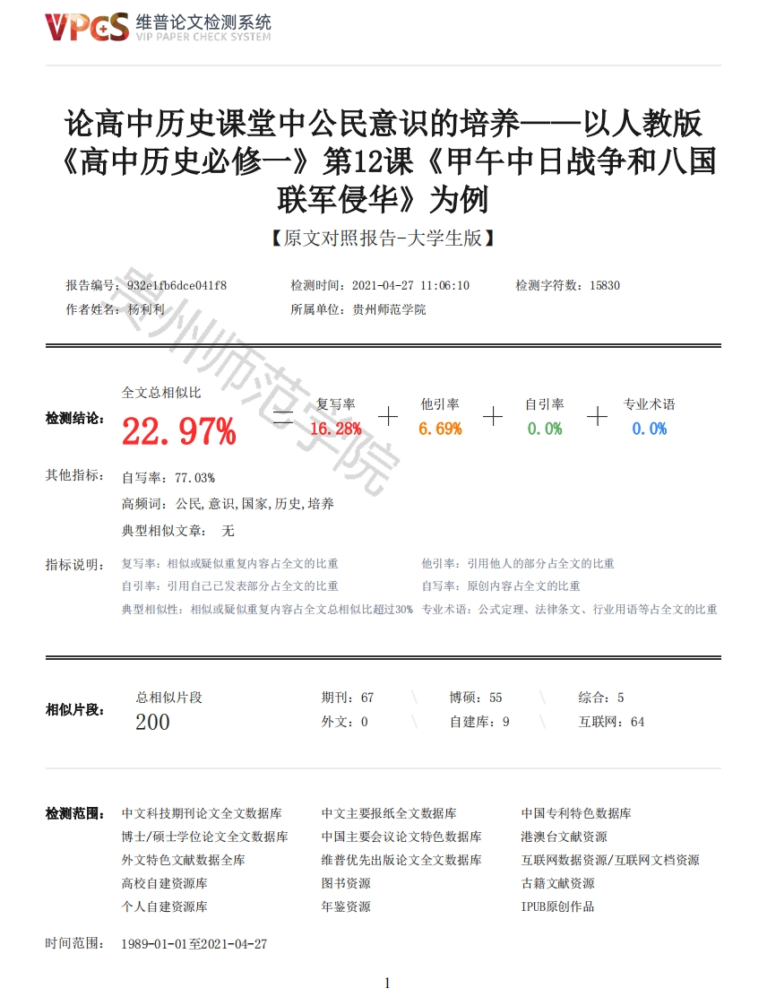 维普论文检测系统VIP PAPER CHECK SYSTEM论高中历史课堂中公民意识的培养一一以人教版《高中历史必修一》第12课《甲午中日战争和八国联军侵华》为例【原文对照报告-大学生版】报告编号:932e1fb6dce041f8检测时间:2021-04-2711:06:10检测字符数:15830作者姓名:杨利利所属单位:贵州师范学院7全文总相似比复写率他引率自引率专业术语检测结论:22.97%16.28%6.69%0.0%0.0%其他指标:自写率:77.03%高频词:公民,意识,国家,历史,培养典型相似文章:无指标说明:复写率:相似或疑似重复内容占全文的比重他引率:引用他人的部分占全文的比重自引率:引用自己已发表部分占全文的比重自写率:原创内容占全文的比重典型相似性:相似或疑似重复内容占全文总相似比超过30%专业术语:公式定理、法律条文、行业用语等占全文的比重总相似片段期刊:67博硕:55综合:5相似片段:200外文:0自建库:9互联网:64检测范围:中文科技期刊论文全文数据库中文主要报纸全文数据库中国专利特色数据库博士/硕士学位论文全文数据库中国主要会议论文特色数据库港澳台文献资源外文特色文献数据全库维普优先出版论文全文数据库互联网数据资源/互联网文档资源高校自建资源库图书资源古籍文献资源个人自建资源库年鉴资源IPUB原创作品时间范围:1989-01-01至2021-04-27维普论文检测系统VIP PAPER CHECK SYSTEM原文对照颜色标注说明:■自写片段■复写片段(相似或疑似重复)引用片段(引用)■专业术语(公式定理、法律条文、行业用语等)GUIZHOU EDUCATION UNIVERSITY本科毕业论文题目论高中历史课堂中公民意识的培养一一以人教版《高中历史必修一》第12课《甲午中日战争和八国联军侵华》为例姓名杨利利学号1704020540041院(系)历史与档案学院专业历史学年级2017级指导教师张勇职称教授二O一年月贵州师范学院本科毕业论文(设计)诚信声明本人郑重声明:所呈交的本科毕业论文(设计),是本人在指导老师的指导下,独立进行研究工作所取得的成果,成果不存在知识产权争议,除文中已经注明引用的内容外,本论文不含任何其他个人或集体已经发表或撰写过的作品成果。对本文的研究做出重要贡献的个人和集体均已在文中以明确方式标明。本人完全意识到本声明的法律结果由本人承担。论文作者签名:年月日目录摘要9Abstract10前言1(一)选题的背景和目的12维普论文检测系统VIP PAPER CHECK SYSTEM(二)国内外研究状况1(三)尚待进一步研究和解决的问题2(四)设计和研究方法3一、公民意识与公民意识教育4(一)公民与公民教育4(二)公民意识与公民意识教育5二、高中生公民意识现状调查实施与分析7(一)高中生公民意识现状调查实施7(二)高中生公民意识现状调查报告的分析7三、在高中历史课堂中培养公民意识的意义9(一)培养公民意识有助于促进学生的全面发展9(二)培养公民意识有助于促进社会主义民主与法治的发展11四、在高中历史课堂中培养公民意识应遵循的原则13(一)培养公民意识应遵循课程标准指导原则13(二)培养公民意识应遵循普遍性与特殊性原则14五、如何在高中历史课堂中进行公民意识的培养一一以人教版《高中历史必修一》第12课《甲午中日战争和八国联军侵华》为例14结语22参考文献23致谢25附录26摘要公民意识是指一个国家的公民对于自身的公民身份及其所拥有的公民权利和义务的自我认知,它强调了公民在国家与社会生活中的爱国意识、民主意识、参与意识、法治意识、主权意识等等。在高中历史教学中结合教材内容培养学生的公民意识有助于学生的全面发展、有助于培养社会的、国家的合格公民、有助于推动社会主义民主与法治的建设。关键词:公民:公民意识:高中历史教学:甲午中日战争:八国联军侵华AbstractCitizenship consciousness refers to the self-cognition of citizens of a country on their owncitizenship and civil rights and obligations.It emphasizes citizens awareness of patriotic,democracy,participation,rule of law,sovereignty and so on in national and social life.Cultivating students'civic consciousness in combination with the teaching material in senior highschool history teaching is conducive to the overall development of students,the cultivation ofqualified citizens of the society of the country,and the promotion of construction of socialistdemocracy and the rule of law.Keywords:citizens;civic consciousness;history teaching in senior middle school:Sino-Japanese War:The Eight-Power Allied Forces invaded China前言(一)选题的背景和目的改革开放以来,我国经济发展迅速,但是我国民众的公民意识却稍显薄弱。公民意识的培养迫在眉睫,而教育则是培养公民意识的有效工具。高中学生的生理和心理发展特征以及高中历史课堂的独特之处更为公民意识的培养提供了优势条件。公民意识是指一国公民对于自身公民身份及其权利和义务的自我认知。具有公民意识的人在日常生活中必然会自觉地履行自己作为公民的职责与义务,必然会主动维护社会公共道德和国家利益,必然会尊重他人的权利与义务,必然会主动积极地参与和推动国家民主政治活动与法治建设。在高中历史教学中培养学生的公民意识有助于培养出具有公民意识的、全面发展的社会主义建设者与接班人,有助于构建社会主义和谐社会,有助于促进社会主义民主与法治的建设,也是教育立德树人的重要体现。3