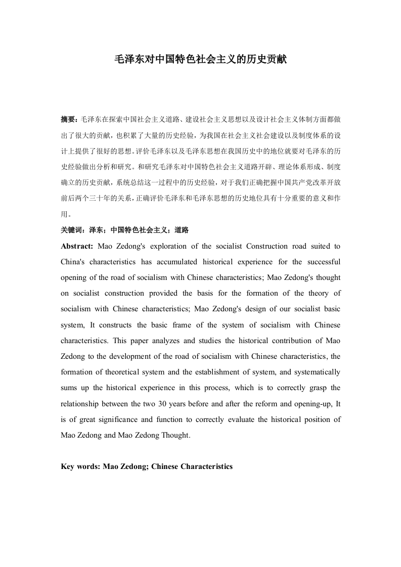 毛泽东对中国特色社会主义的历史贡献摘要:毛泽东在探索中国社会主义道路、建设社会主义思想以及设计社会主义体制方面都做出了很大的贡献,也积累了大量的历史经验,为我国在社会主义社会建设以及制度体系的设计上提供了很好的思想。评价毛泽东以及毛泽东思想在我国历史中的地位就要对毛泽东的历史经验做出分析和研究。和研究毛泽东对中国特色社会主义道路开辟、理论体系形成、制度确立的历史贡献,系统总结这一过程中的历史经验,对于我们正确把握中国共产党改革开放前后两个三十年的关系,正确评价毛泽东和毛泽东思想的历史地位具有十分重要的意义和作用。关键词:泽东;中国特色社会主义;道路Abstract:Mao Zedong's exploration of the socialist Construction road suited toChina's characteristics has accumulated historical experience for the successfulopening of the road of socialism with Chinese characteristics;Mao Zedong's thoughton socialist construction provided the basis for the formation of the theory ofsocialism with Chinese characteristics;Mao Zedong's design of our socialist basicsystem,It constructs the basic frame of the system of socialism with Chinesecharacteristics.This paper analyzes and studies the historical contribution of MaoZedong to the development of the road of socialism with Chinese characteristics,theformation of theoretical system and the establishment of system,and systematicallysums up the historical experience in this process,which is to correctly grasp therelationship between the two 30 years before and after the reform and opening-up,Itis of great significance and function to correctly evaluate the historical position ofMao Zedong and Mao Zedong Thought.Key words:Mao Zedong;Chinese Characteristics目录一、毛泽东对社会主义建设道路的探索为开辟中国特色社会主义道路积累了历史(一)毛泽东探索社会主义建设道路的艰辛历程(二)有利于实行对外开放政策.…(三)毛泽东探索社会主义建设道路的历史经验二、毛泽东社会主义建设思想为中国特色社会主义理论的形成提供了基础…2(一)经济建设2(三)发展战略三、毛泽东对我国社会主义基本制度的设计建构了中国特色社会主义制度体系的基本框架3(一)毛泽东与我国社会主义基本制度的构建3(二)毛泽东在新民主主义制度向社会主义制度转变中的作用.3(三)毛泽东对我国社会主义经济政治体制改革的探索4总结:参考文献:一、毛泽东对社会主义建设道路的探索为开辟中国特色社会主义道路积累了历史经验(一)毛泽东探索社会主义建设道路的艰辛历程毛泽东在对社会主义建设的探求符合中国特色过程中,从1955年11月到1957年这一时间段是充满艰辛和曲折的,也是在探索过程中最为重要的阶段。在探求社会主义建设问题的方法上,在尚且未完成社会主义革命之时就开始了,自从1955年就对我国农业和其它阵线的策略开展做出探求。更是在1956年4月,对探索社会主义建设道路的基本原则在《论十大关系》中所表达,对我国的社会主义建设进行了全面的分析,毛泽东认为在建设我国社会主义的过程中不但要与马克思主义相结合,而且提出了要正确处理好十大关系的原则。党的第八次代表会上,很多重要的思想观点被提了出来,并且对我国主要的社会矛盾做了论述,社会主义的建设需要把党和国家的中心转移过来。第二年年初,毛泽东有根据深入的学习和研究阐述了矛盾的所在,对我国社会主义的建设和探索道路上开了一个良好的先河。(二)有利于实行对外开放政策在新时期,毛泽东的设计和思想是我国在探索道路上最基础的根本,正是由于毛泽东所提出的原则和设计思想,才让我们在发展符合我国实情的社会主义的道路中坚持下来,继续坚持探索马克思主义理论联系实际的基本原则。十一届三中全会以后,在对待改革开放的问题以及基本原则上,党一直以来都在坚持着自己的路线和道路向前,把中国的实际情况与马克思主义的联系是几代党的领导人一直强调的(三)毛泽东探索社会主义建设道路的历史经验在建设属于中国的社会主义道路的探索中,毛泽东一直以借鉴苏联与自身结合的方法为基本的思路,把中国的实际结合马克思的基本原理的观点。虽然因为多种局限性,在对社会主义建设寻找能够属于中国实际的道路中,所得出的和规划的政策也与实际有所偏离,但是即使是这样,这种思想和方向在根本上是没有错的。所以,这种思想也为后续我国在探索的道路上提供了标杆和指向的作用,也为社会主义建设的前进加入了动力和坚实的基础。邓小平也曾经说过:“对于我们来说,不管是什么经验,只要是历史上所经历过的,成功、失败1
