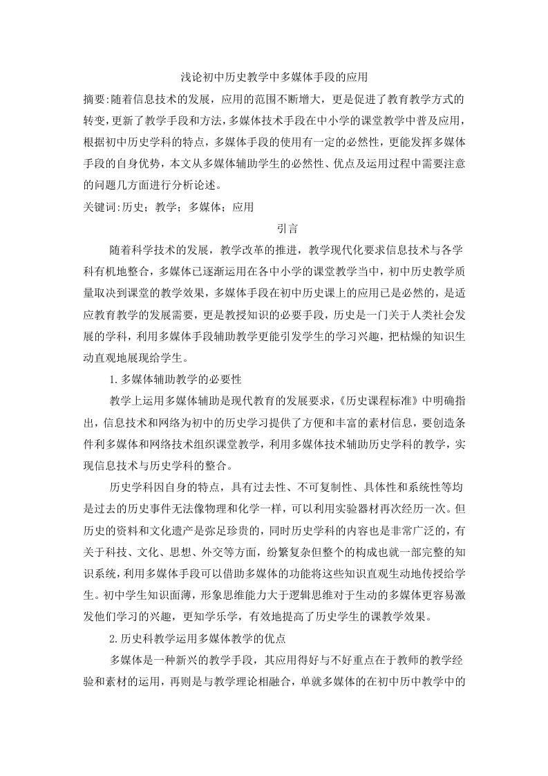 浅论初中历史教学中多媒体手段的应用摘要:随着信息技术的发展,应用的范围不断增大,更是促进了教育教学方式的转变,更新了教学手段和方法,多媒体技术手段在中小学的课堂教学中普及应用,根据初中历史学科的特点,多媒体手段的使用有一定的必然性,更能发挥多媒体手段的自身优势,本文从多媒体辅助学生的必然性、优点及运用过程中需要注意的问题几方面进行分析论述关键词:历史:教学:多媒体:应用引言随着科学技术的发展,教学改革的推进,教学现代化要求信息技术与各学科有机地整合,多媒体已逐渐运用在各中小学的课堂教学当中,初中历史教学质量取决到课堂的教学效果,多媒体手段在初中历史课上的应用已是必然的,是适应教育教学的发展需要,更是教授知识的必要手段,历史是一门关于人类社会发展的学科,利用多媒体手段辅助教学更能引发学生的学习兴趣,把枯燥的知识生动直观地展现给学生。1.多媒体辅助教学的必要性教学上运用多媒体辅助是现代教育的发展要求,《历史课程标准》中明确指出,信息技术和网络为初中的历史学习提供了方便和丰富的素材信息,要创造条件利多媒体和网络技术组织课堂教学,利用多媒体技术辅助历史学科的教学,实现信息技术与历史学科的整合。历史学科因自身的特点,具有过去性、不可复制性、具体性和系统性等均是过去的历史事件无法像物理和化学一样,可以利用实验器材再次经历一次。但历史的资料和文化遗产是弥足珍贵的,同时历史学科的内容也是非常广泛的,有关于科技、文化、思想、外交等方面,纷繁复杂但整个的构成也就一部完整的知识系统,利用多媒体手段可以借助多媒体的功能将这些知识直观生动地传授给学生。初中学生知识面薄,形象思维能力大于逻辑思维对于生动的多媒体更容易激发他们学习的兴趣,更知学乐学,有效地提高了历史学生的课教学效果。2.历史科教学运用多媒体教学的优点多媒体是一种新兴的教学手段,其应用得好与不好重点在于教师的教学经验和素材的运用,再则是与教学理论相融合,单就多媒体的在初中历中教学中的应用来说,它却是拥有无可替代的优点。2.1突破限制,直观教学初中阶段的学生具有较强的好奇心和求知欲,形象的事物更能吸引他们的注意力。多媒体作为一种教学手段,能容突破空间和时间的限制,把多姿多彩的历史画面再次以声音、文本、图画、动画和影视等再次展现给学生,让学生直面地感受历史,让其有身临其境之感,加深对历史学科的认识和体会。如八年级上册第11课《社会生活的变迁》,可以利用大量的历史资料图片或影片及文字资料把古代至近代的历史记录工具、服饰、人文等变化进行对比和讨论从而达到教学的目的:再如《血肉筑长城》的教学时可以播放一些相关战争的电影片断,并以当时日本侵略中国的形势图给学生介绍当时的战争背景等运用多种素材多种方法直观展示教学内容,突破教学难点达到教学目的。2.2增大教学容量,提高教学效率历史学科涉及的内容广泛,因受课时和教学设备的影响课堂上往往一节课的内容较少,展开也不多,教师更主要的是对课本重点内容的描述和记忆,主要也是为了完成教学任务。如历史人教版初中一年级上册第4课《夏、商、西周的兴亡》课本内容多如果利用多媒体把相应几个时代的历史资料、图像图形等资料放在一起,分别展示给学生,这样大大地节约了课堂的时间和免去了教师板书的时间,提高了教课的教学效率。2.3加强教与学的互动性传统的旧模式老师讲学生听已经不再适用于当下的教育,现在强调学生是课堂的主体,教师只是起着引导的作用,多媒体的交互功能让学生在课堂上能生生互动,师生互动,学生与知识的互动更激发学生的学习兴趣,老师也可以利用多媒体的互动功能检测学生知识的掌握情况,多媒体的互动功能将是初中历史课堂教学的一大助力。2.4改善教学环境提高教学质量教学中运用多媒体,建立多媒体教室为师生创造了一个清洁、舒适的环境,不会再因用粉笔板书而吸入过多的粉笔灰,也可大大节约因老师板书时间过长而影响学生的注意力集中,更是减少了老师的劳累,从而有效的提高课堂教学效率,而运用多媒体更能吸引学生,让学生更容易接受知识、消化知识,学生更乐学其中。3.历史教学中多媒体应用需注意的问题多媒体在众多的中小学中应用已是很普遍,初中的历史课堂许多老师都有一定的信息技术操作基础,能制作教学的课件,但在教学过程中仍面临许多的问题影响了教学的效果,有的甚至偏离了教学的目的,为运用多媒体而运用多媒体,这些问题都是要注意避免的,主要有以下几个方面。3.1课件制作要精细多媒体课件的制作需要一定的技术基础,而部分历史老师因自文科出身及年龄的原因所掌握的信息技术应用水平较低,在制作历史课教学课件上仍存在较多的问题。课件过于粗糙,因不熟悉软件制作课件大多以幻灯片的形式将教材的内容不经过进一步地处理和归纳只是把纸质版变成了电子版没有充分发挥多媒体课件的优势,只是为了做样子,成了摆设对学生毫无作用:课件过于庞杂,因历史学科本身就涉及的内容较广,课件在制作过程中把相关的大量文字、声音、影片等资料不经过精心筛选,就把大量的内容投放到课堂当中,大量的信息涌入学生的视野,分散了学生的注意
