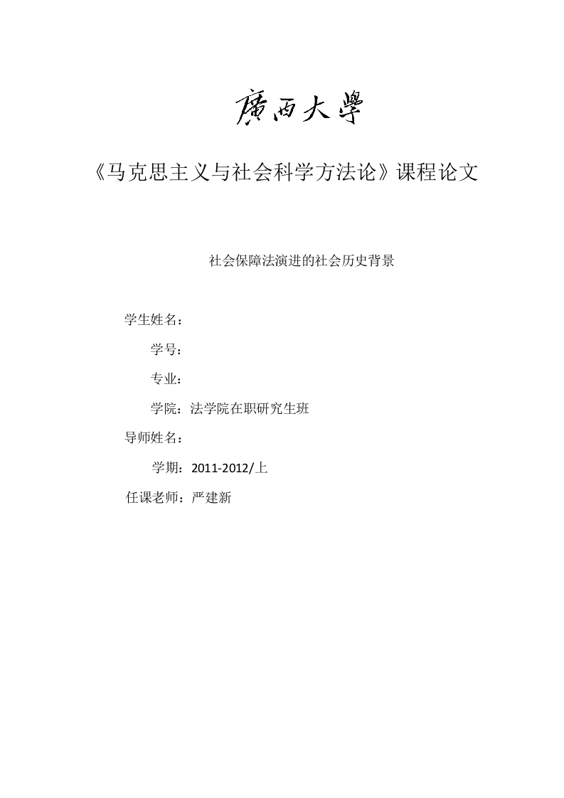 《马克思主义与社会科学方法论》课程论文社会保障法演进的社会历史背景学生姓名:学号:专业:学院:法学院在职研究生班导师姓名:学期:2011-2012/上任课老师:严建新诚信声明我郑重声明:本人提交的《自然辩证法概论》课程论文是由本人独立完成的,在正文中和在文末的参考文献中己全部标注并列出了文中所引用的他人的学术成果、观点、图表或论述,保证此文符合学术道德规范的要求。声明人签名:日期:社会保障法演进的社会历史背景作者姓名摘要:社会保障法的产生和演进,是在一定社会历史背景条件下所形成的产物,有着其深刻的社会历史原因。工业化和社会化大生产是社会保障法产生的经济原因,工人运动的发展和社会主义革命的胜利是社会保障法产生和发展的政治方面的原因,各种的社会理论学说则是社会保障法孕育、萌芽以至实现的思想基础。因此,社会保障法的演进并不是一个偶然的社会现象,如果要对社会保障法的演化有一个更为深刻的认识,就必须从这些社会历史根源入手,寻求到社会保障法产生和发展的内在历史根源。关键词:社会保障法:演进:历史背景前言随着人类社会工业化程度的不断加深,社会保障法作为一种工业化社会所不可获取的制度成果受到世界各国的重视。然而,从社会保障法的形成和发展历程来看,其有着十分深刻的社会历史原因。因此,对于社会保障法演进的社会历史背景进行探析,不仅有利于我们更好地了解和认识社会保障法所产生和发展的社会历史根源,还能对于社会保障法在当地社会的继续成熟和完善有着十分重要的指导和借鉴意义。一、社会保障法产生的经济原因社会保障立法最早出现在欧洲国家,这与这些国家在资本主义发展过程中所迅速发展的工业化进程有着密切的联系。这种联系主要表现在以下几个方面:首先,工业化的发展产生了大量的产业工人,从而导致了劳工问题的出现。从14世纪开始英国就开始了工业化进程,到15世纪末工业化的程度进一步的加深,随着“圈地运动”之后大量的农民涌入到城市成为产业工人,这些人的劳动权益保障也成为一个新的社会问题。到18世纪60年代,英国开始了以纺织业为核心的产业革命,80年代又因蒸汽机的发明和采用,扩及化学、采掘、机器制造等部门,工业化的速度也以前所未有的速度在推进。与此同时,德国、法国、