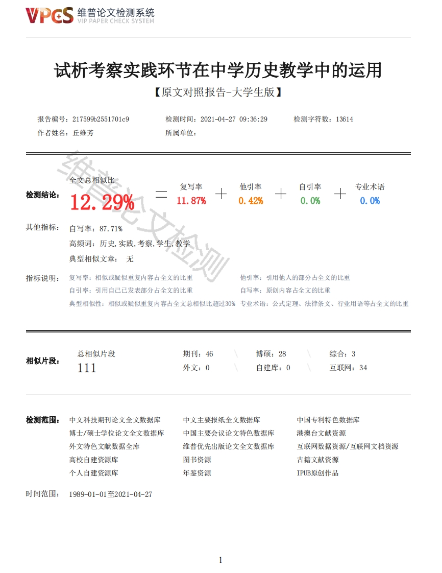 维普论文检测系统/IP PAPER CHECK SYSTEM试析考察实践环节在中学历史教学中的运用【原文对照报告-大学生版】报告编号:21759962551701c9检测时间:2021-04-2709:36:29检测字符数:13614作者姓名:丘维芳所属单位:全文总相似比复写率他引率自引率专业术语检测结论:12.29%11.87%0.42%0.0%0.0%其他指标:自写率:87.71%高频词:历史,实践,考察,学生,教学典型相似文章:无指标说明:复写率:相似或疑似重复内容占全文的比重他引率:引用他人的部分占全文的比重自引率:引用自己已发表部分占全文的比重自写率:原创内容占全文的比重典型相似性:相似或疑似重复内容占全文总相似比超过30%专业术语:公式定理、法律条文、行业用语等占全文的比重总相似片段期刊:46博硕:28综合:3相似片段:111外文:0自建库:0互联网:34检测范围:中文科技期刊论文全文数据库中文主要报纸全文数据库中国专利特色数据库博士/硕士学位论文全文数据库中国主要会议论文特色数据库港澳台文献资源外文特色文献数据全库维普优先出版论文全文数据库互联网数据资源/互联网文档资源高校自建资源库图书资源古籍文献资源个人自建资源库年鉴资源IPUB原创作品时间范围:1989-01-01至2021-04-27维普论文检测系统VIP PAPER CHECK SYSTEM原文对照颜色标注说明:■自写片段■复写片段(相似或疑似重复)口引用片段(引用)■专业术语(公式定理、法律条文、行业用语等)目录一、绪论1(一)选题原因及意义1(二)研究现状1(三)研究思路和方法2二、考察实践的概念及形式2三、考察实践环节在中学历史教学中的运用现状2(一)考察实践受学生和教师青睐3(二)考察实践环节在教学中运用少,教师和学生参与度低5(三)考察实践环节的开展受限于诸多因素7四、教师推动考察实践教学的主要对策8(一)引导学校、家长正确认识考察实践9(二)选择合理的考察实践点9(三)提高教师素养10五、考察实践教学对培养学生历史学科核心素养的作用10(一)构建唯物史观理论10(二)培养时空观念思维11(三)学会史料实证方法12(四)形成历史解释能力13(五)树立家国情怀价值目标14六、结语14参考文献15英文摘要15附录16致谢20试析考察实践环节在中学历史教学中的运用摘要:考察实践是相对于传统课堂理论教学的一种教学方式。中学历史考察实践主要是指学生在教师的带领下,外出对遗迹、遗物等历史实物进行观察、调查、研究的活动。首先,通过调查问卷的形式,分析考察实践环节在中学历史教学中的运用现状。其次,以历史教师的角度,探讨教师应该如何做才能推动考察实践环节能够更好的在中学历史教学中得到运用。最后,结合笔者教学实践,分析考察实践环节运用于中学历史教学时对培养学生历史核心素养的重要影响。关键词:考察实践:中学历史教学:历史核心素养:叶挺独立团一、绪论2维普论文检测系统VIP PAPER CHECK SYSTEM(一)选题原因及意义随着新课程改革的不断深入,中学历史教学越来越强调以学生为主体,实行素质教育,考察实践教学正是体现了这一理念。本文通过分析考察实践环节在中学历史教学中的运用,对考察实践的概念、形式等理论性知识有更深入的理解和认识,以便在今后的历史教学活动中对考察实践教学有更整体的把握。通过向初中学生和历史教师发放问卷,对考察实践环节在中学历史教学中的运用现状有最真实的了解、直观的认识。基于教育调查,探究历史教师助推考察实践环节在中学历史教学活动中发挥其作用应采取的重点对策。新课程标准将三维目标改为五大核心素养,体现历史教育越发重视培养学生的核心素养。运用教学实践案例,说明考察实践对培养学生核心素养的影响。(二)研究现状不少学者对考察实践有深入的研究。在历史考察的概念方面,庄韵勤在《浅议历史考察实践在中学历史教学中的作用及其方式》中提出历史考察的对象是历史遗留下来的遗址、遗迹、遗物[]:焕力的《强化历史专业考察的实践教学特质》指出历史考察指的是人们对历史遗址、遗迹、遗物的观察、调查与研究[2]。在考察实践的形式方面,杨艳在《让综合实践活动在历史教学中绽放别样光彩》中例举了实践活动的形式有辩论讨论、社会走访、搜集资料、考察调研等[3]:高振宇在《综合实践活动课程之“考察探究”:内涵、价值与实施》一文中提出考察探究的方式有野外考察、社会调查、研学旅行等[4:11]。在考察实践对教学的影响方面,姬贵玲在《开发和利用乡土资源进行历史教学的实践反思》分析了实地参观教学可以丰富教学内容,利用乡土资源教学能够调动学生的积极性,也有利于培养学生的家乡情怀和爱国情感[5]。已有研究成果也存在一些不足。首先,对考察实践环节在中学历史教学活动中的运用现状缺乏了解。其次,作为历史教师,应该如何推动考察实践在历史教学中应用的研究也较少。再次,考察实践的作用分析多停留在培养学生的家国情怀方面,对当下的热点问题一一学生的历史学科素养缺乏探讨。(三)研究思路和方法首先,对考察实践下定义,列举考察实践的主要形式,对考察实践有一个总体的理解。其次,结合教育调查说明考察实践环节在中学历史教学中的运用现状。再次,说明历史教师对于考察实践在教学中运用应该采取的对策。最后,结合教学实践分析考察实践对学生历史学科素养的形成的影响。在研究方法上,主要运用文献研