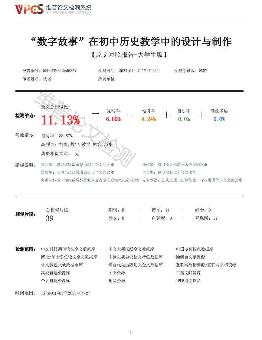 维普论文检测系统/IP PAPER CHECK SYSTEM“数字故事”在初中历史教学中的设计与制作【原文对照报告-大学生版】报告编号:58b9ff6642ed6857检测时间:2021-04-2717:11:22检测字符数:8987作者姓名:佚名所属单位:全文总相似比复写率他引率自引率专业术语检测结论:11.13%6.89%4.24%0.0%0.0%其他指标:自写率:88.87%高频词:故事,数字,教学,内容,历史典型相似文章:无指标说明:复写率:相似或疑似重复内容占全文的比重他引率:引用他人的部分占全文的比重自引率:引用自己已发表部分占全文的比重自写率:原创内容占全文的比重典型相似性:相似或疑似重复内容占全文总相似比超过30%专业术语:公式定理、法律条文、行业用语等占全文的比重总相似片段期刊:8博硕:14综合:0相似片段:39外文:0自建库:0互联网:17检测范围:中文科技期刊论文全文数据库中文主要报纸全文数据库中国专利特色数据库博士/硕士学位论文全文数据库中国主要会议论文特色数据库港澳台文献资源外文特色文献数据全库维普优先出版论文全文数据库互联网数据资源/互联网文档资源高校自建资源库图书资源古籍文献资源个人自建资源库年鉴资源IPUB原创作品时间范围:1989-01-01至2021-04-27维普论文检测系统VIP PAPER CHECK SYSTEM原文对照颜色标注说明:■自写片段■复写片段(相似或疑似重复)引用片段(引用)■专业术语(公式定理、法律条文、行业用语等)长治学院2021届学士学位毕业论文“数字故事”在初中历史教学中的设计与学号:17405303姓名:陈璐玉指导教师:路利娟专业:教育技术学检测系别:电子信息与物理系完成时间:2021年05月学生诚信承诺书本人郑重声明:所呈交的论文《×××X×××××研究》是我个人在导师X××指导下进行的研究工作及取得的研究成果。尽我所知,除了文中特别加以标注和致谢的地方外,论文中不包含其他人已经发表或撰写的研究成果,也不包含为获得长治学院或其他教育机构的学位或证书所使用过的材料。所有合作者对本研究所做的任何贡献均已在论文中作了明确的说明并表示了谢意。签名:日期:论文使用授权说明本人完全了解长治学院有关保留、使用学位论文的规定,即:学校有权保留送交论文的复印件,允许论文被查阅和借阅:学校可以公布论文的全部或部分内容,可以采用影印、缩印或其他复制手段保存论文。签名:日期:目录引言61数字故事61.1数字故事的定义61.2数字故事的特点61.2.1故事性61.2.2教育性71.2.3可视化71.2.4数字化71.3数字故事的分类72数字故事与初中历史教学82.1初中历史教学82.1.1传统教学82维普论文检测系统VIP PAPER CHECK SYSTEM2.1.2新课程标准82.2数字故事在初中历史教学中的优势93数字故事设计93.1数字故事设计与技术方案相关分析93.1.1数字故事的选题93.1.2数字故事的教学设计93.2制作流程113.2.1选题并确定故事的主线113.2.2设计脚本113.2.3搜集素材123.2.4素材处理133.3.5编辑合成134结论….13参考文献15致谢16附录17“数字故事”在初中历史教学中的设计与制作专业:教育技术学姓名:陈璐玉学号:17405303指导教师:路利娟摘要:随着数字化时代的来临以及新课改的不断推进,教育教学的方式和手段都发生了巨大转变。数字故事作为一种数字化的教学辅助手段,符合数字化时代的发展需求,能够激发学习者的学习兴趣,提升学习者的学习效率,被广泛应用于基础课程教学中。而对于初中历史课程而言,由于受传统教育理念和思想的影响,其丰富的故事资源未能充分利用,多数停留于简单讲述,导致其在一定程度上影响了教学效率。那么如何有效整合资源,促进教学效率提升正是历史教师所面临的问题。数字故事能够充分整合相关资源,同时以可视化方式呈现,正是解决此问题的有效途径。因此,本文研究数字故事在初中历史教学中的设计与制作,通过对初中历史课程相关现状、内容以及相关资源进行整合,并将内容以可视化的故事形式进行呈现,为历史教师的以多样化形式呈现教学内容提供新方法,同时促进新课程改革。关键词:数字故事:初中历史教学:情感体验:故事性引言随着计算机网络技术和多媒体技术的迅速发展,数字化时代来临,使得我们的生产、生活和学习等方面都发生了巨大的变化,教育作为国家综合实力提升的基础,国家高度重视教育的发展,使其成为实现教育现代化的突破口。在教育信息化发展的同时,人们越来越重视将多样化的教育教学手段和方法应用到教育中,以使学生得以全面发展。[1]数字故事作为多元化教学的辅助手段,正广泛应用于教学中。同时,历史课程中丰富的历史人物形象,千年不绝的历史脉络构成一个个生动的历史故事,为数字故事构建提供众多素材。但部分故事内容抽象性较强,且呈现方式较为单一,多为口头讲述,部分学生理解存在困难。[2]因此,本文选择设计和制作初中历史课程中的数字故事,以故事形式借助历史的丰富素材,生动形象而又充满感染力地传达教学内容,同时有效整合教学资源,促进教师多样化教学,助力新课程改革。1数字故事1.1数字故事的含义数字故事(Digital Storytel1ing)又称数字化叙述故事,是指利用图片、文本、声音、视频、动画等多媒体元素,同时配合一定表达方法或技巧组成的可视化故事。[3]数字故事最早是黎加厚教授引入国内,他认为数字故事是在教学活动中编写故事,并加入文字、图像、声音、音乐等多媒体元素,创造可视化故事的过程