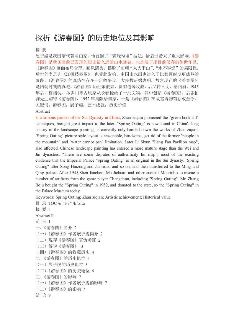 探析《游春图》的历史地位及其影响摘要展子虔是我国隋代著名画家,他首创了“青绿勾填”技法,给后世带来了重大影响。《游春图》是我国目前已发现的历史最久远的山水画卷,也是展子虔目前仅存的传世作品。《游春图》画面布局合理,画风清秀,摆脱了前朝“人大于山”、“水不容泛”的局限性。后世的李思训《江帆楼阁图》,也受此影响。中国山水画也进入了比魏晋时期更成熟的阶段。《游春图》的真伪性存在一定的争议,大多数证据表明,故宫现存的《游春图》是隋朝时期的真迹。《游春图》历经宋微宗、贾似道等收藏,后又转入明、清内府。1945年后,穆蟠忱、马霁川等古玩家从长春抢救了一批文物,其中包括《游春图》。后张伯驹先生购得《游春图》,1952年捐献给国家,于是《游春图》在故宫博物馆存放至今。关键词:游春图:展子虔:艺术成就:历史价值AbstractIs a famous painter of the Sui Dynasty in China,Zhan zigian pioneered the "green hook fill"techniques,brought great impact to the later."Spring Outing"is now found in China's longhistory of the landscape painting,is currently only handed down the works of Zhan ziqian."Spring Outing"picture style layout is reasonable,handsome,get rid of the former "people inthe mountain"and "water cannot pan"limitation.Later Li Sixun "Jiang Fan Pavilion map",also affected.Chinese landscape painting has entered a more mature stage than the Wei andJin dynasties."There are some disputes of authenticity for map",most of the existingevidence that the Imperial Palace "Spring Outing"is an original in the Sui dynasty."SpringOuting"after Song Huizong and Jia sidao and so on,and then transferred to the Ming andQing palace.After 1945,Shen fanchen,Ma Jichuan and other ancient Mourinho to rescue anumber of artifacts from the game player Changchun,including "Spring Outing".Mr.ZhangBoju bought the "Spring Outing"in 1952,and donated to the state,so the "Spring Outing"inthe Palace Museum today.Keywords:Spring Outing;Zhan ziqian;Artistic achievement;Historical value目录TOCo"1-3"hzuAbstractⅡ前言1一、《游春图》简介2(一)《游春图》作者展子虔简介2(二)现存《游春图》真伪考证2(三)解说《游春图》3(四)《游春图》的收藏历史4二、《游春图》的历史地位5(一)展子虔的历史地位5(二)《游春图》的历史地位6三、《游春图》的影响7(一)《游春图》作者展子虔的影响7(二)《游春图》的影响7结论9参考文献10前言隋代画家展子虔的作品《游春图》是我国现存的最早的山水画。[山它既可以让我们直观地感受到一千多年以前,人们的绘画风格,本身它也起到了山水画里承前启后的作用。出于对古代文化的好奇,回溯一千多年以前古人的生活状态,研究它的历史地位及其影响,无疑是一个有意义的课题。同时,《游春图》历经一千多年而流传至今,它本身的意义,早已超出了画作的本身,更是我们中华文化生生不息,历久弥新的重要象征。对这些极有意义的古文物的研究,无疑增强了我们的民族自信心,使中华民族的经典文化,自信地走向整个世界。一、《游春图》简介(一)《游春图》作者展子虔简介隋代画家展子虔是画作《游春图》目前普遍都认同的作者。展子虔,渤海人(今属山东阳信县),生于北周末年,经过北周、北齐、隋三个朝代。2]他在隋文帝年间,被征召入宫,曾在朝重任职帐内都督、朝散大夫等官职。展子虔的绘画题材,涉猎楼阁、人物、山水、道释等。展子虔曾沿着长江、黄河游历,在游历镇江、四川等地时,均在在沿途的寺院中均留下过大量的壁画作品。3]根据相关历史记载,在长安的安灵寺,花云寺及洛阳天女寺,都有过他所做的壁画作品。据《贞观公私画史》、《历代名画记》、《宣和画谱》等古籍记载,展子虔的画作有《长安车马人物图》、《南郊图》、《石勒问道图》、《北极巡海图》等。目前,《游春图》是展子虔唯一现存的画作。(二)现存《游春图》真伪考证当然,和很多历史领域的问题一样,故宫现存的《游春图》作者究竞是不是展子虔,是存在着争议的。有观点认为故宫现存的《游春图》并不是真品,或者说《游春图》根本不存在,这幅画只是后人依照前朝画作仿画的作品。1.质疑《游春图》真实性的说法有观点指出,元代词人周密一次提及了《游春图》是在《云烟过眼录》中,周密提及时曾说过:“展子虔《春游图》,微宗题,一片上凡十余人。[4亦归之张子有。”在第二次提及《游春图》的时候说到:“展子虔《春游图》,今归曹和尚。或以为不真。”曾有相关研究人员经过研究五代王溥的《唐会要》、宋代赵彦卫的《云麓漫钞》、唐代封演的《封氏闻见记》等书籍中幞头的形象,认为,《游春图》中的幞头,高而直立,不分瓣,与隋朝时期的幞头多是“平头小样”的样式不一致。《游春图》中的殿宇正中是屋顶的正殿,它的下檐面阔三间,四柱都有斗拱。每二柱之间的阑额上并没有出现斗拱进行铺作。而上檐却有补间铺作。补间铺作是晚唐才出现的,斗拱形式与晚唐风格一致,也不符合隋朝样式。[⑤)]《游春图》中所绘的殿宇是典型的北宋鸱尾特征的殿宇,因此该画的成画时间不应该是早于北宋。又因为该画与唐代李思训所绘的《江帆楼阁图》使用的是同一个底本,而且展画应比李思训成画的时间更晚,所以《游春图》应当为北宋时期的仿品。所以,这幅《游春图》是幕本,它的作者当然也说不上是展子虔了。2.对质疑《游春图》真实性说法的反驳其实,以上的观点存在着很