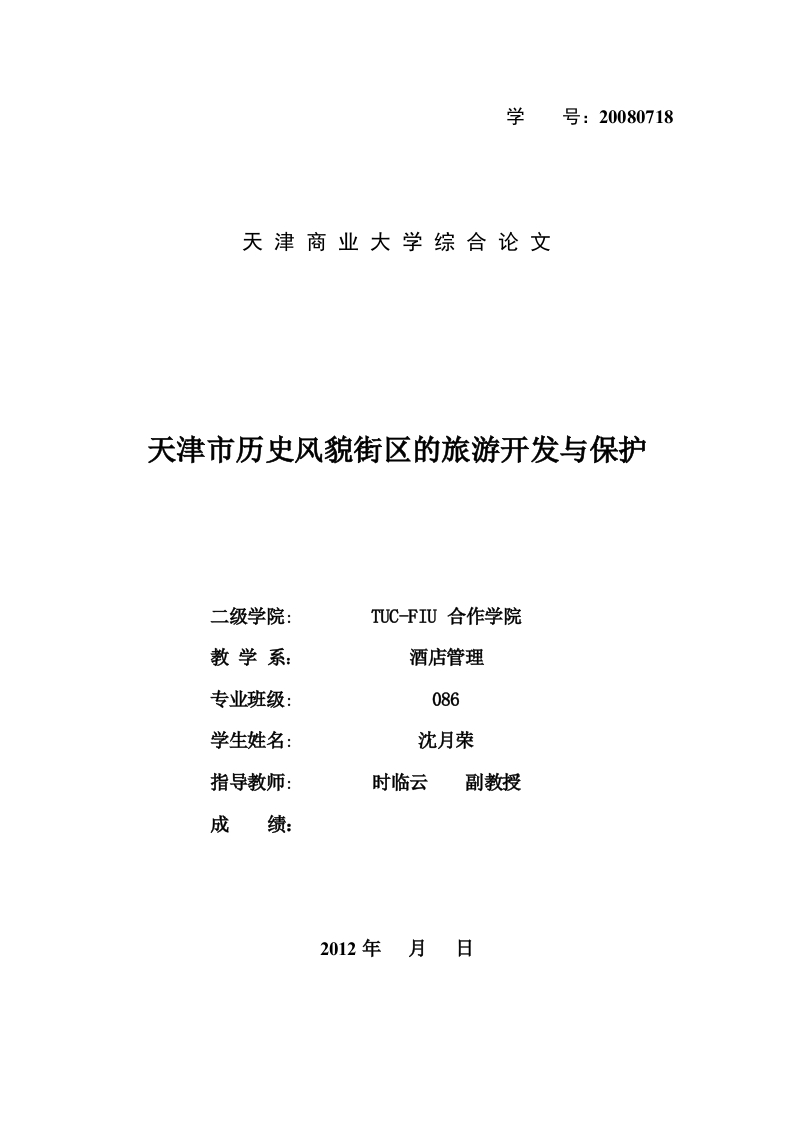 学号:20080718天津商业大学综合论文天津市历史风貌街区的旅游开发与保护二级学院:TUC-FIU合作学院酒店管理专业班级:086学生姓名:沈月荣指导教师:时临云副教授成2012年月日目录引言11开展历史风貌街区旅游的意义11.1助推经济1.2开展思想教育...12.1我国历史风貌街区旅游开发原则..22.2天津历史风貌街区旅游开发原则...33天津历史风貌街区旅游资源开发现状分析43.1天津历史风貌街区旅游资源开发优势..·464.2搞好相关行业配套,提高风貌街区的软硬件设施84.3强化风貌街区的宣传促销,增加科技含量和效用94.4加强监管力度,营造良好的风貌街区环境.·11参考文献12致谢13内容摘要:随着经济的发展,旅游业已成为全球最具活力的产业,而都市文化旅游资源作为旅游业发展的核心,应引起高度重视,其开发与利用的程度直接关系到社会的经济效益。天津历史风貌街区旅游资源丰富多样,开发潜力巨大。近年来随着天津成为京津唐地区的经济中心,其地位突出,所以发展都市旅游对提高天津形象、改善都市环境具有积极的作用。因此,本论文在运用所学知识及技能基础上,收集并整理前人对天津历史风貌街区的旅游开发与保护的经验,主要研究天津历史风貌街区资源特点,分析其开发过程中存在问题,并提出相应的开发建议,对促进天津历史风貌街区旅游资源的开发与保护具有一定的积极作用。关键词:天津:历史风貌街区:开发与保护