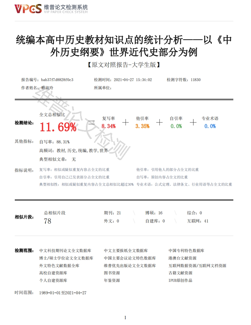 维普论文检测系统VIP PAPER CHECK SYSTEM统编本高中历史教材知识点的统计分析一一以《中外历史纲要》世界近代史部分为例【原文对照报告-大学生版】报告编号:bab37f7d8828f0c3检测时间:2021-04-2715:34:02检测字符数:11830作者姓名:赖淑玲所属单位:全文总相似比复写率他引率自引率专业术语检测结论:11.69%8.34%3.35%0.0%0.0%其他指标:自写率:88.31%高频词:教材,历史,统编,教学,世界典型相似文章:无指标说明:复写率:相似或疑似重复内容占全文的比重他引率:引用他人的部分占全文的比重自引率:引用自己已发表部分占全文的比重自写率:原创内容占全文的比重典型相似性:相似或疑似重复内容占全文总相似比超过30%专业术语:公式定理、法律条文、行业用语等占全文的比重总相似片段期刊:21博硕:16综合:0相似片段:78外文:0自建库:0互联网:41检测范围:中文科技期刊论文全文数据库中文主要报纸全文数据库中国专利特色数据库博士/硕士学位论文全文数据库中国主要会议论文特色数据库港澳台文献资源外文特色文献数据全库维普优先出版论文全文数据库互联网数据资源/互联网文档资源高校自建资源库图书资源古籍文献资源个人自建资源库年鉴资源IPUB原创作品时间范围:1989-01-01至2021-04-27维普论文检测系统VIP PAPER CHECK SYSTEM原文对照颜色标注说明:■自写片段■复写片段(相似或疑似重复)口引用片段(引用)■专业术语(公式定理、法律条文、行业用语等)统编本高中历史教材知识点的统计分析一一以《中外历史纲要》世界近代史部分为例摘要:统编版高中历史教材的投入使用给中学历史教学带来了新的挑战,教材主要呈现的特点是“概念多、内容多和课时少”。用好新教材,教师首先要明晰教材的重点、编写思路、编写体例以及内容变化。针对教材知识点的变化,教师十分有必要根据变化调整教学策略,如更新教学观念,把握新课标的要求,明确教学重点,注重初高中历史的衔接问题等。通过探究统编版教材的编写理念,结构体例、知识点变化等,在一定程度上可以帮助教师在把握课标的前提下了整合教材内容,适应新教材的使用。关键字:统编版高中历史教材:世界近代史:知识点统计;历史教学一、绪论(一)选题的由来与研究意义随着2017年版高中历史课程标准的颁布,以它为指导的高中历史新教材也应时而生。统编版教材重新回到“一纲一本”时代,其内容与体例结构都与之前的教材有较大区别,给一线教师的历史教学提出了新的挑战。最明显的一个特点就是:“两多一少”,即概念多、内容多、课时少。新课标明确指出:“重视以学科大概念为核心,使课程内容结构化,以主题为引领,使课程内容情境化,促进学科核心素养的落实。”但调研显示,大多数教师未能适应这一变化,主要表现在三个方面:一是没有及时更新观念,教学方式老套,没有把握好教学重点:二是未能理解“学科大概念”的涵义,没有把握好结构化内容,各元素缺乏联系的现象显著:三是知识更新不及时,没有重视新观点。由于统编版教材使用的时间比较短,对世界近代史知识点的研究情况比较薄弱,所以十分有必要加强这方面的研究。梳理世界近代史的知识点要注重历史细节和故事的描述,这既呈现出历史事件的完整性,也一定程度可以缓解初高中历史教材衔接的矛盾,改变学生不知其意,死记硬背的学法,使学生对历史学科产生更浓厚的兴趣。进行历史教材知识点的统计分析,有利于教师明确教学任务和重点,着眼于单元的整体设计,强干弱枝、循序渐进进行教学,优化教学环节。同时,通过探究新教材的编写理念、结构体例、内容变化等,有利于透视教育部门对高中历史教学指导思想的变化,有助于贯彻新课改的内容。(二)研究现状综述统编版教材是从2018年秋季才开始试点使用的,关于它的研究也是自2018年才开始的,至今不到三年的时间。目前对统编版教材的研究主要有两类,一类侧重探讨教材的指导思想、基本理念、体例结构等,研究人员主要是编写教材的专家学者和高等院校历史专业的教师。这类理论研究是解读新教材最有价值的辅助资料。另一类则侧重于理论与实践的结合,主要是一线教师的研究成果,将自己的实践教学经验进行总结和反思。1.对统编版教材理论上的研究张海鹏在《统编高中历史教科书的学科体系和学术体系一一适应和掌握统编高中历史教材<中外历史纲要〉(上)的意见》[1]一文中,对新教材进行了全面系统的介绍,并出了一些适应和掌握新教材的意见。叶小兵教授在《统编2维普论文检测系统VIP PAPER CHECK SYSTEM高中历史必修教材的使用建议》[2】讲座中阐述了新教材的主要特点、第一次使用新教材教学将会遇到的困难、如何用新教材完成日常的教学任务、使用新教材时如何培养核心素养等问题。徐蓝在《统编普通高中历史教科书的新气象》[3]一文中对新版教材的编写背景、原则、思路进行了阐述,并指出了新教材突出的七大主题教育。夏文华、李亚南在《历史教学中的史料实证探究一一以统编版历史教材为例》[4幻一文中对新教材史料设置的变化进行了分析,并提出了运用史料进行课堂教学需要注意的几个要点,主要包括如何甄别史料的价值、如何选择合适的史料、如何进行情境设置培养学生史料实证素养等。此外,徐蓝在《<中外历史纲要(下)>世界近代史重点内容解读》[5]一文中,从
