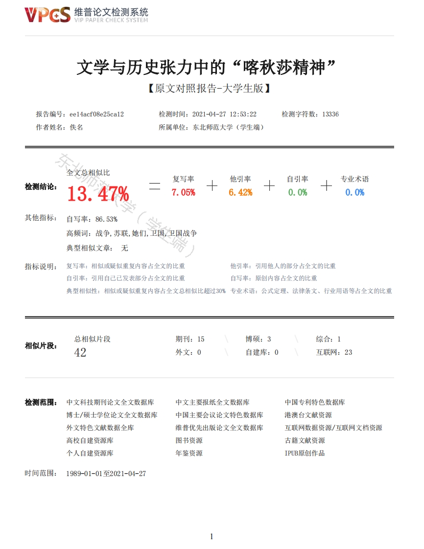 维普论文检测系统VIP PAPER CHECK SYSTEM文学与历史张力中的“喀秋莎精神”【原文对照报告-大学生版】报告编号:ee14acf08e25ca12检测时间:2021-04-2712:53:22检测字符数:13336作者姓名:佚名所属单位:东北师范大学(学生端)全文总相似比复写率他引率自引率专业术语检测结论:13.47%7.05%6.42%0.0%0.0%其他指标:自写率:86.53%高频词:战争,苏联,她们,卫国,卫国战争典型相似文章:无指标说明:复写率:相似或疑似重复内容占全文的比重他引率:引用他人的部分占全文的比重自引率:引用自己已发表部分占全文的比重自写率:原创内容占全文的比重典型相似性:相似或疑似重复内容占全文总相似比超过30%专业术语:公式定理、法律条文、行业用语等占全文的比重总相似片段期刊:15博硕:3综合:1相似片段:42外文:0自建库:0互联网:23检测范围:中文科技期刊论文全文数据库中文主要报纸全文数据库中国专利特色数据库博士/硕士学位论文全文数据库中国主要会议论文特色数据库港澳台文献资源外文特色文献数据全库维普优先出版论文全文数据库互联网数据资源/互联网文档资源高校自建资源库图书资源古籍文献资源个人自建资源库年鉴资源IPUB原创作品时间范围:1989-01-01至2021-04-27维普论文检测系统VIP PAPER CHECK SYSTEM原文对照颜色标注说明:■自写片段■复写片段(相似或疑似重复)口引用片段(引用)■专业术语(公式定理、法律条文、行业用语等)文学与历史张力中的“喀秋莎精神”中文摘要:本文通过文献研究法、对比研究法对瓦西里耶夫《这里的黎明静悄悄》、法捷耶夫《青年近卫军》、M阿列克谢耶夫《不屈的小柳树》中的部分女性形象进行分析,旨在学习她们身上的爱国主义情怀、自我牺牲精神、英雄主义气概和男女合作共纾国难的精神。并且援引其他卫国战争文学作品作为参考资料,从国家和个人两个角度探求“喀秋莎精神”的复杂性,希望读者能够更好地看待苏联卫国战争,共同呼吁和平与爱。关键词:苏联卫国战争:卫国战争文学:女性形象:“喀秋莎”英文摘要:Through the methods of literature research and comparative study,this paper analyzessome female images in Vasiliev's“here is quiet”,fajieev's“young guards”andm.aleksiev's"unyielding willow",aiming to learn their patriotism,self sacrifice,heroism and the spirit of menand women's cooperation to relieve the national crisis.It also cites other literature works of thepatriotic war as reference materials to explore the complexity of "Katyusha spirit"from bothnational and individual perspectives,hoping that readers can have a better view of the SovietPatriotic War and jointly appeal for peace and love.目录1.绪论51.1“喀秋莎精神”的含义51.2以文学作品为依托致敬“喀秋莎”52.“喀秋莎精神”的多重面向62.1前线的坚守62.1.1瓦西里耶夫笔下的金花们62.1.2卫国战争中的女兵贡献72.2后方的支撑82.2.1阿列克谢耶夫笔下扎维多沃村的女性82.2.2大后方妇女在战争中表现92.3沦陷区的抵抗102.3.1法捷耶夫《青年近卫军》中的邬丽亚和刘勃卡102.3.2敌占区的地下情报工作和文艺活动113.“喀秋莎精神”的复杂性113.1个人价值的最高体现一一从国家的角度113.2血淋淋的悲剧色彩一一从个人的角度123.3初探“喀秋莎精神”的复杂性13结语152维普论文检测系统VIP PAPER CHECK SYSTEM参考文献161.绪论1.1“喀秋莎精神”的含义“喀秋莎”有两层含义。其一是指苏联诗人伊萨科夫斯基在卫国战争期间创作的诗歌《喀秋莎》,经过勃朗特尔为其谱曲,这首蕴含着后方姑娘对上战场的心爱之人浓浓思念的歌曲成为了爱与等待的象征。其二是1942年苏联一种新型的火箭炮被士兵称为“喀秋莎”,它成为了卫国战争胜利的重要保障,凝聚了复仇和鲜血。“喀秋莎”成为了卫国战争文学中每一位无惧牺牲、抛洒热血的女性的代名词。的确,20世纪的俄罗斯,伟大的女性用自己的博爱和坚强延续了整个民族的历史记忆。[1]1.2以文学作品为依托致敬“喀秋莎”自苏联卫国战争以来,有大量的文学作品反映了这场伟大的战斗,值得注意的是苏联女性在卫国战争中的非凡表现也被记录了下来。例如瓦西里耶夫《这里的黎明静悄悄》、阿列克谢耶夫《不屈的小柳树》、法捷耶夫《青年近卫军》等。这三部小说分别塑造了前线、大后方、沦陷区三个角度的女性形象,她们身上的爱国主义情怀、自我牺牲精神、英雄主义气概和男女合作共纡国难的精神值得我们学习。然而小说是虚构的产物,无论作者的刻画多么写实,小说中的环境、人物、事件始终蒙上了一层浪漫主义色彩。卫国战争小说的大背景十分宏伟,这些作品依托的是一段值得全人类铭记的历史一一俄罗斯历史上有两次值得铭记与自豪的战争,其中一次便是“苏联伟大卫国战争”。有关苏联卫国战争时期的其他文学作品可以作为背景给予这些女性更加真实生动的参考,:例如孙丽红《苏联卫国战争时期女性贡献探析一一以女性主义史学为视角》、阿列克谢耶维奇《我是女兵,也是女人》、阿拉洛维茨《苏联工业中的妇女劳动》以及新中国妇女社出版的《苏联妇女是我们的榜样》等。其中《苏联卫国战争时期女性贡献探析一以女性主义史学为视角》这本书是以纪实的角度相对真实地展现卫国战争时期女性的非凡表现。而将小说虚构的女性形象和其他文学作品中的苏联女性进行对比,也可以使得我们全面地认识战争对于人类尤其是女性的摧毁。