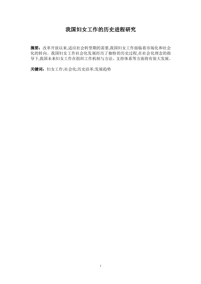 我国妇女工作的历史进程研究摘要:改革开放以来,适应社会转型期的需要,我国妇女工作面临着市场化和社会化的转向。我国妇女工作社会化发展经历了独特的历史过程,在社会化理念的指导下,我国未来妇女工作在组织工作机制与方法、支持体系等方面将有很大发展。关键词:妇女工作;社会化;历史沿革;发展趋势1目录二.妇女工作的发展历史(一)在曲折中求进步的第一个阶段(1949一1977年).(二)在思变中求发展的第二个阶段(1978一1988年)(三)在挑战中求突破的第三个阶段(1989一1999年).2(四)在深化中求创新的第四个阶段(2000年至今).3三.妇女工作的进展.3(一)妇女工作指导思想的确立(二)妇女工作工作方法的确立…4(三)妇女工作的活动创新4(四)妇女工作的工作机制的建立..........(五)妇女工作中心任务的明确…5(六)妇女工作工作重点的确定…5(七)妇女工作工作领域的扩大5(八)妇女工作社会化格局的形成四.妇女工作社会化的发展趋势5(一)妇女工作向立体化、网络化方面发展6(二)妇女工作机制向社会化方面发展(三)妇女工作方法向项目化、市场化方面发展(四)妇女工作支持体系向广覆盖方面发展五.结束语参考文献…72作为中国拥有最广泛的群众基础、最完整的组织机构、最大影响也最有权威的妇女组织,妇联自身的工作机制与发展,无论是过去、今天还是将来,都影响着中国妇女的发展进程。全国妇联也清醒地认识到,新时期在坚持党的领导的同时,必须以实事求是的态度重新审视自己的工作机制,在自身的战略指导思想、工作重点、工作方式及工作领域等方面进行重大转变,全面增强市场意识、改革意识、危机意识、机遇意识,积极迈出改革步伐,推动自身工作的群众化、市场化、服务化和社会化,以适应新的形势与挑战。二.妇女工作的发展历史60年来,妇女发展工作与时代同行,与共和国发展同步,充满了探索的艰辛,饱含着丰收的喜悦,开创了统筹协调、创新发展的新局面。(一)在曲折中求进步的第一个阶段(1949一1977年)1949年3月,自中国妇女第一次全国代表大会召开后,各级妇联就以发动和组织妇女参加生产为妇女工作的中心任务。广大妇女积极加入各行各业,参加社会劳动的规模不断扩大,一些过去妇女从未涉足的部门也有了女职工。在城市,妇联组织协助做好女工和职工家属的工作,动员她们积极参加爱国增产节约运动,学习先进技术,提高劳动生产率。在农村,教育和组织妇女积极参加农副业生产,鼓励在自愿原则下参加互助合作运动,农村妇女走上了合作化的道路。无论是在抗美援朝还是在对生产资料进行社会主义改造,完成国家三个五年建设计划的进程中,中国妇女都发挥了半边天的作用,特别是在1957年9月第三次中国妇女代表大会以来,贯彻当时中共中央提出的两勤方针(勤俭建国、勤俭持家),妇女发挥了不可替代的作用,为开源节流作出了特殊贡献。1958年“大跃进”、人民公社化运动中,妇女运动也受到了高指标、浮夸风和“共产风”的影响。60年代初,贯彻国民经济调整的方针,妇联改变了搞运动式的工作方法,恢复了密切联系群众、深入细致的传统,深入调查研究,及时向中央有关部门报告,呼吁在妇女参加劳动时要注意妇女的生理特点,制定了妇女“四期”(经期、孕期、产期、哺乳期)保护措施,为进一步解放妇女劳动力创造了条件。“文化大革命”中,广大妇女在社会主义革命和建设中的贡献遭到全盘否定,妇联工作被迫停止,农村妇女的自留地、自留畜、自留树都被当作“资本主义尾巴”强行收归集体,农村妇女从事的传统手工编织、刺绣等被迫废弃,女职工的劳动保护被取消,身心健康受到严重损害。可以说,这一阶段,是妇女工作充满希望、又历经挫折的一个阶段,是妇联组织在曲折中奋起、在探索中进步的一个阶段,是广大妇女走出家门、走向社会,得到社会广泛认同并为社会所接受的一个阶段。(二)在思变中求发展的第二个阶段(1978一1988年)1978年,党的十一届三中全会开启了改革开放的历史新时期。妇联组织和广大妇联干部冲破了思想的藩篱,开始思索如何在改革中实现妇女发展的迫切问题。中国妇女四大提出了“四个现代化需要妇女,妇女需要四个现代化”的号召,妇女五大进一步明确了带领城乡妇女参与两个文明建设、维护妇女儿童权益的工作重点。