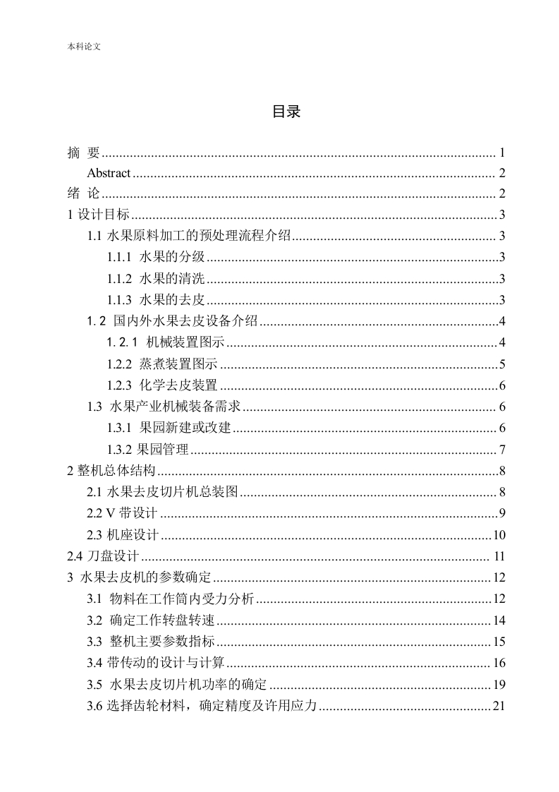 本科论文目录Abstract...........2绪论21设计目标…31.1水果原料加工的预处理流程介绍31.1.1水果的分级1.1.2水果的清洗31.1.3水果的去皮1.2国内外水果去皮设备介绍1.2.1机械装置图示.…1.2.2蒸煮装置图示51.2.3化学去皮装置.61.3水果产业机械装备需求61.3.1果园新建或改建62整机总体结构2.1水果去皮切片机总装图2.2V带设计92.3机座设计….102.4刀盘设计113水果去皮机的参数确定…123.1物料在工作筒内受力分析3.2确定工作转盘转速143.3整机主要参数指标153.4带传动的设计与计算.…163.5水果去皮切片机功率的确定193.6选择齿轮材料,确定精度及许用应力21本科论文4水果去皮切片机的结构设计.…264.1瓜果去皮机的设计及其特点…264.1.1工艺流程及结构特点4.2摩擦式瓜果去皮机基本结构284.2.1工作的圆筒.284.2.2工作的转盘284.2.3传动的系统294.2.4其它294.3工作原理29结论.参考文献…32致谢34本科论文摘要此课题的源泉是当今社会水果去皮切片机设备在食品加工工业中的创新与更新替换的基础之上,设计水果去皮切片机中经过一些创新要素,近而满足如今社会水果去皮机设备的一些不足之处。随着当今世界水果蔬菜生产的迅速发展,我国对果蔬行业的需求也日益增大,相对于目前水果的生产,中国水果加工产业整体的水平能力还是不行,在发展上还存在一定明显弱势。有些水果的去皮,加工是很多的加工企业必不可少的流程,就目前而言大量的设备还停留在手动去皮的方式,需要人工手动去摇动手柄,通过双手将水果逐个弄到固定针上面,这样做不但工作的效率很低,而且还费时又费力,劳动的强度增加不少,最严重的还容易存在工伤事故。随着水果产业的发展和我国社会和经济商业的进步,如何去寻找一种高质量、高功效、且节能又环保的还能降低劳动率与发生事故率的新一代水果去皮的方法很快成为水果加工的任务中迫切需要赶紧解决的现实问题。此篇文章重点介绍了以摩擦为原理的基本、适用于水果加工的部门和某些工厂等等其他场所都使用的大中型水果去皮切片机的设计要点、工作的原理和设备的组成方法。这篇文章合理的用了上学所学的知识,开始从水果去皮切片机的方案入手,经过查找许多资料,确定了本次设计的具体方案,其次再对切片机的传动系统和执行系统再设计。对这里常用标准件比如轴承和轴,链传动等等机构进行选型再次设计,结尾进行每个主要的零件进行强度核对。关键词:去皮设备;水果;摩擦原理