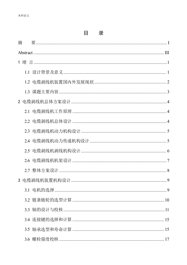 本科论文目录摘要Abstract.1绪言1.1设计背景及意义.…1.2电缆剥线机装置国内外发展现状.21.3课题主要内容.…32电缆剥线机总体方案设计2.1电缆剥线机工作原理2.2电缆剥线机总体设计.23电缆剥线机动力机构设计…52.4电缆剥线机动力传递机构设计2.5电缆剥线机剥线机构设计62.6电缆剥线机机架设计.2.7整体方案设计.…83电缆剥线机装置机构设计.…3.1电机的选择…3.2链条链轮的选型计算103.3轴的设计与校核…3.4连接键的选择和计算3.5轴承选型和寿命计算.153.6螺栓强度校核17本科论文4电缆剥皮机三维模型设计.204.1 SolidWorks简介.204.2本装置的建模204.3机构的装配235结论与展望.…272728参考文献.29致谢本科论文摘要21世纪后,国民经济得到高速发展,电缆也成为人们生活中不可或缺的一种通讯工具,因此电缆的需求也随之增加,从而也有效推动了生活服务行业的进步与发展,占据着较大比例的国民经济,己经逐步转变成为支柱产业。随着生产实际需求的日益增长,与之相关的生活服务机械工业也得到迅猛的发展。人民日益富裕,可支配的金额逐渐增加,对电子通讯的需求量也在不断增加,因此电缆需求量也大大增加,从而催生了生活服务业设备的研发制造,需要相关机械设备具有更多的功能,能够满足各种不同的生产需求。同时相关机械设备的操作流程日益趋向简单结构化,易于生产加工制造,操作人员易于使用维护,需要结合经济适用性原则进行设计制造。本文设计针对电缆剥线机装置设备进行设计,对其主要机构结构进行设计确定,并对机构的主要参数进行设计计算。本文基于机械设计的相关方法和有关理论知识设计制造了电缆剥线机装置,收集汇总了现阶段己有电缆剥线机装置的相关研究文献资料,并对相关内容进行研究和分析。结合现有的各项新型技术,基于实际使用需要和基本参数设计制造了电缆剥线机装置。本文深入研究电缆剥线机装置应用背景和发展情况,通过学习和查阅相关学习资料和文献,了解了电缆剥线机装置结构特点和传动原理等专业知识,充分运用所学机械设计相关知识,设计一个能够保证工作质量、缩短工作流程、结构紧凑合理,传动高效的电缆剥线机装置。设计的电缆剥线机装置主要由电缆剥线机动力机构、电缆剥线机动力传递机构、电缆剥线机剥线机构和电缆剥线机机架组成。经过多次试运行和试验,本文设计的电缆剥线机装置能够实现高效率电缆剥皮,进而提高工作效果和工作质量。同时对电机装置、链传动、轴承以及轴进行选型设计,确保设计制造的设备能够较好的满足实际工况。在设计完成整个设备之后,借助计算机二维软件绘制本文设计制造的电缆剥线机装置设备装配图和零件图,借助三维软件建模,对设备各个机构的运行状态进行检查,确保各个机构的运动作业过程不会发生相互干涉影响。