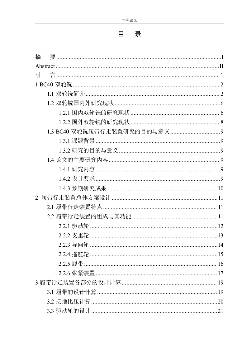 本科论文目录摘要Abstract.…引言1BC40双轮铣21.1双轮铣简介…21.2双轮铣国内外研究现状.61.2.1国内双轮铣的研究现状1.2.2国外双轮铣的研究现状1.3BC40双轮铣履带行走装置研究的目的与意义1.3.1课题背景1.3.2研究的目的与意义1.4论文的主要研究内容1.4.1研究内容91.4.2设计要求1.4.3预期研究成果102履带行走装置总体方案设计112.1履带行走装置特点112.2履带行走装置的组成与其功能2.2.1驱动轮…2.2.2支重轮2.2.3导向轮2.2.4拖链轮.…152.2.5履带.…162.2.6张紧装置173履带行走装置各部分的设计计算193.1履带的设计计算.193.2接地比压计算…203.3驱动轮的设计..…本科论文3.4支重轮的设计…253.6牵引力性能计算.283.7缓冲弹簧的设计…4履带行走装置的三维和运动方式.354.1履带行走装置的三维分析354.2履带行走装置行走方式的分析36结论38参考文献39致40本科论文摘要近些年来,由于城市化的进程不断推进,对于地下资源的开发越来越多。双轮铣槽机作为一种高效的对地下连续墙施工的机械设备。它对各种地层的适应程度非常好。通过安装种类不一样的铣刀轮和铣齿,可以实现对各种地层的施工。双轮铣槽机是一种高效的地下连续墙施工设备,市场需求量非常大。履带行走装置的设计是为了使双轮铣在复杂的工况下能够适应泥泞的路面,克服崎岖的行走路面。机械设备可以通过行走装置与路面的摩擦力停靠在具有一定坡度的路面上。本文设计了履带行走装置的整体方案,又对驱动轮、导向轮、支重轮和履带板进行了详细设计,对一些主要部件进行了设计计算。关键词:双轮铣:履带底盘;稳定性;结构设计
